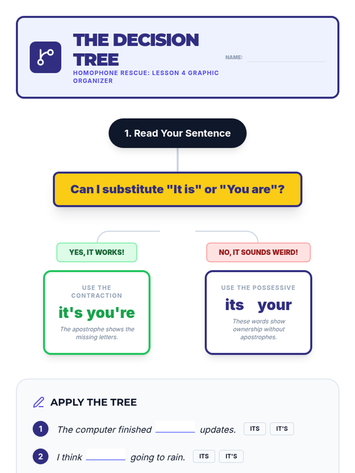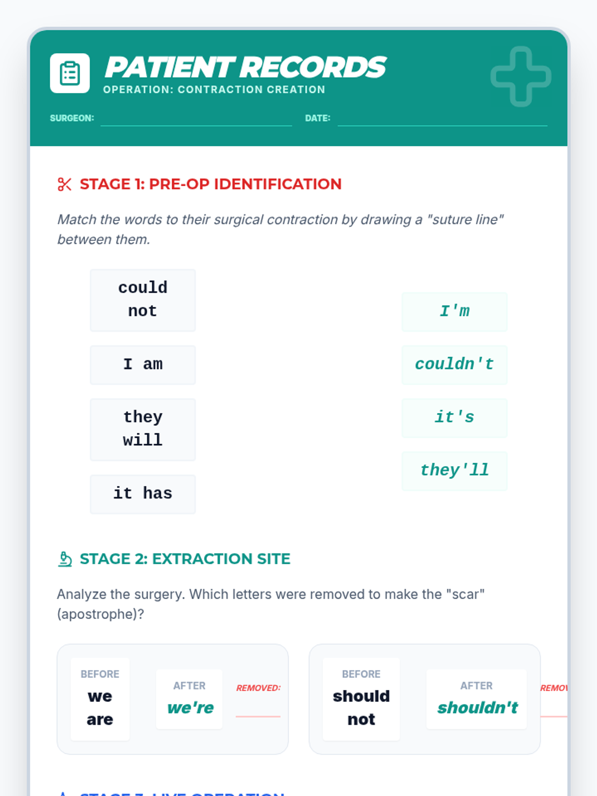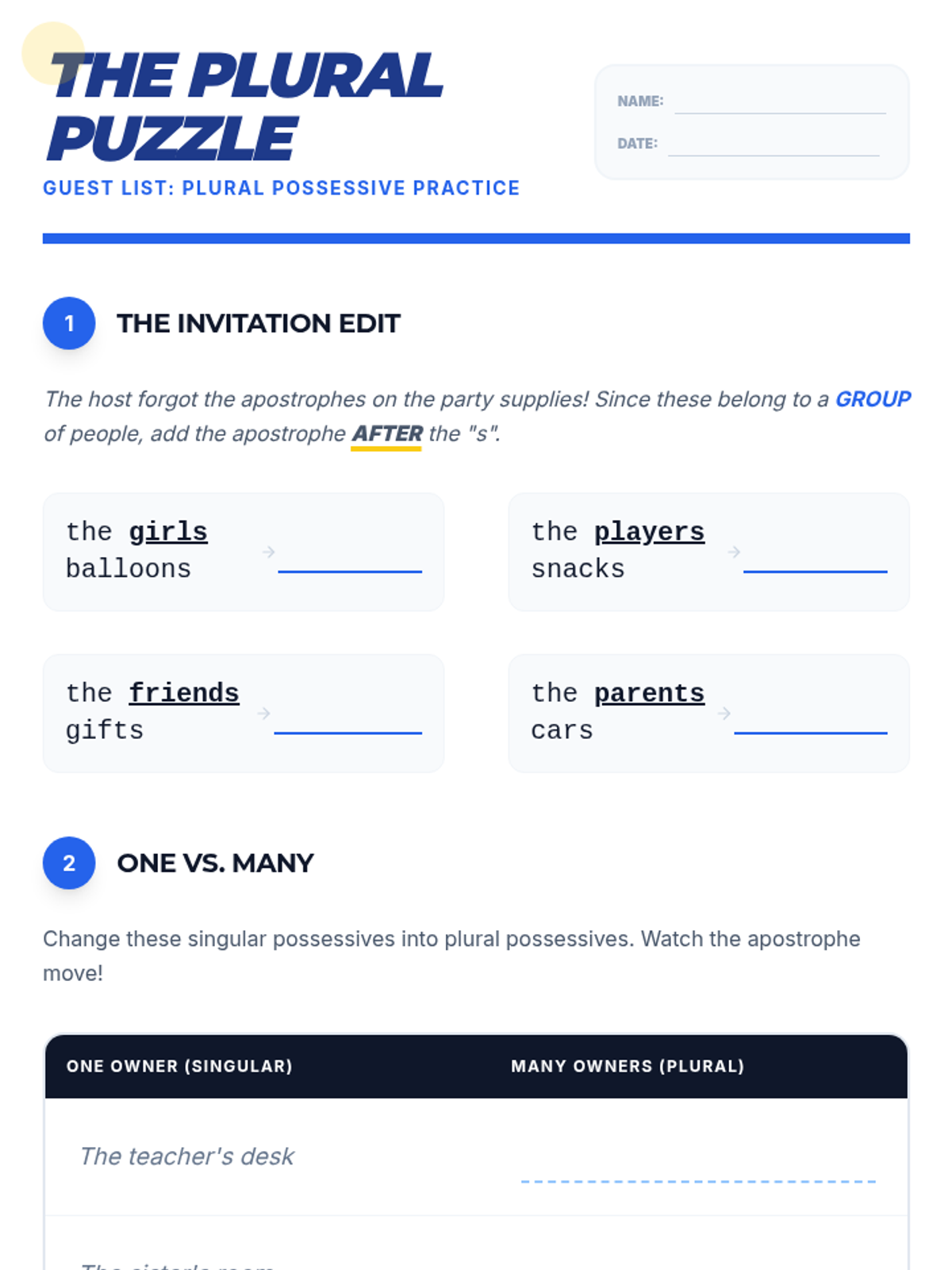 An inquiry-based exploration of apostrophes, covering singular and plural possessives, contractions, and tricky homophones through the lens of 'word surgery' and 'punctuation investigations.'
