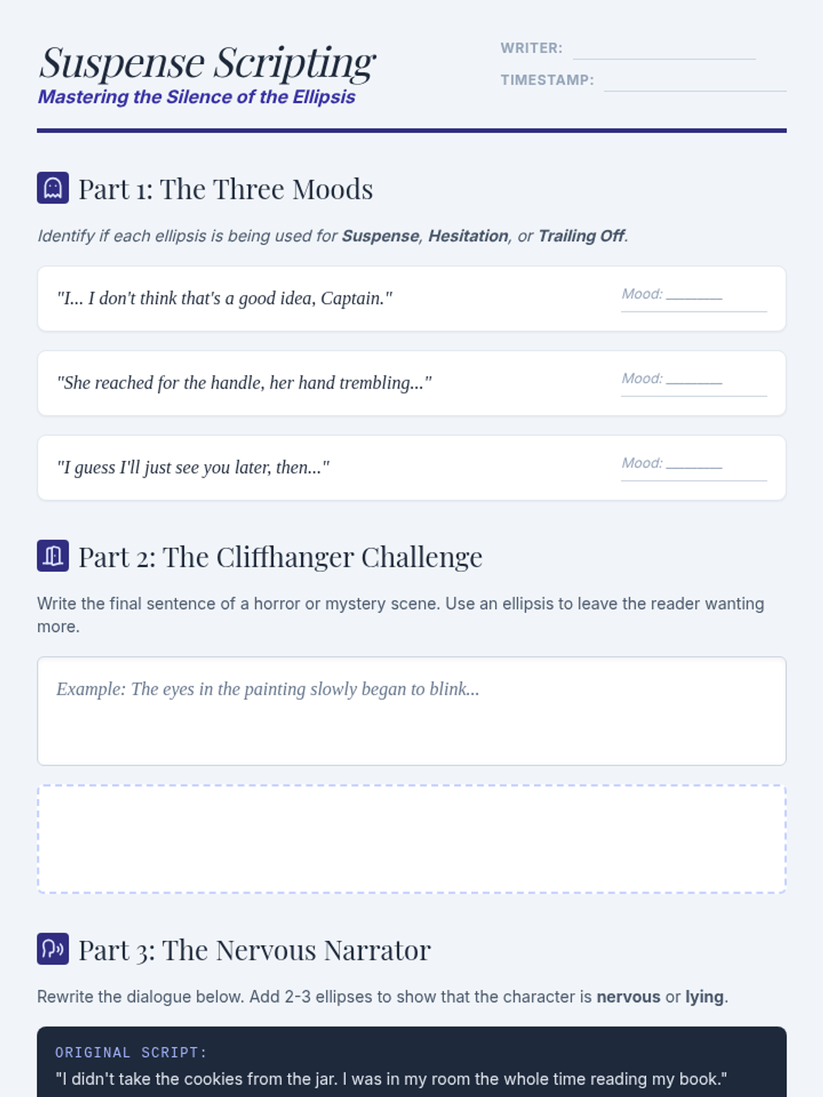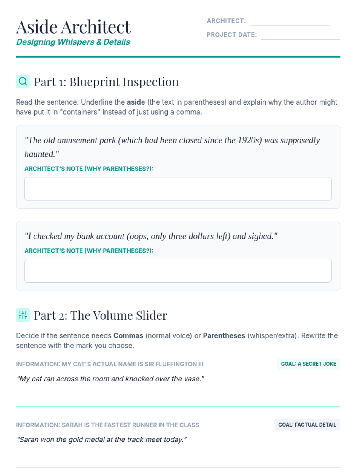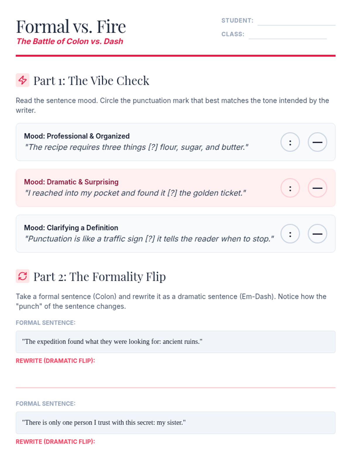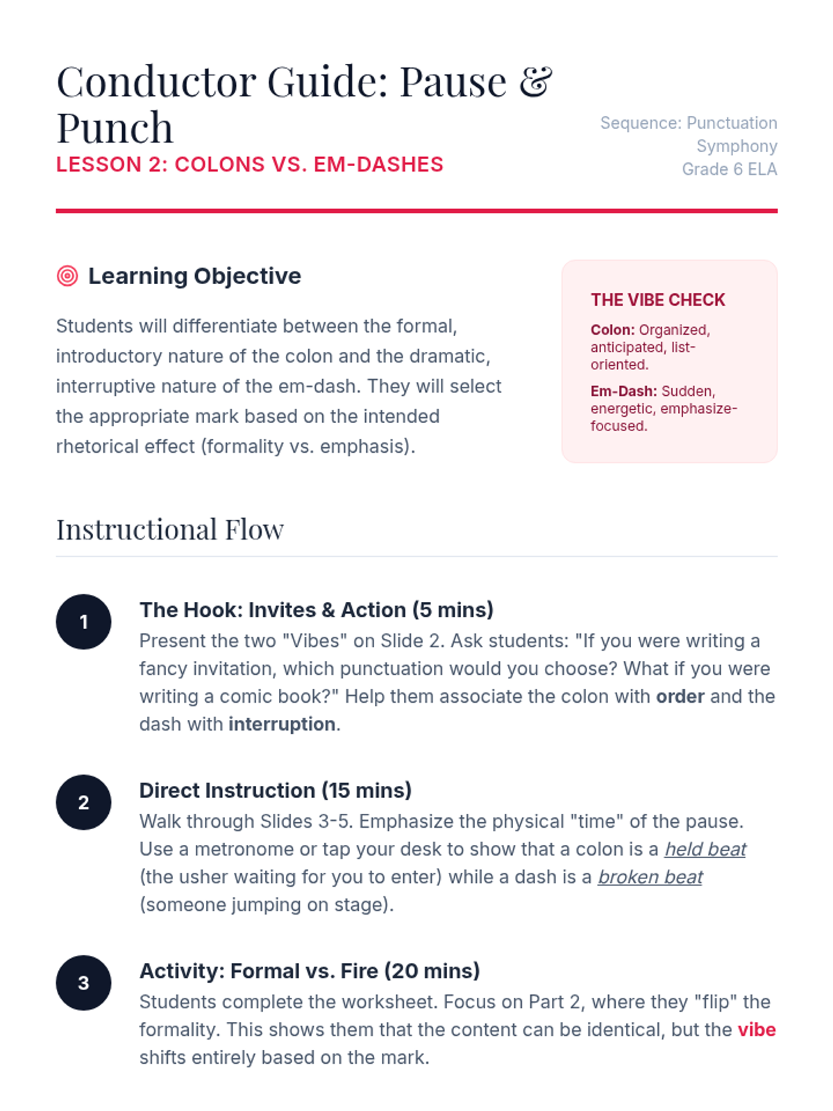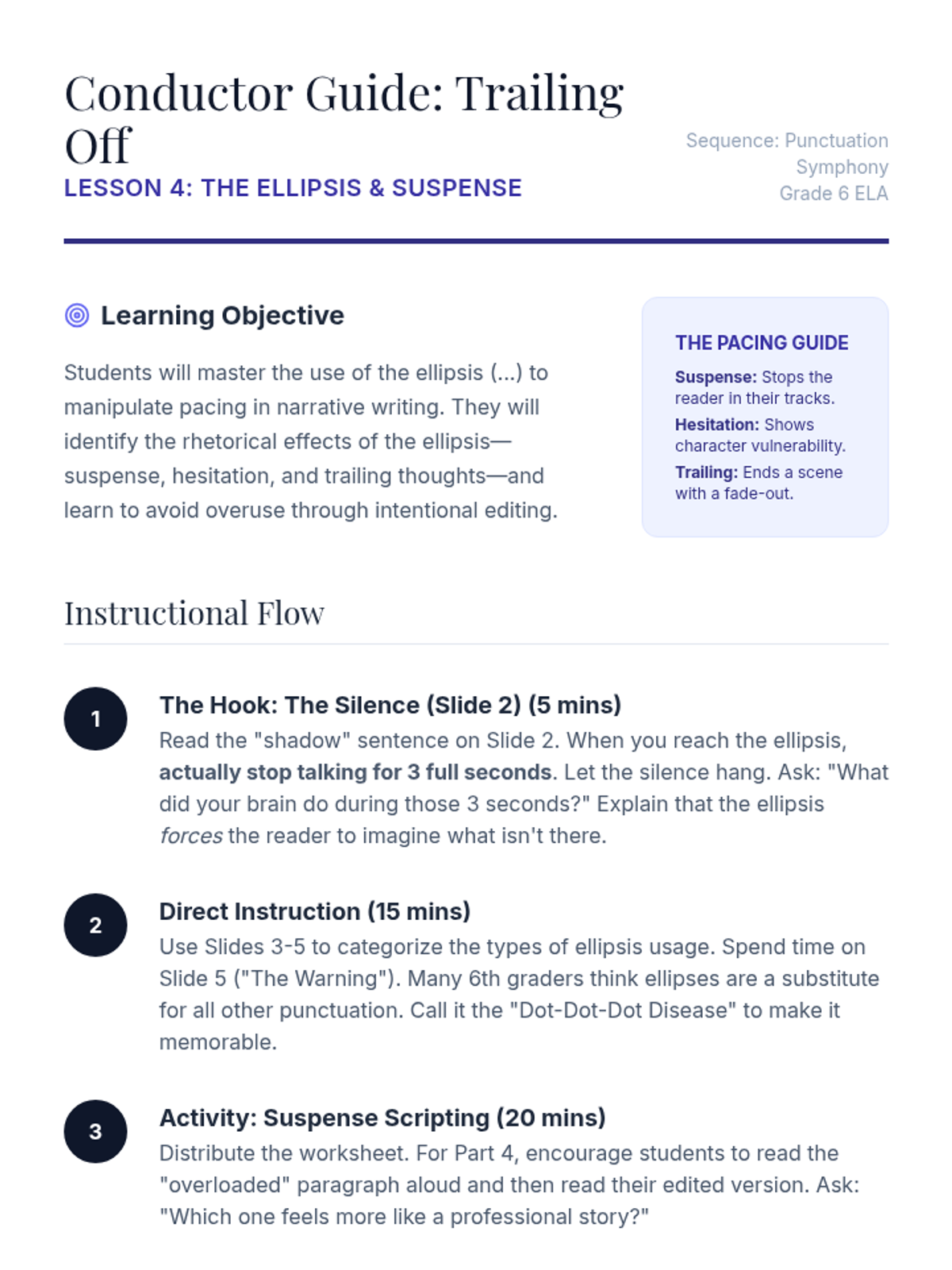 This advanced 6th-grade sequence treats punctuation as a rhetorical tool for voice, tone, and pacing. Students explore how dashes, ellipses, parentheses, and end marks act as 'musical notation' for the written word, moving beyond basic grammar to expressive writing.