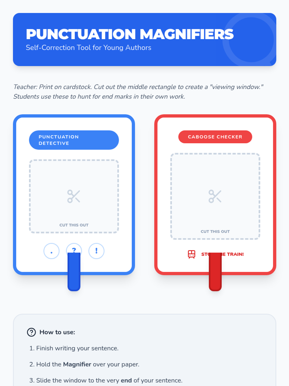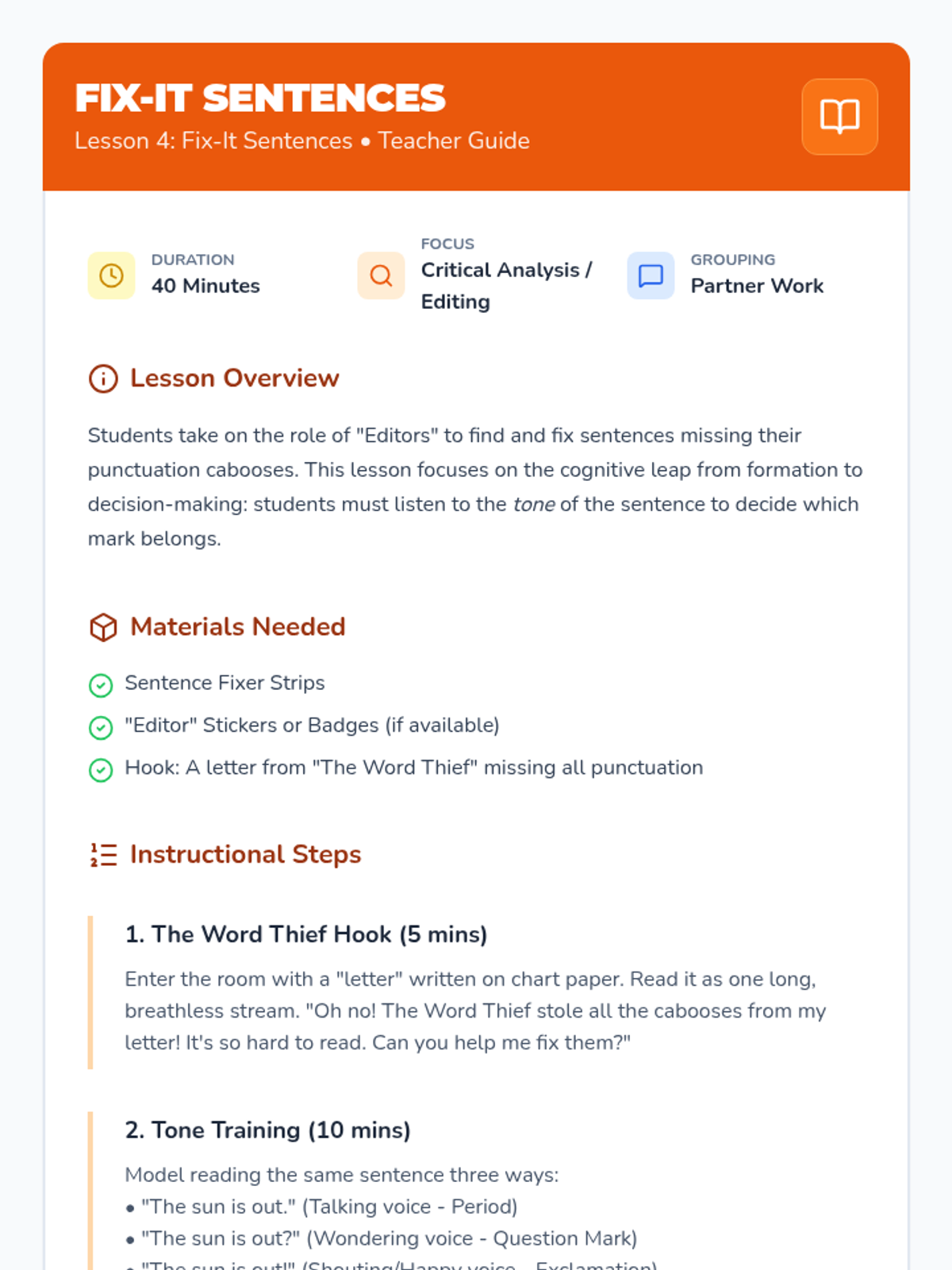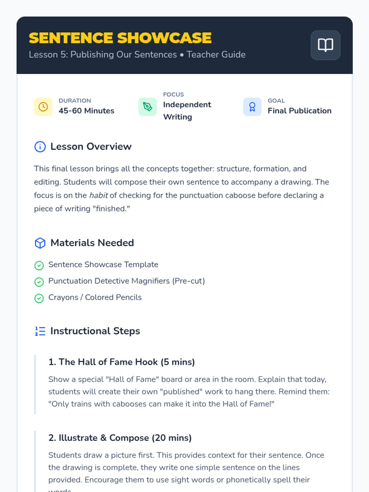 A Kindergarten ELA sequence that introduces punctuation through a 'Sentence Train' metaphor, focusing on the concept that every sentence needs a 'caboose' (end mark) to be complete. Students move from identifying marks to applying them in their own writing and editing.