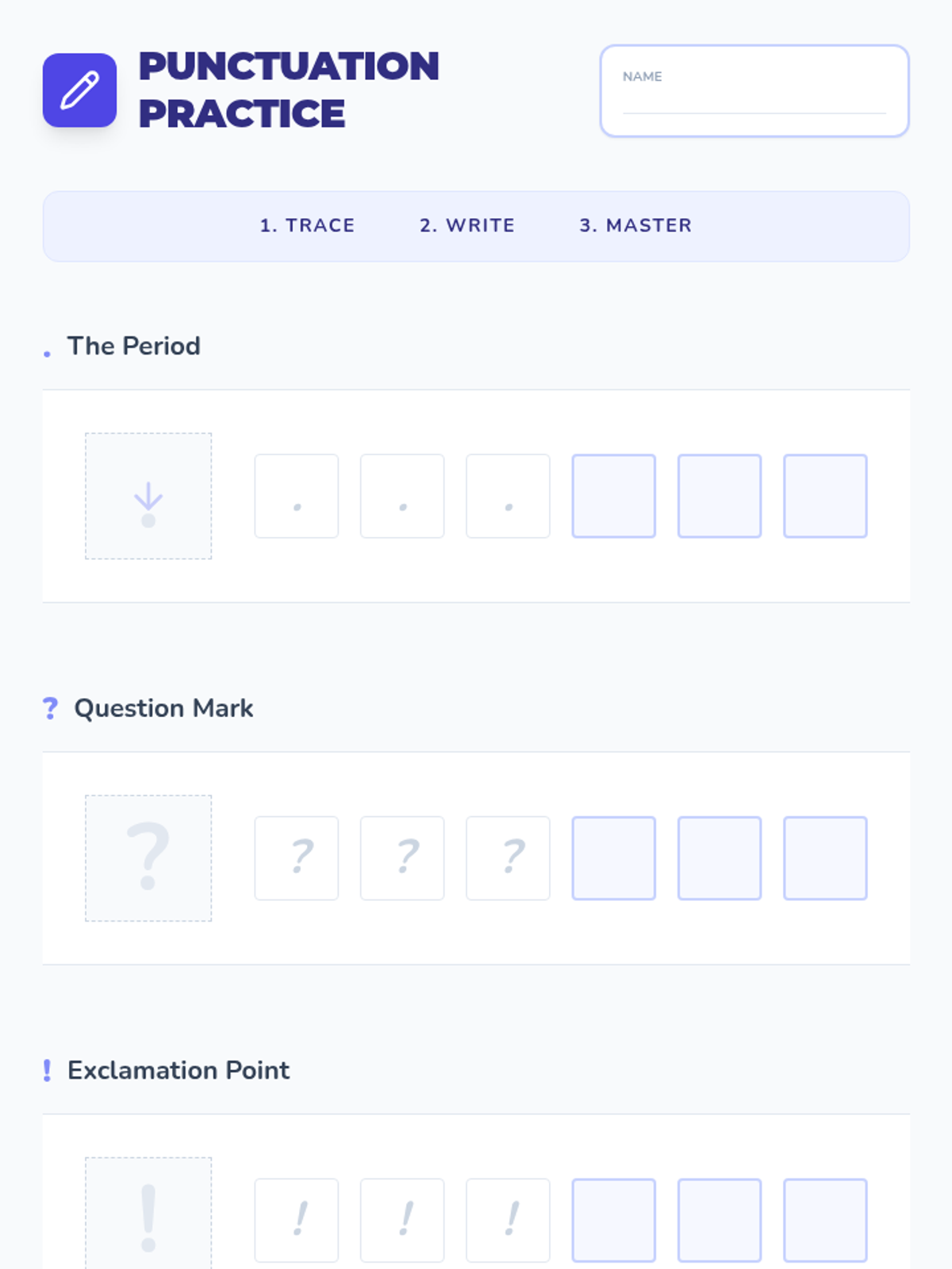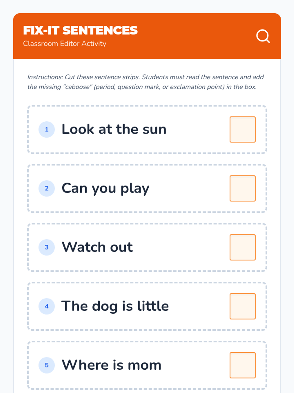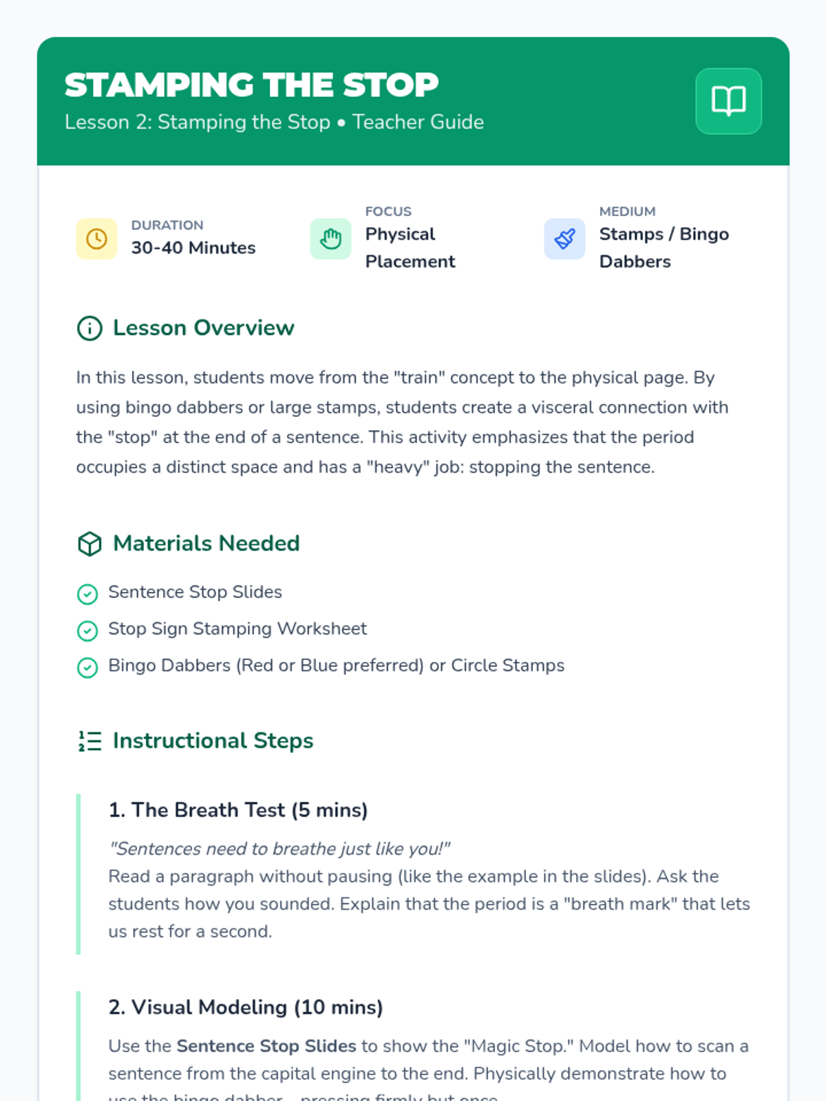 A Kindergarten ELA sequence that introduces punctuation through a 'Sentence Train' metaphor, focusing on the concept that every sentence needs a 'caboose' (end mark) to be complete. Students move from identifying marks to applying them in their own writing and editing.