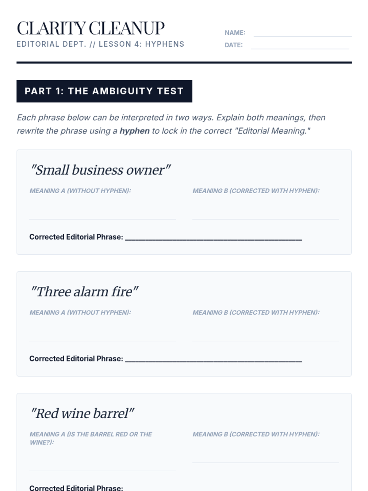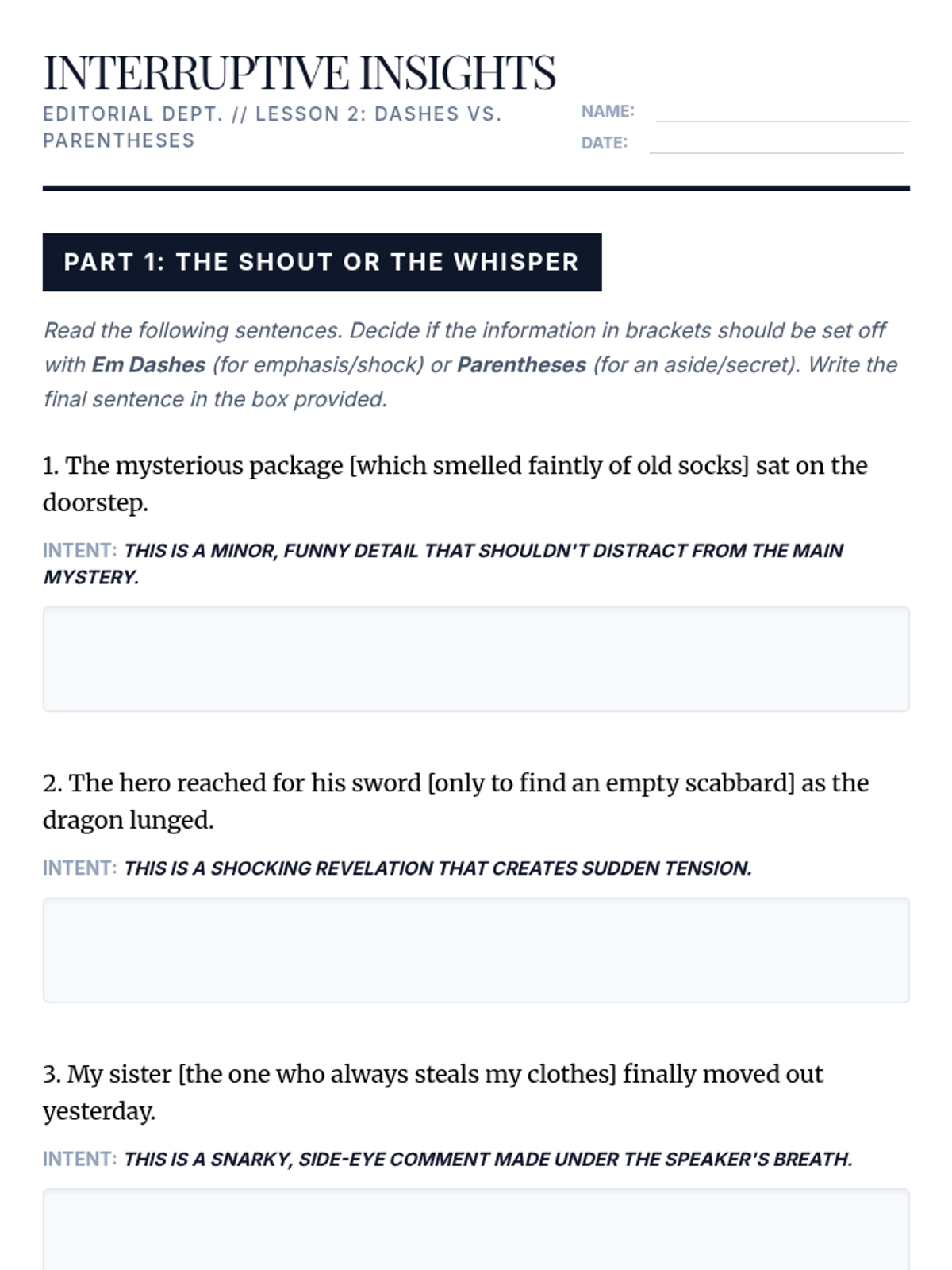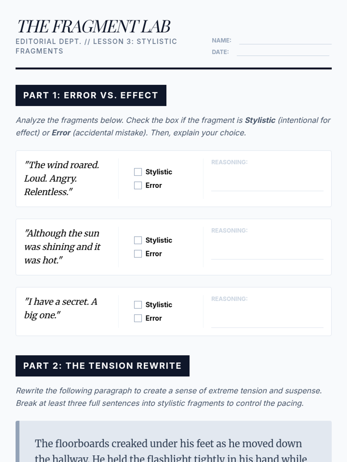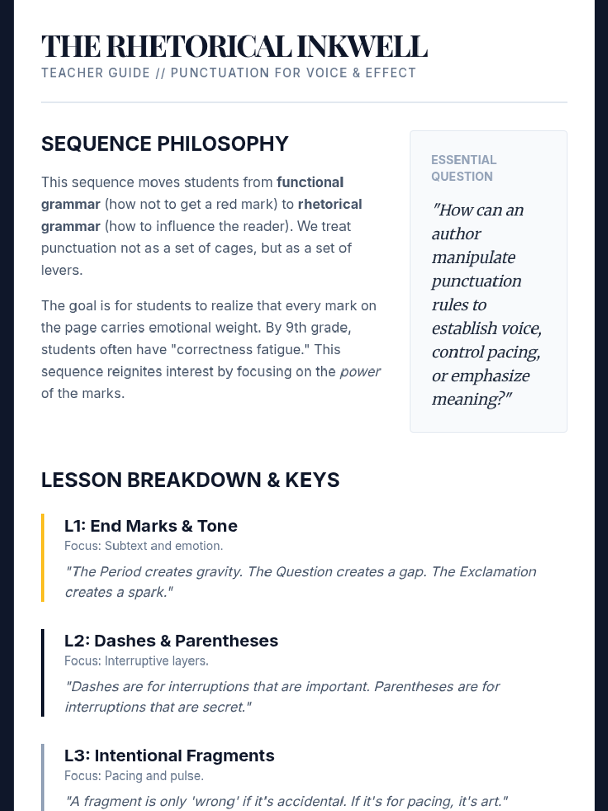 A 9th-grade grammar sequence focused on the rhetorical use of punctuation. Students move beyond basic rules to explore how end marks, dashes, fragments, and hyphens shape voice, tone, and clarity in writing.