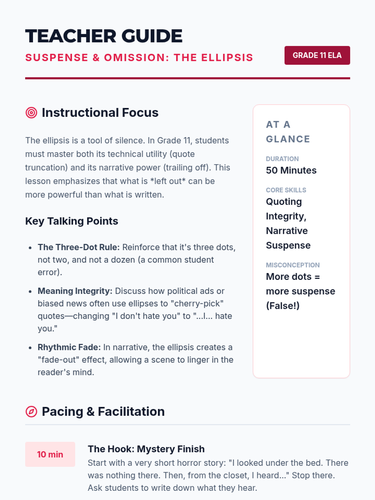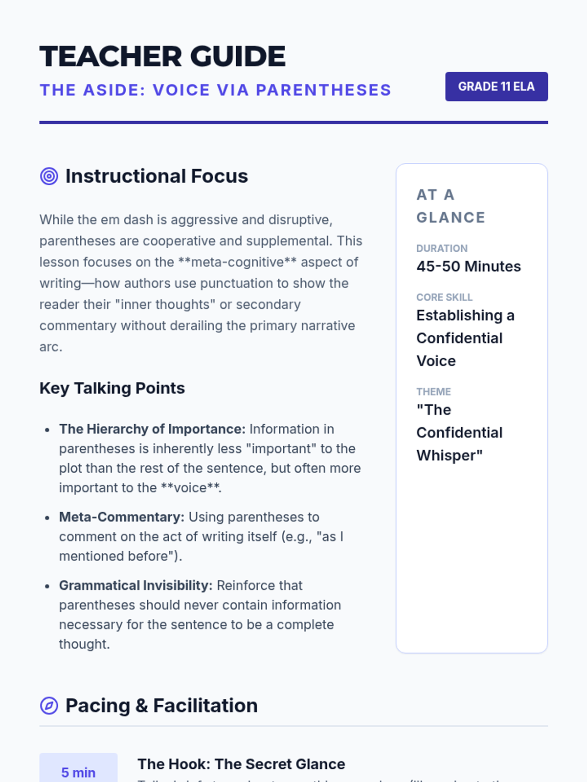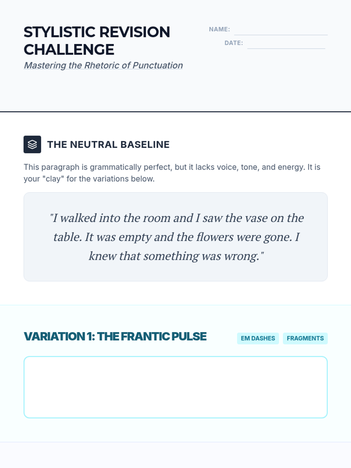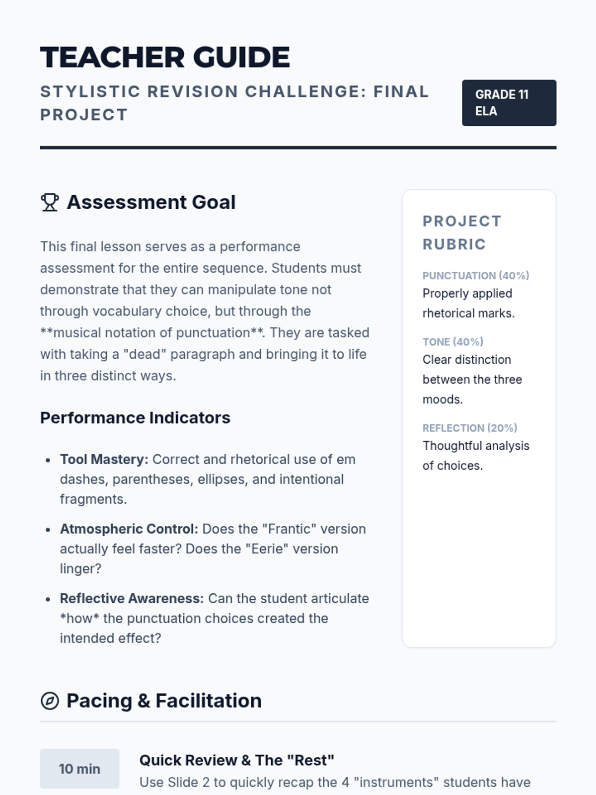 An 11th-grade ELA sequence exploring punctuation as a rhetorical tool for voice, tone, and rhythm. Students analyze em dashes, parentheses, ellipses, and intentional fragments in literature and creative nonfiction to understand how they function as musical notation for the written word.