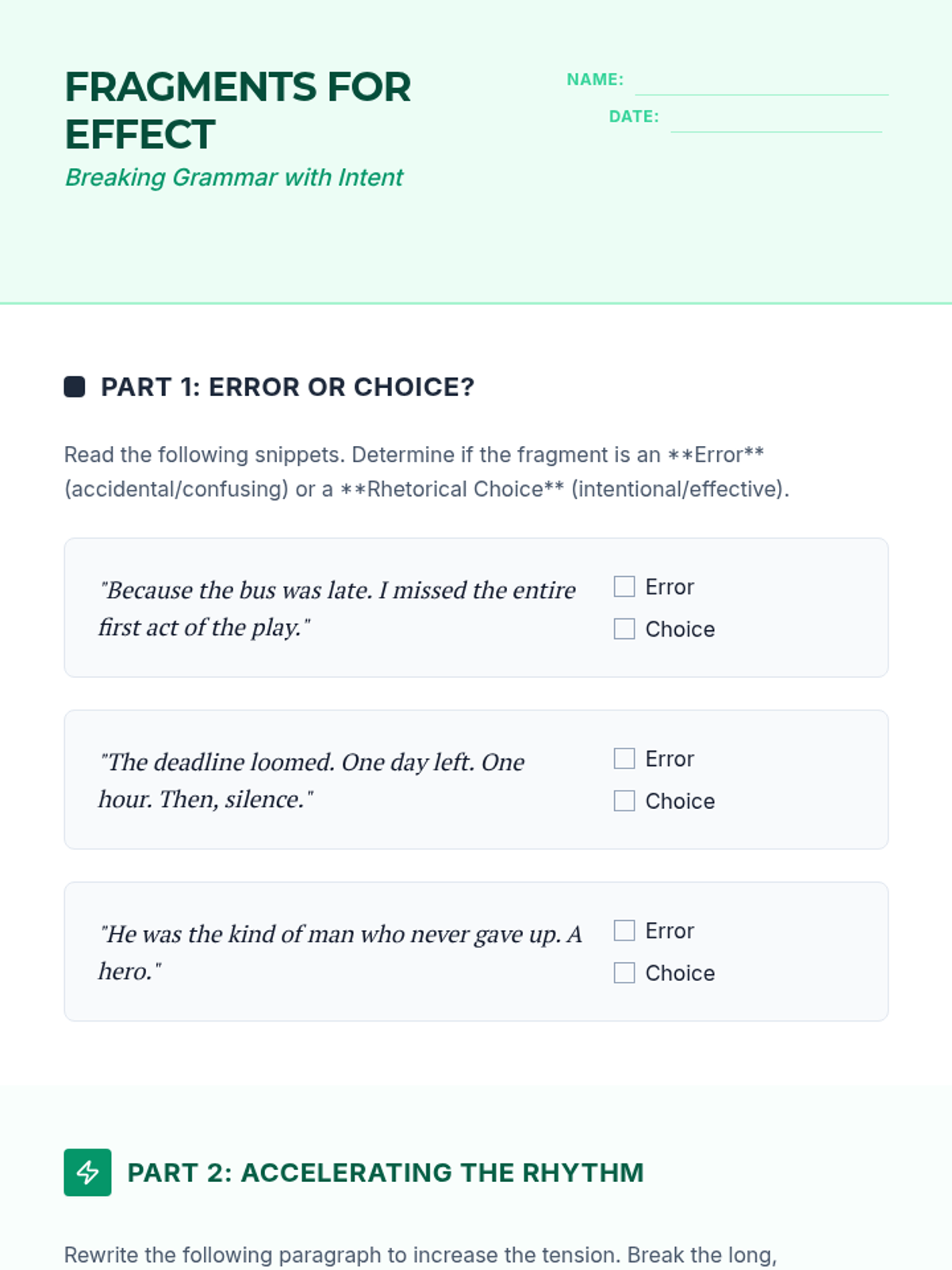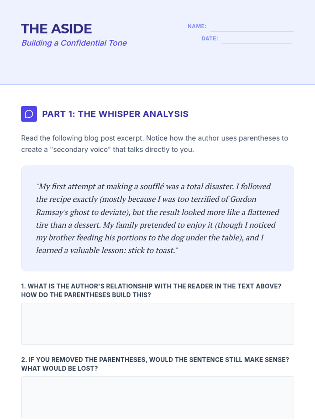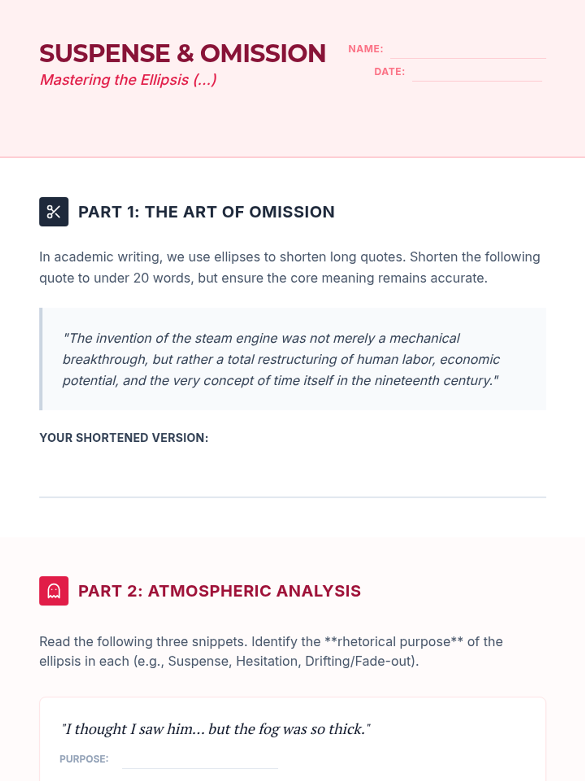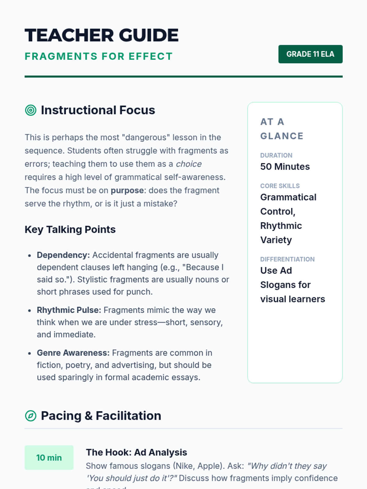 An 11th-grade ELA sequence exploring punctuation as a rhetorical tool for voice, tone, and rhythm. Students analyze em dashes, parentheses, ellipses, and intentional fragments in literature and creative nonfiction to understand how they function as musical notation for the written word.