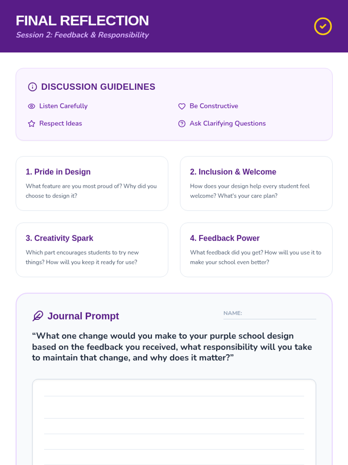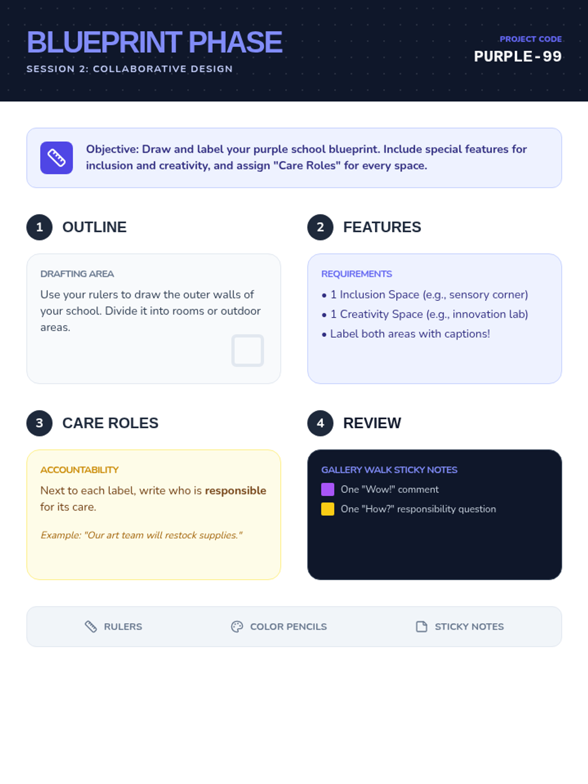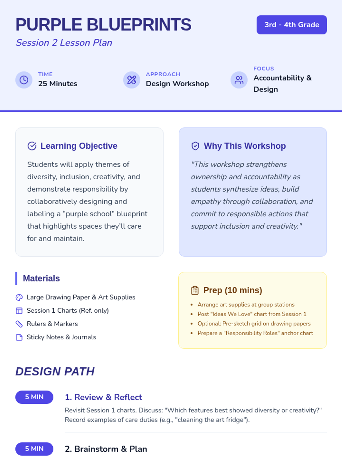 A two-session read-aloud and design sequence for 3rd and 4th graders exploring diversity, inclusion, and responsibility through 'The World Needs More Purple Schools' by Bob Shea. Students move from discussing core values to designing their own inclusive school blueprints.