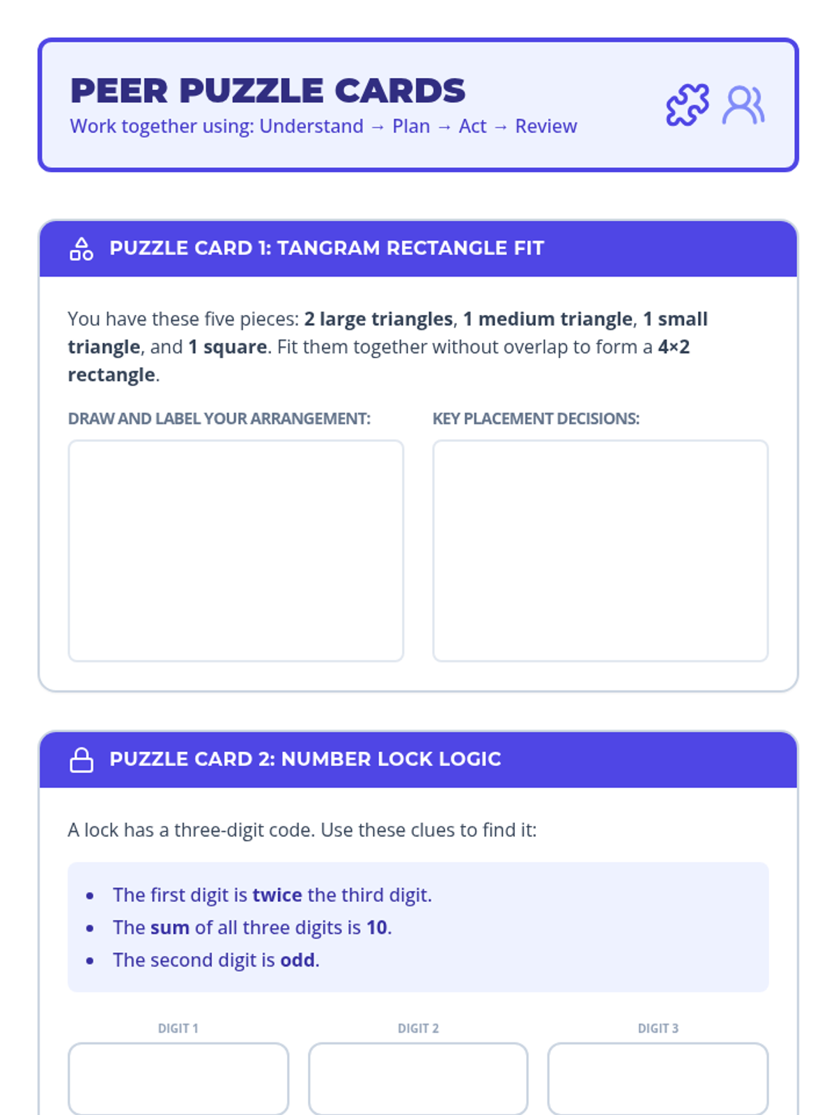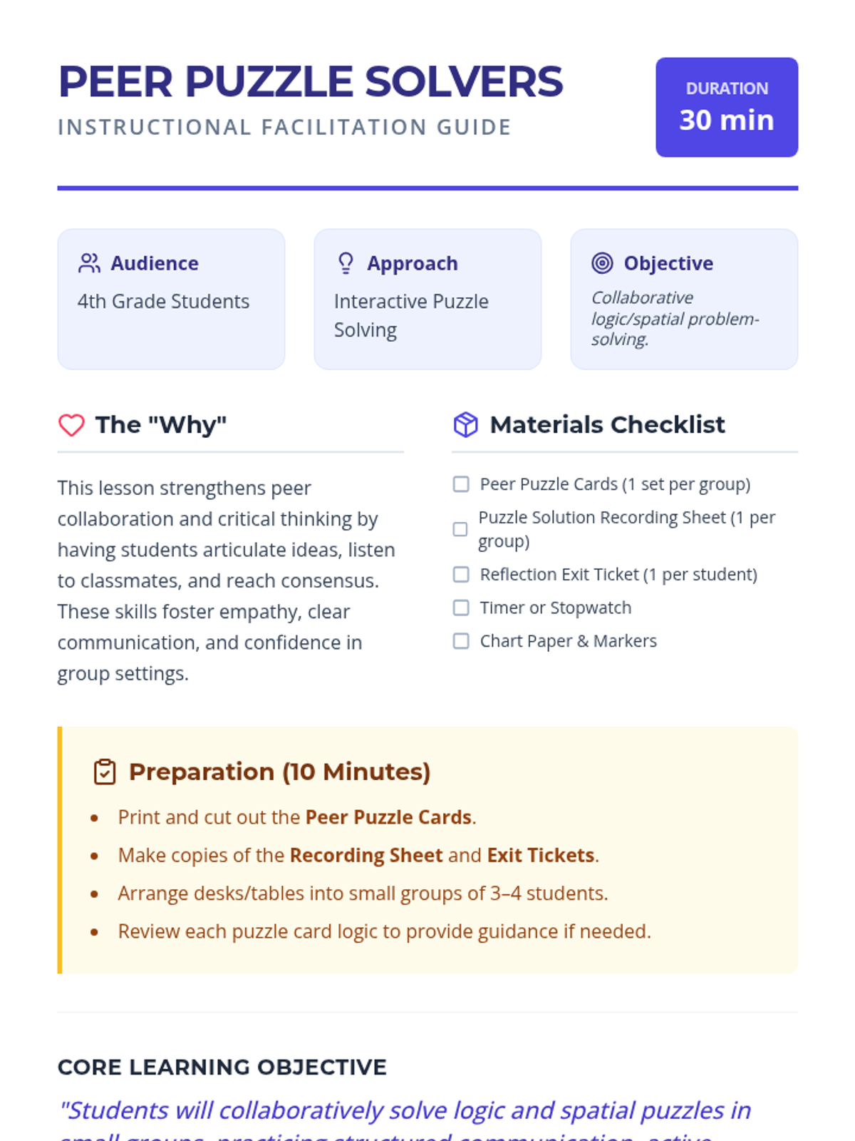 A 4th grade social-emotional learning sequence focused on collaborative problem-solving. Students practice structured communication strategies through both real-world social scenarios and logic-based team puzzles.