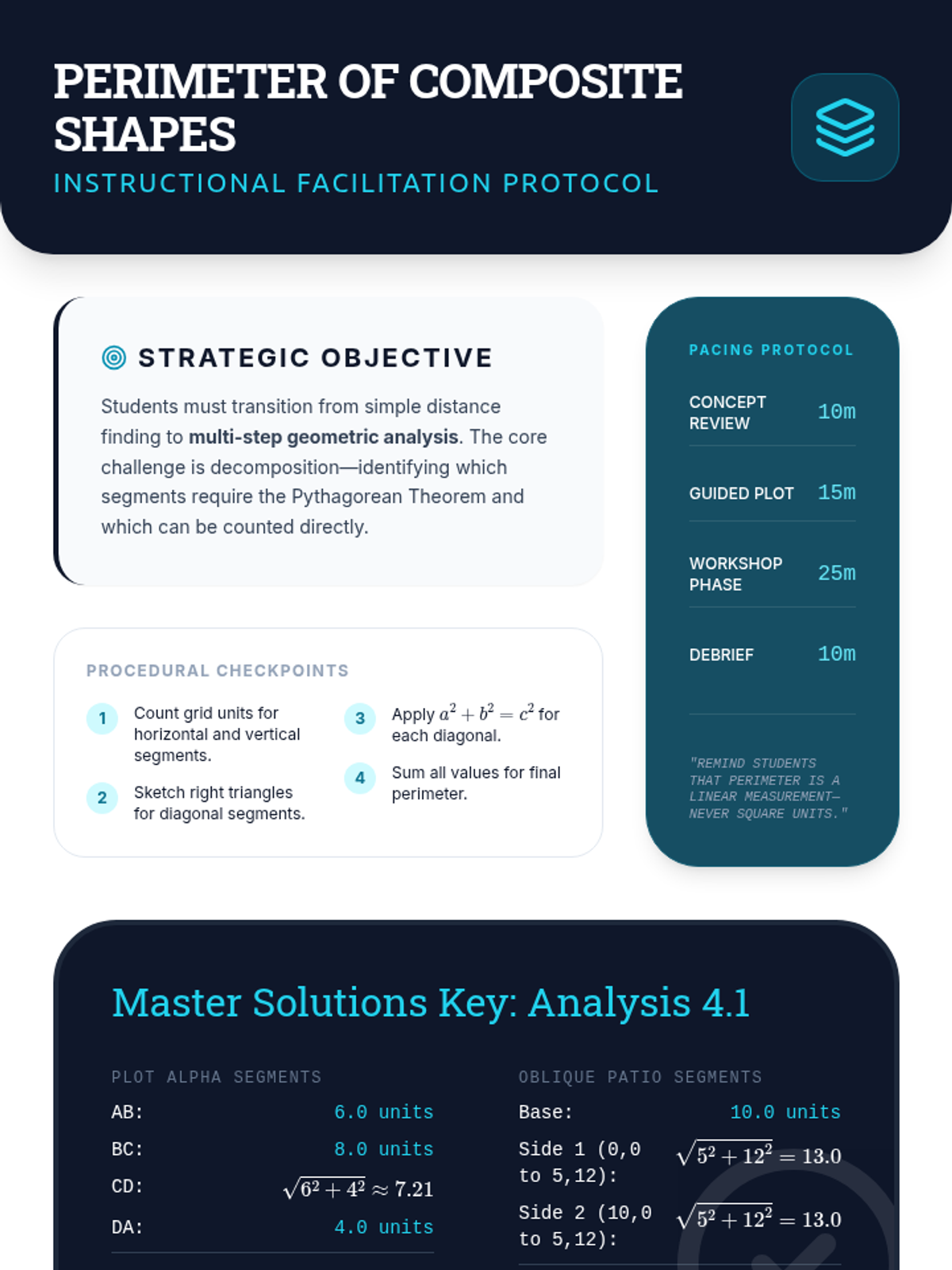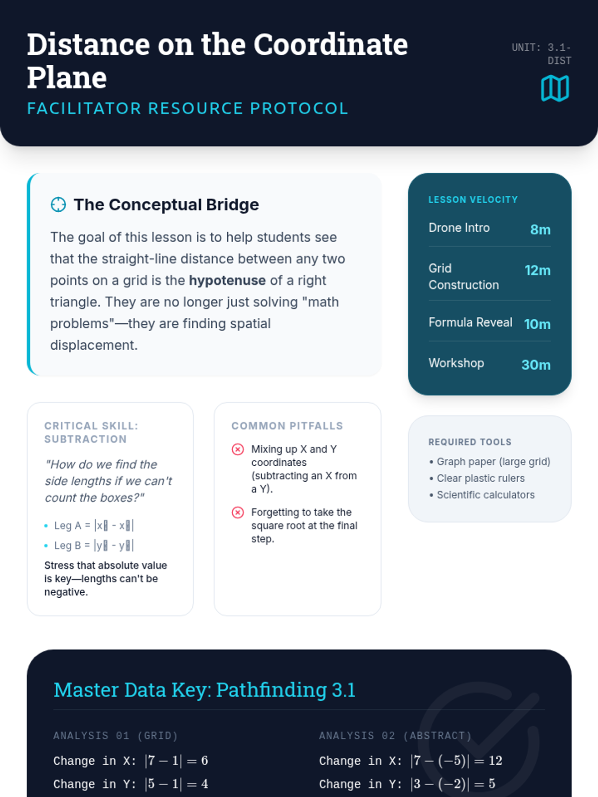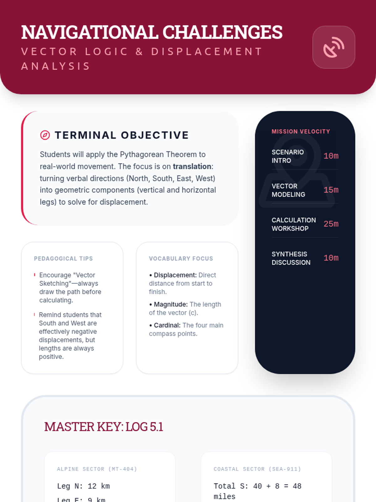 An advanced geometry sequence focusing on solving for missing legs, identifying triples, and applying the Pythagorean Theorem to coordinate geometry and real-world navigation.