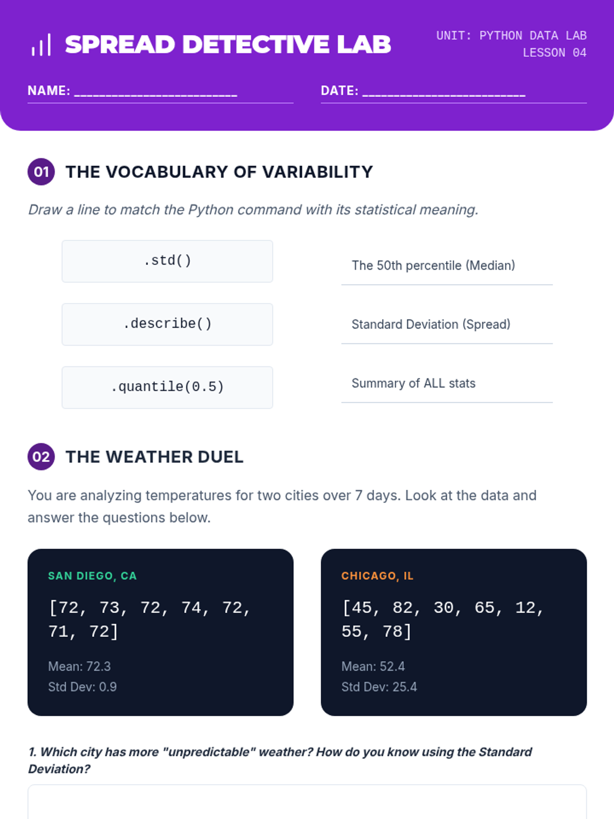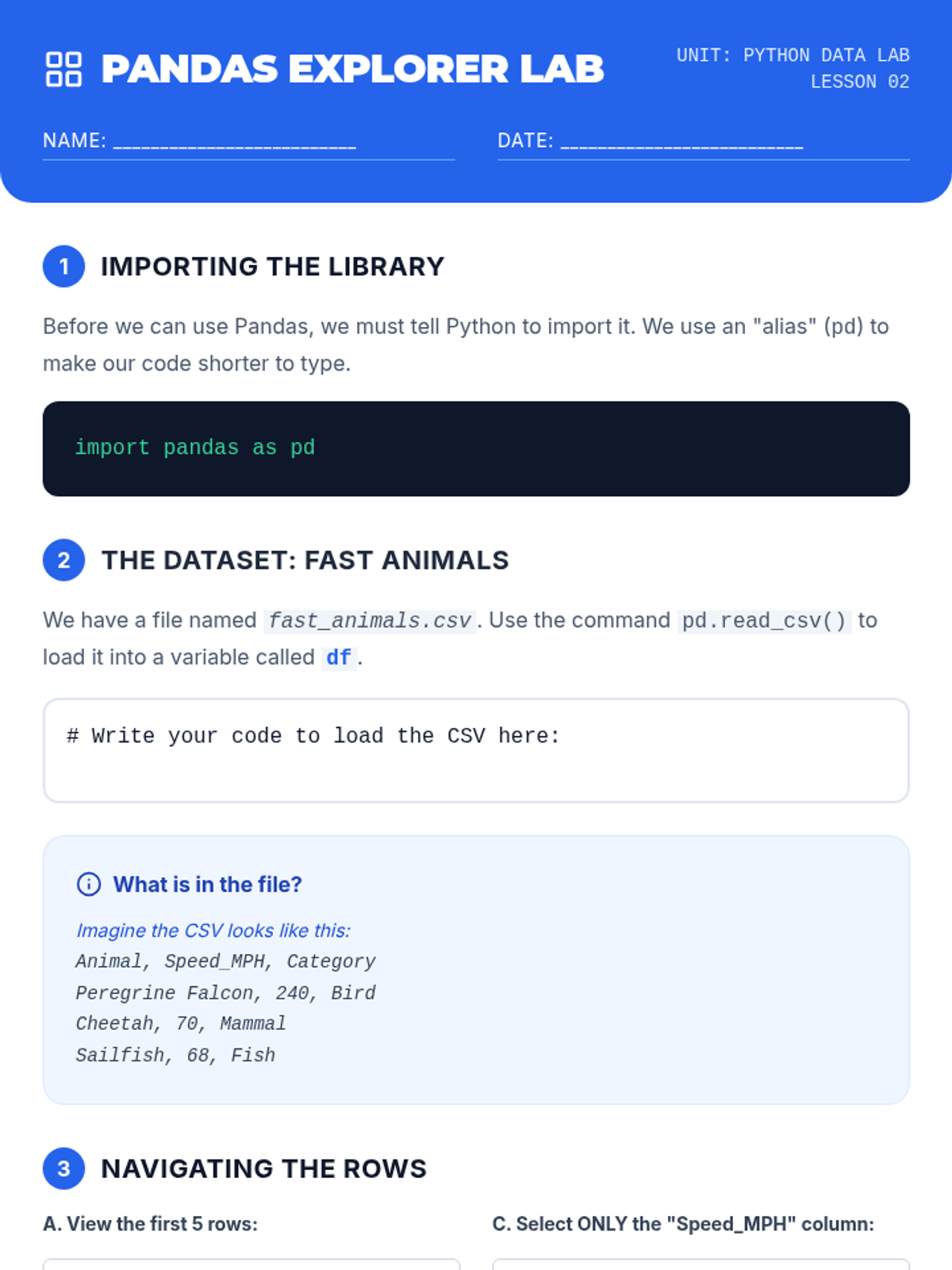 A comprehensive introduction to Python programming for data analysis, focusing on variables, lists, the Pandas library, and automated statistical calculations for 8th-grade students.
