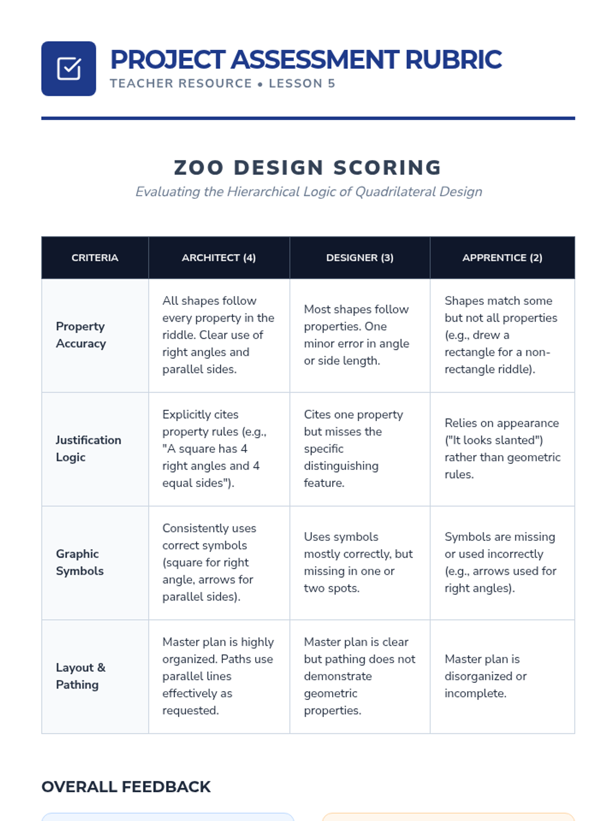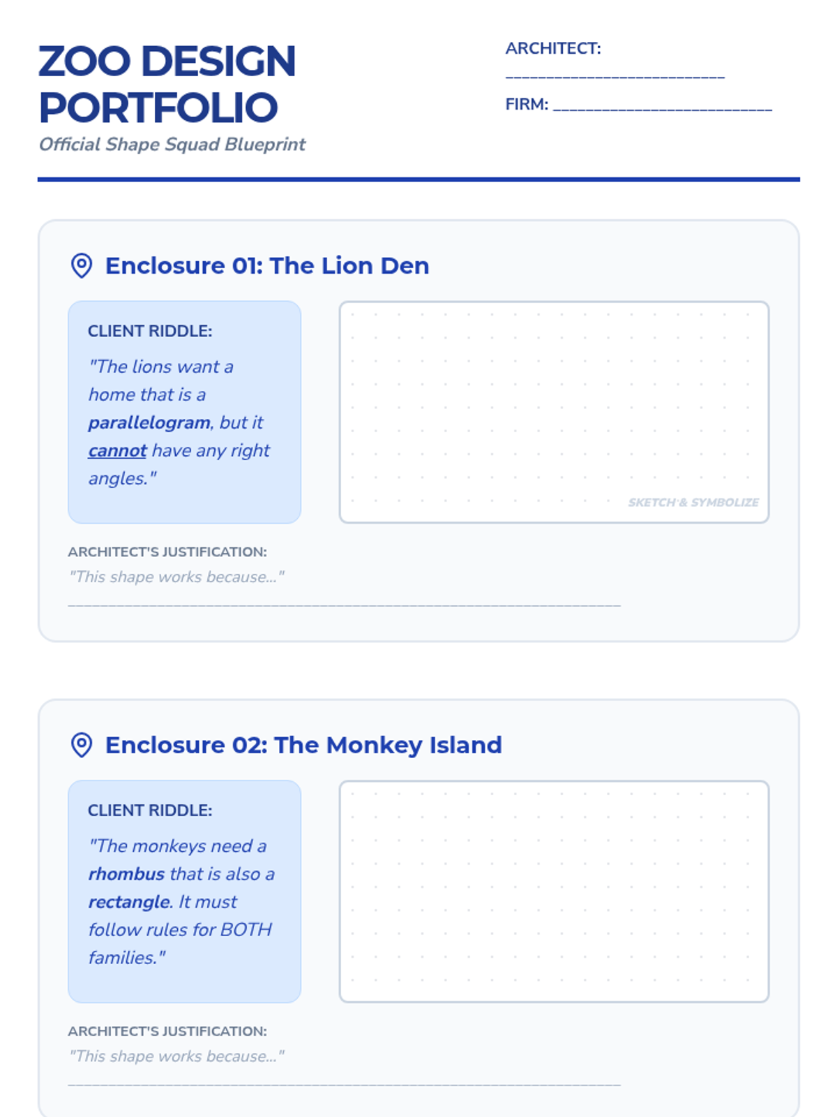 A two-week enrichment project where students act as architects to research, design, and calculate the geometry of a modern structure. The project covers points, lines, angles, and 2D shape classification through real-world application and creative design.