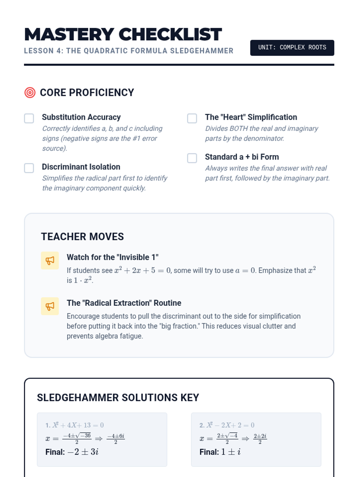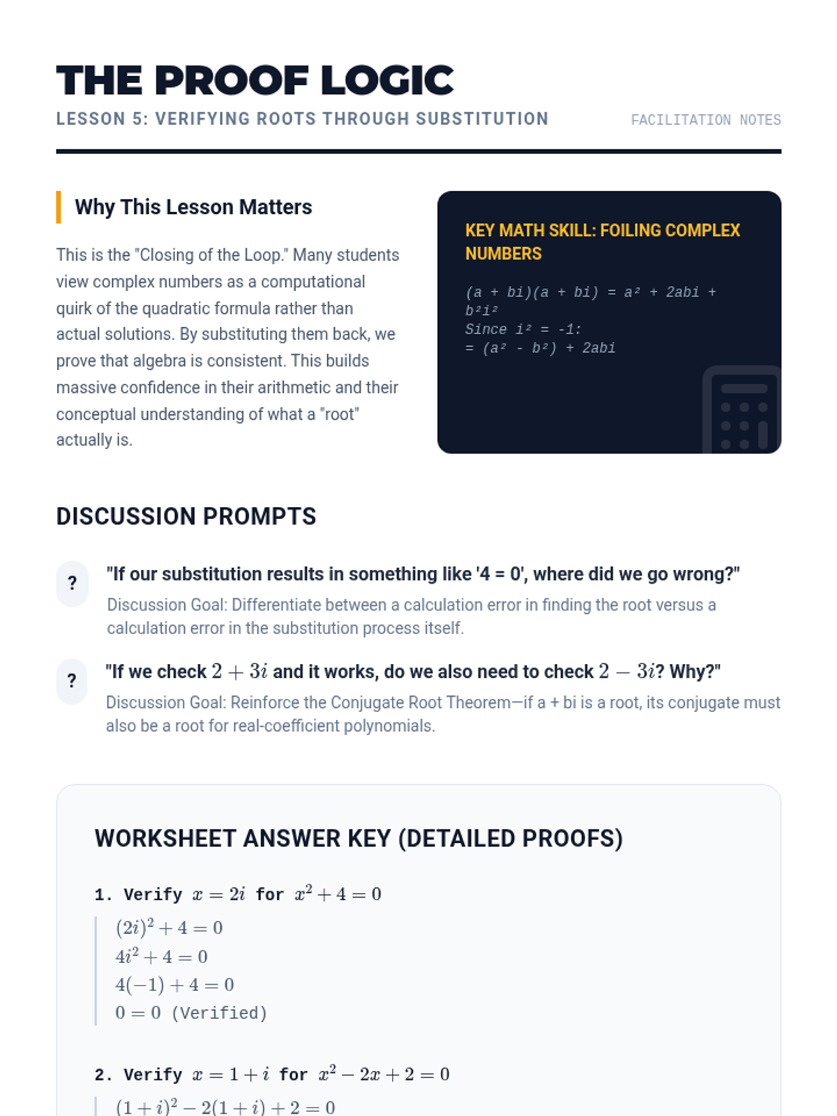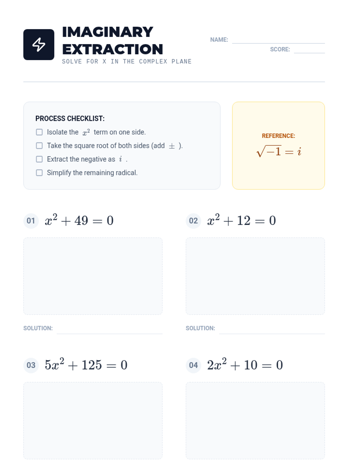 This sequence bridges the gap between graphical representations of parabolas and algebraic solutions. Students explore why some quadratic equations lack real x-intercepts and learn to identify and calculate complex roots using the discriminant, square root method, completing the square, and the quadratic formula.