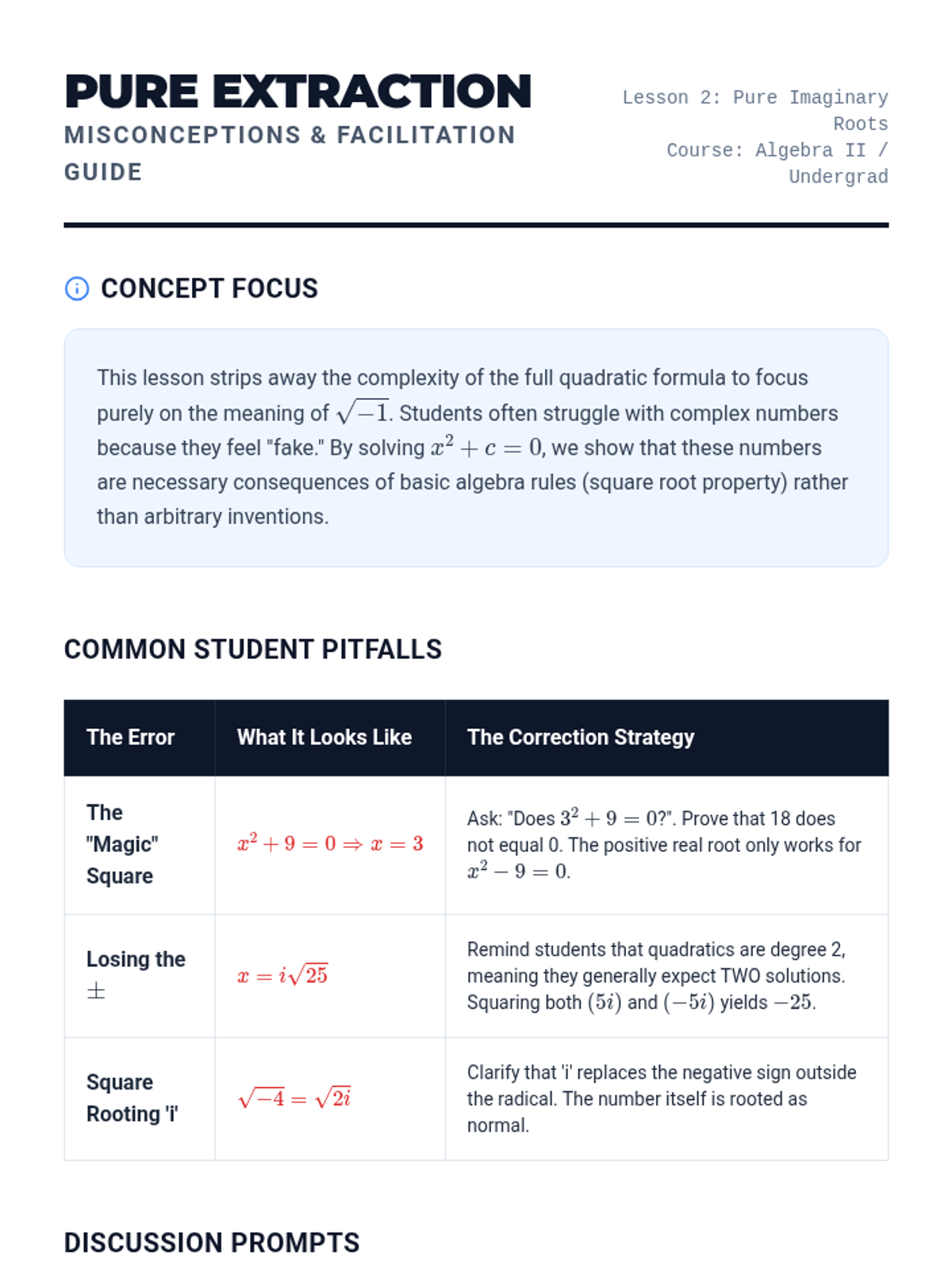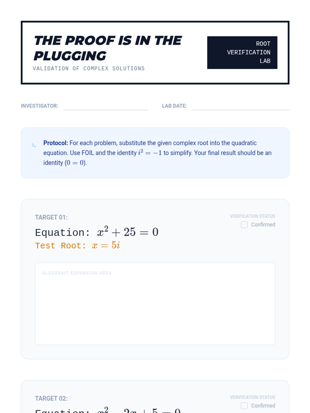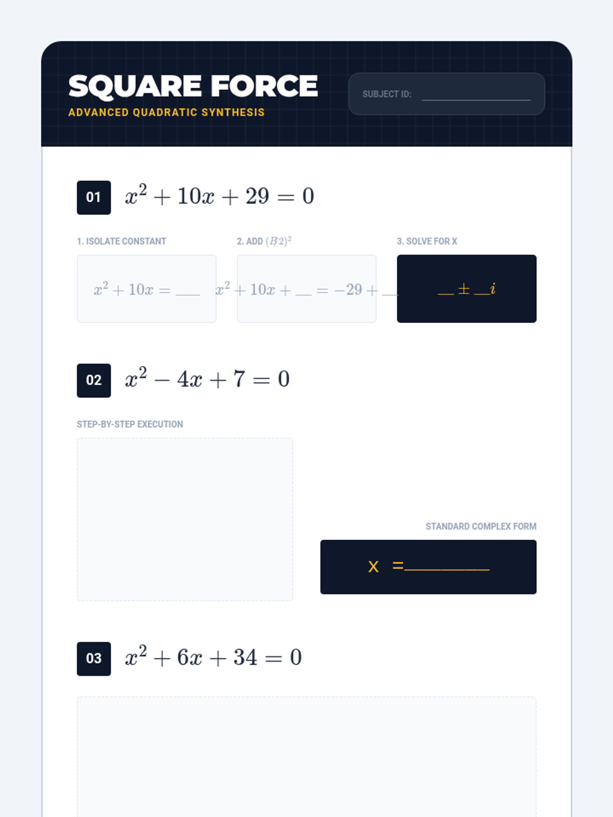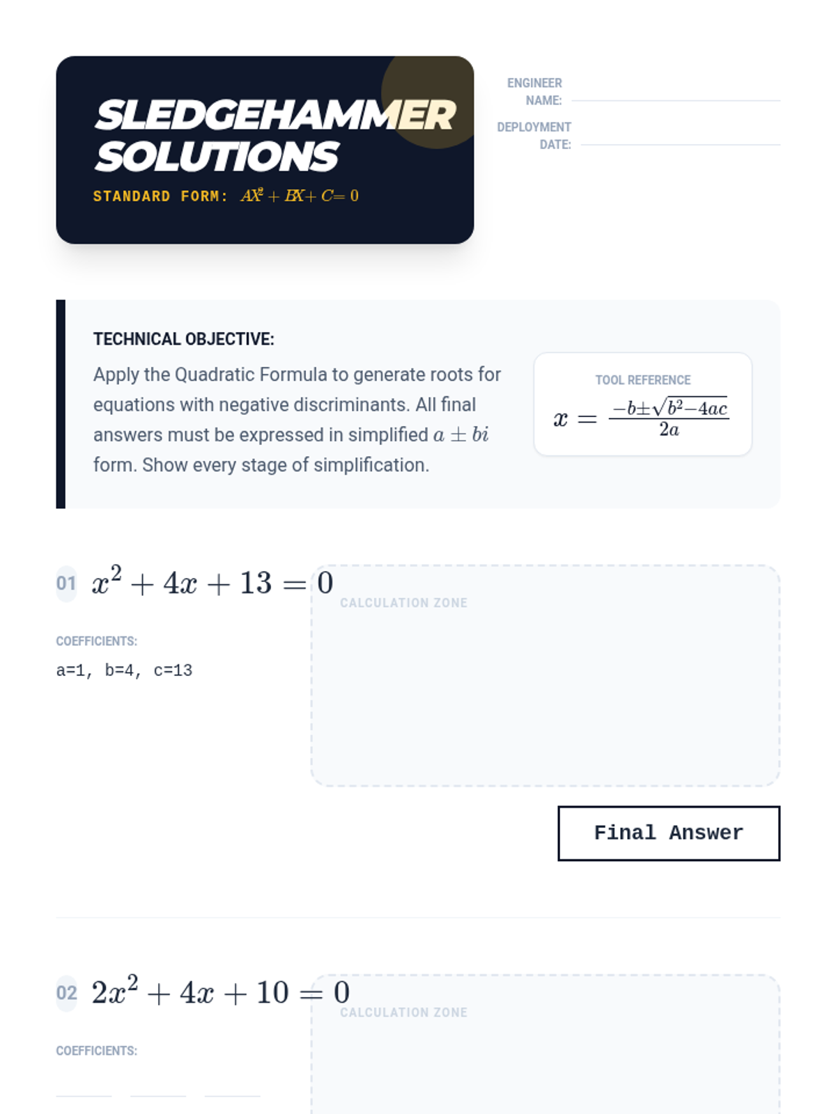 This sequence bridges the gap between graphical representations of parabolas and algebraic solutions. Students explore why some quadratic equations lack real x-intercepts and learn to identify and calculate complex roots using the discriminant, square root method, completing the square, and the quadratic formula.