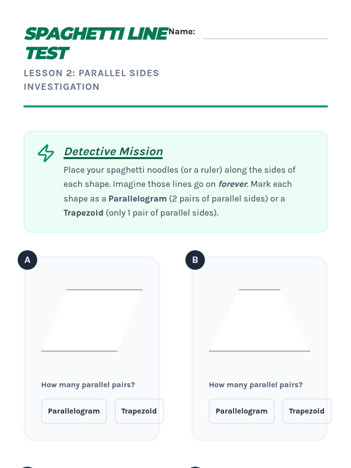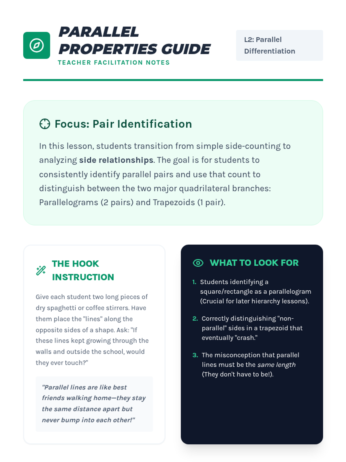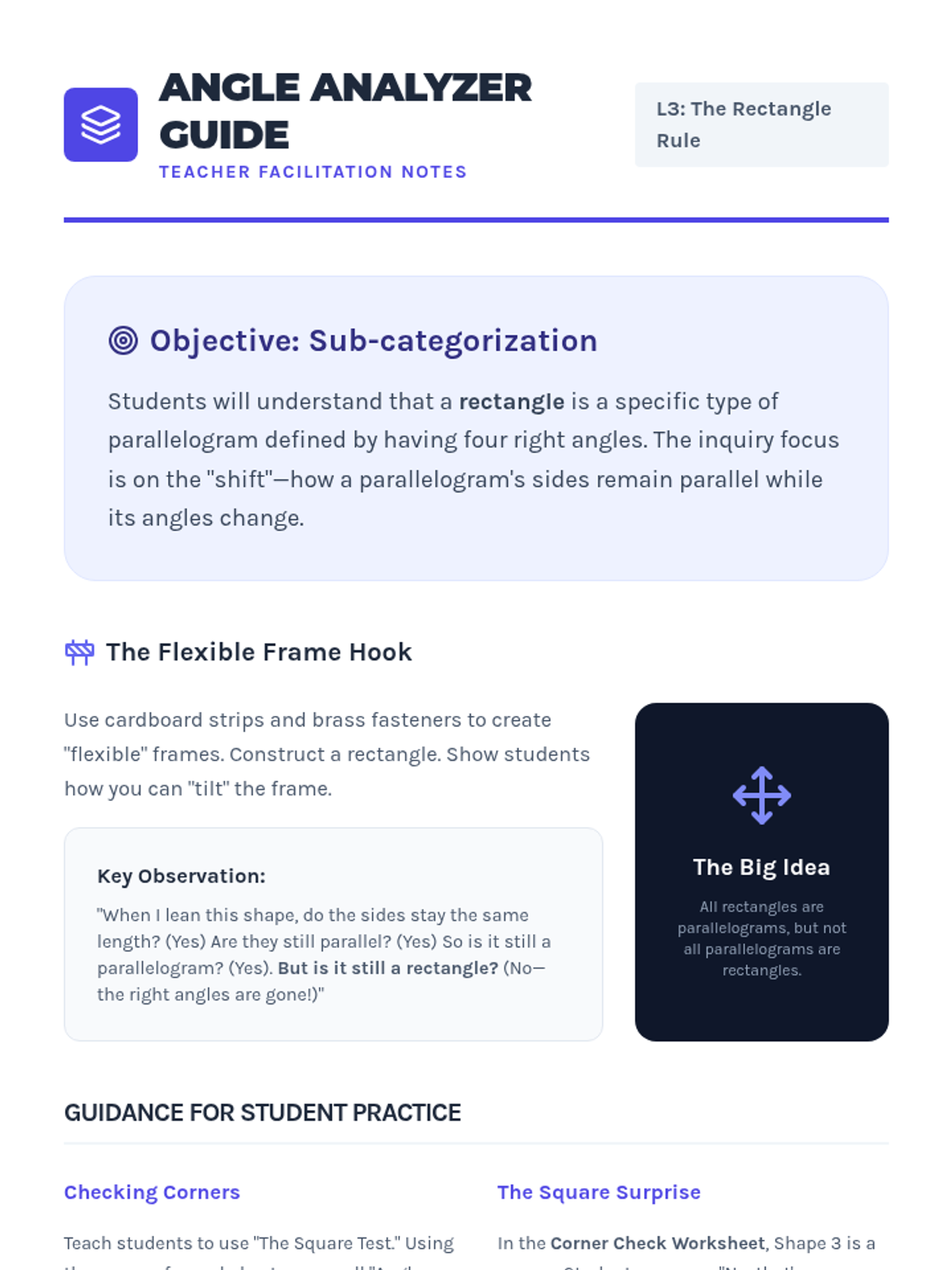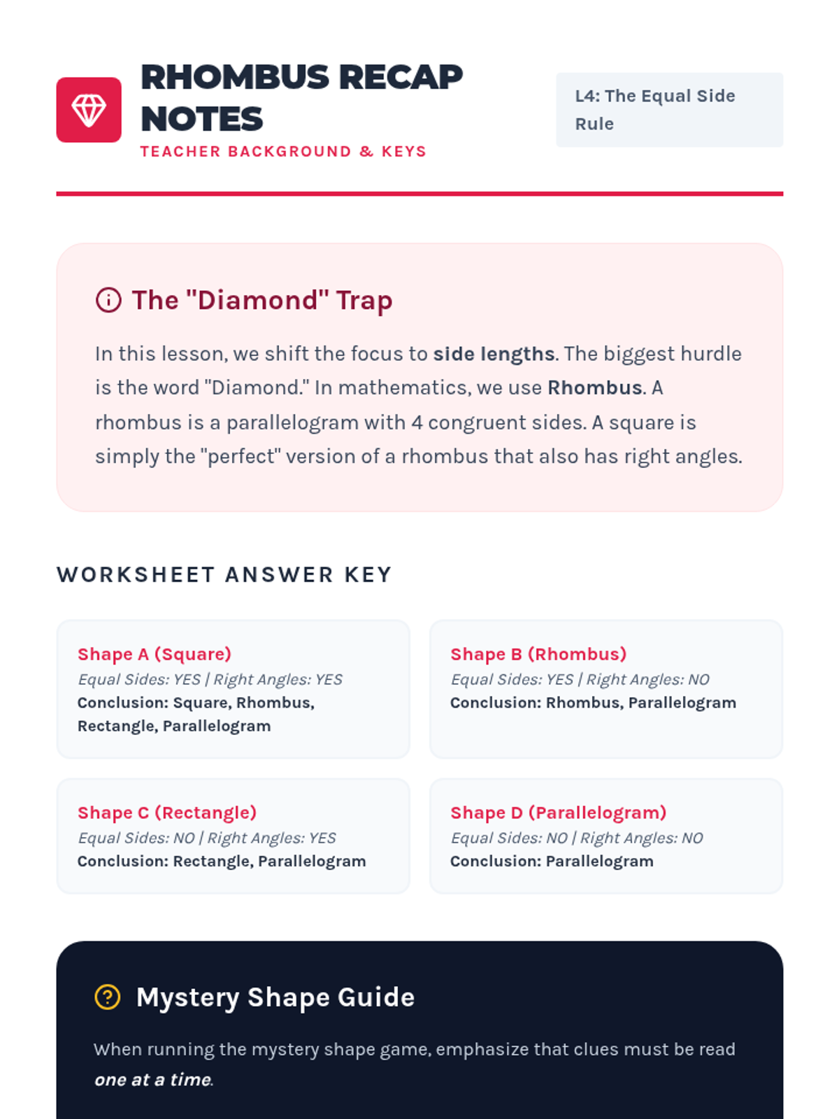 This workshop-style sequence focuses intensively on the hierarchical classification of quadrilaterals, a key third-grade standard. Students move from recognizing generic four-sided figures to distinguishing between rhombuses, rectangles, squares, parallelograms, and trapezoids based on shared attributes.