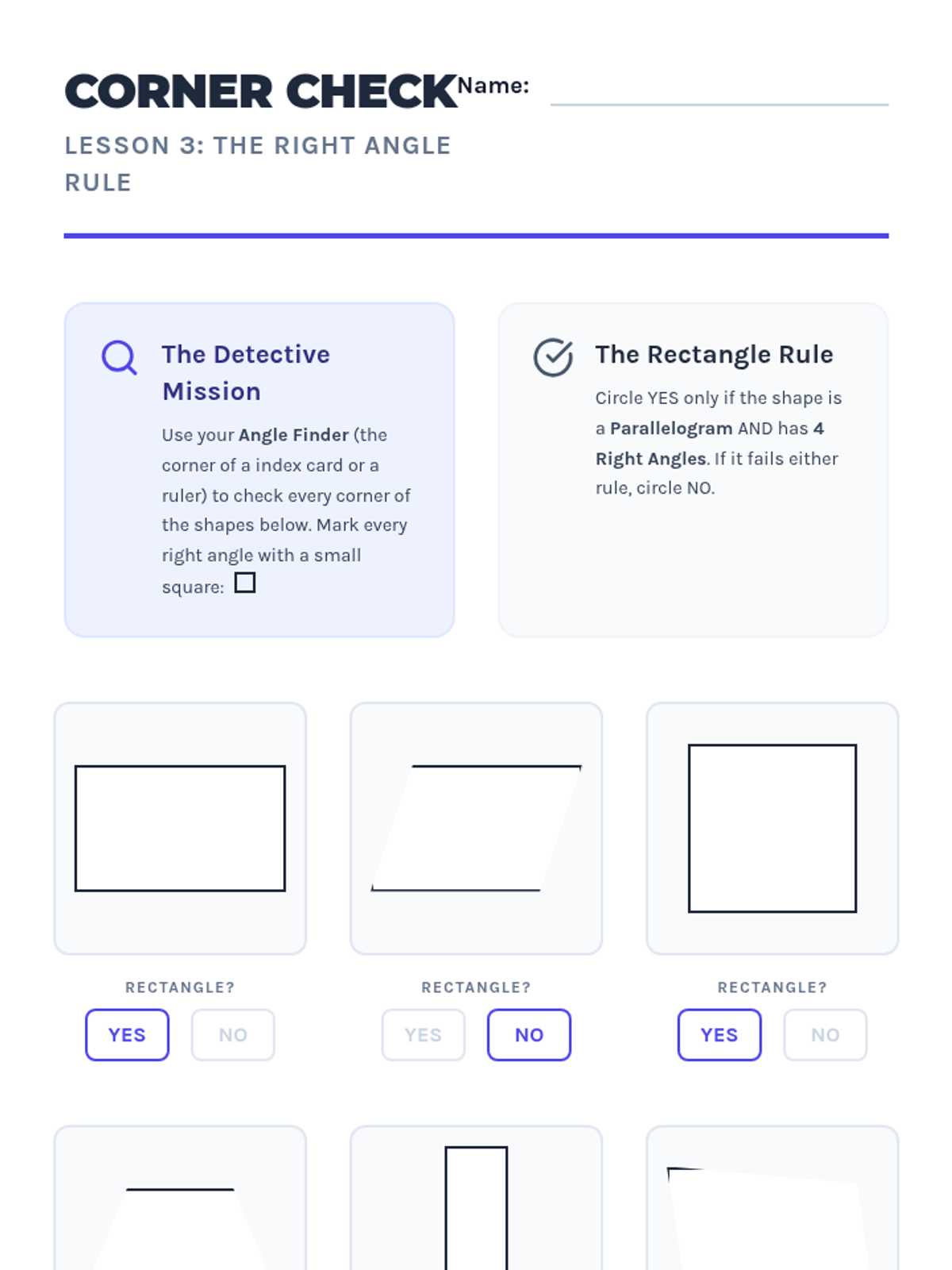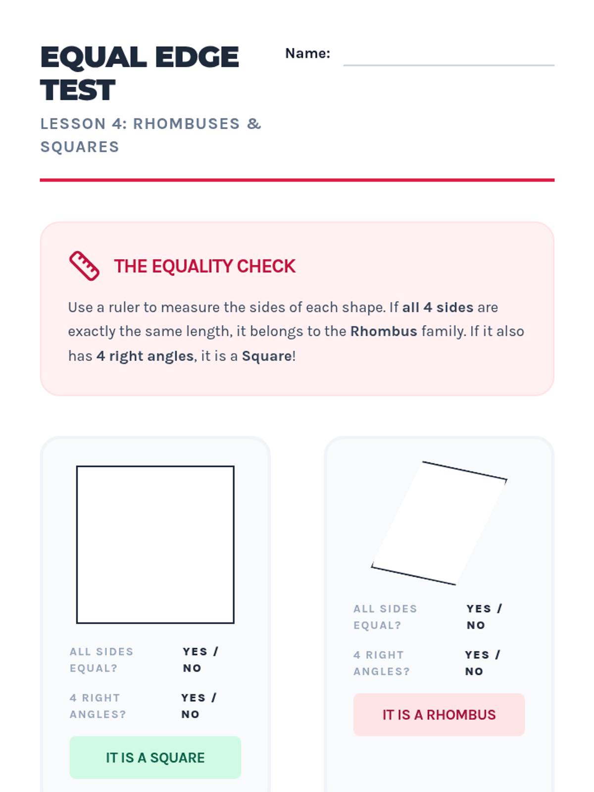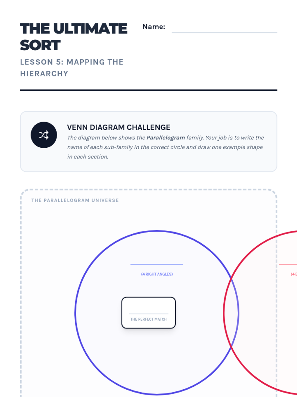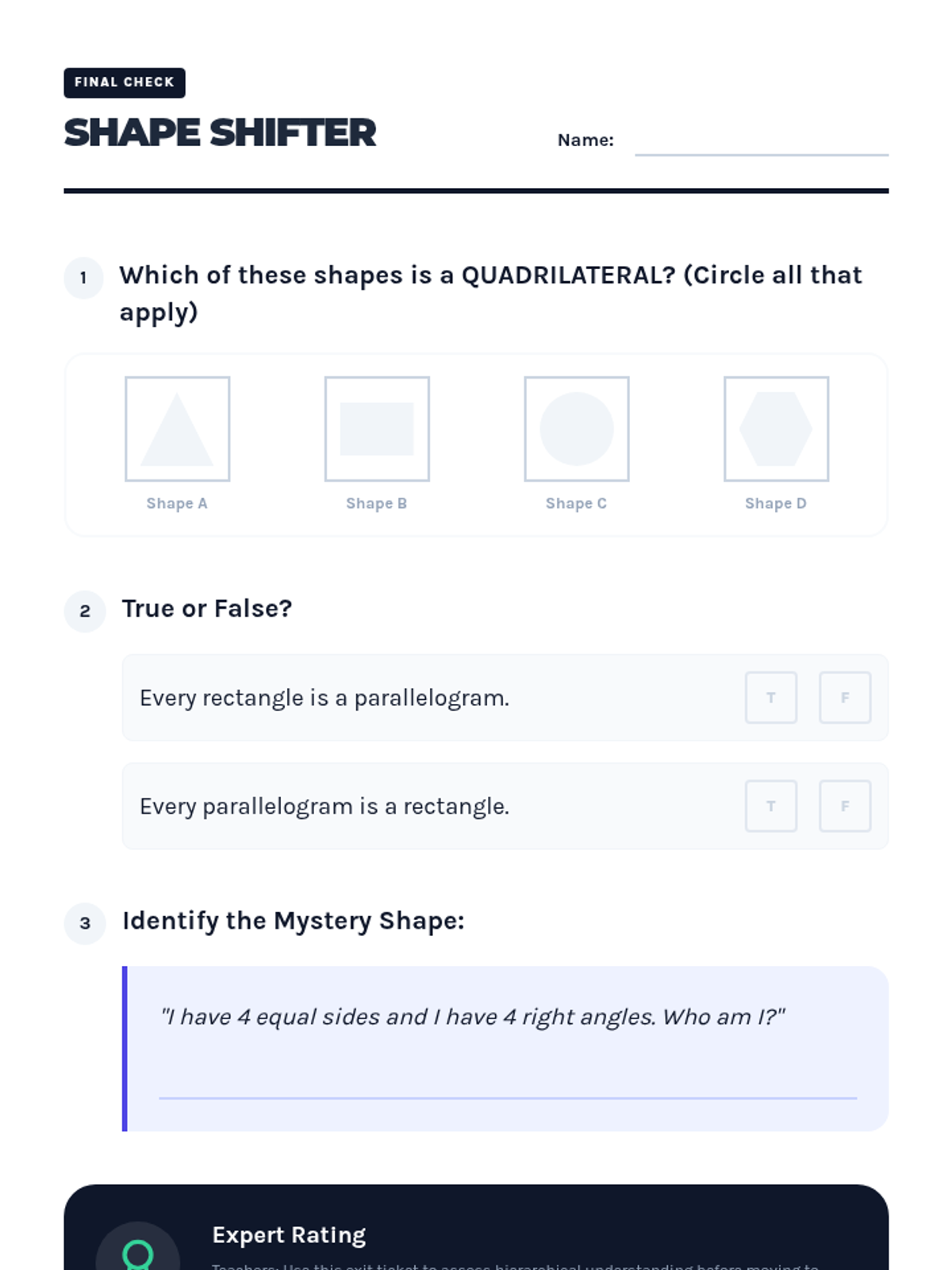 This workshop-style sequence focuses intensively on the hierarchical classification of quadrilaterals, a key third-grade standard. Students move from recognizing generic four-sided figures to distinguishing between rhombuses, rectangles, squares, parallelograms, and trapezoids based on shared attributes.