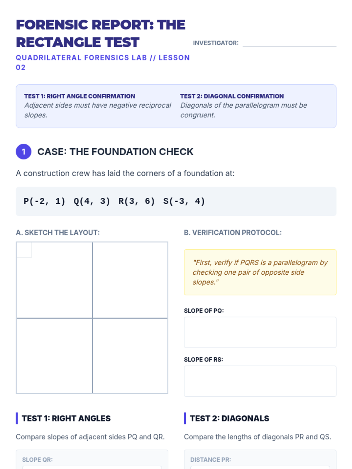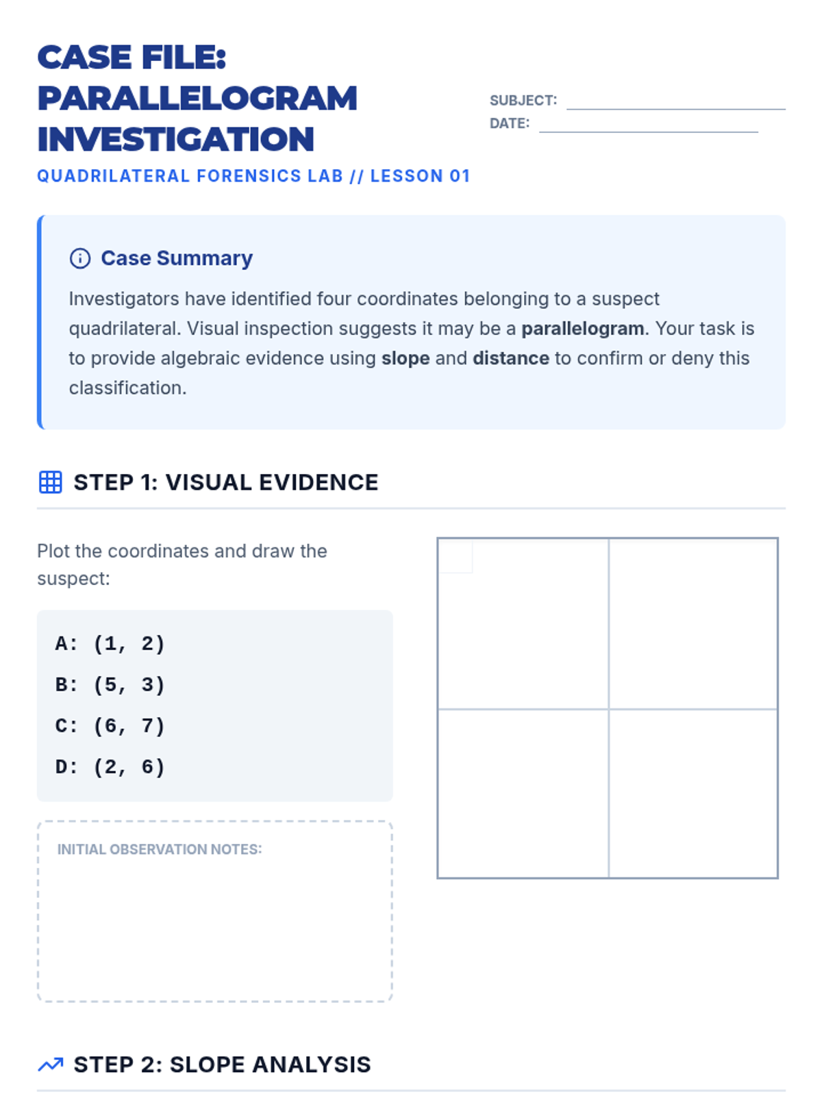 A 9th-grade geometry sequence where students use coordinate geometry and algebraic tools (slope, distance, midpoint formulas) to classify quadrilaterals and prove their properties.