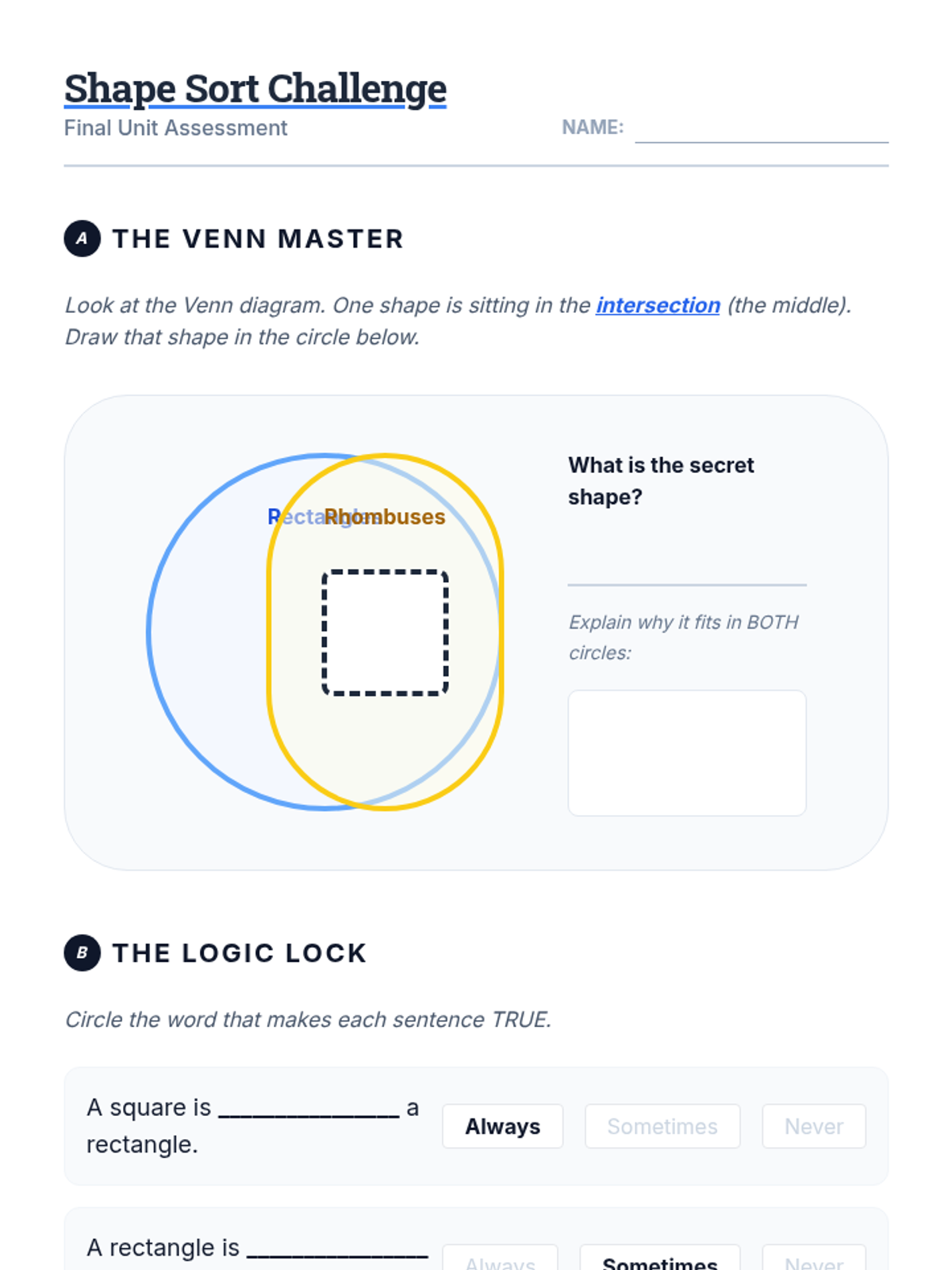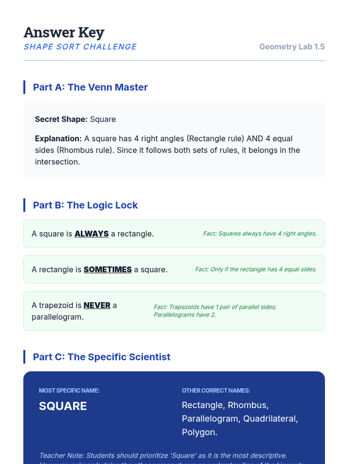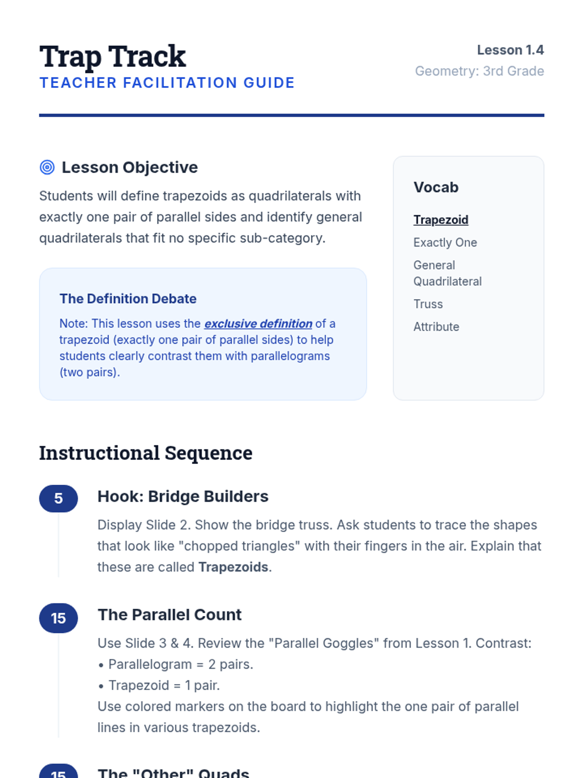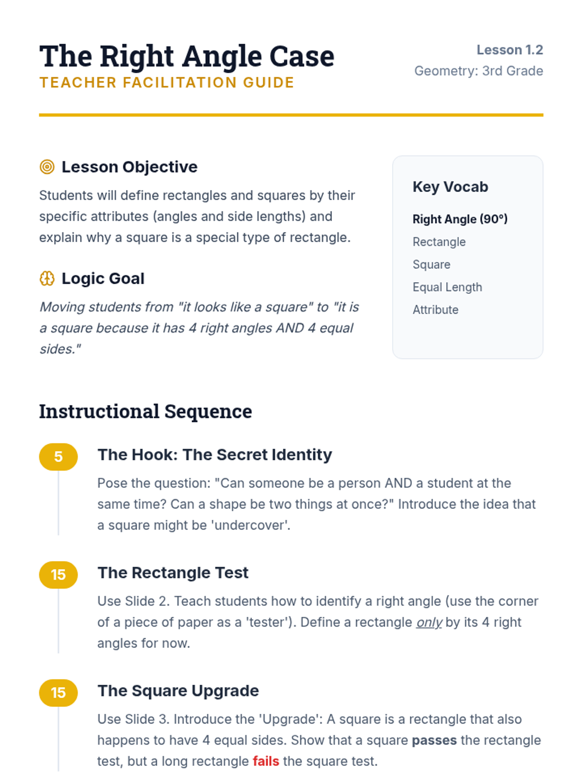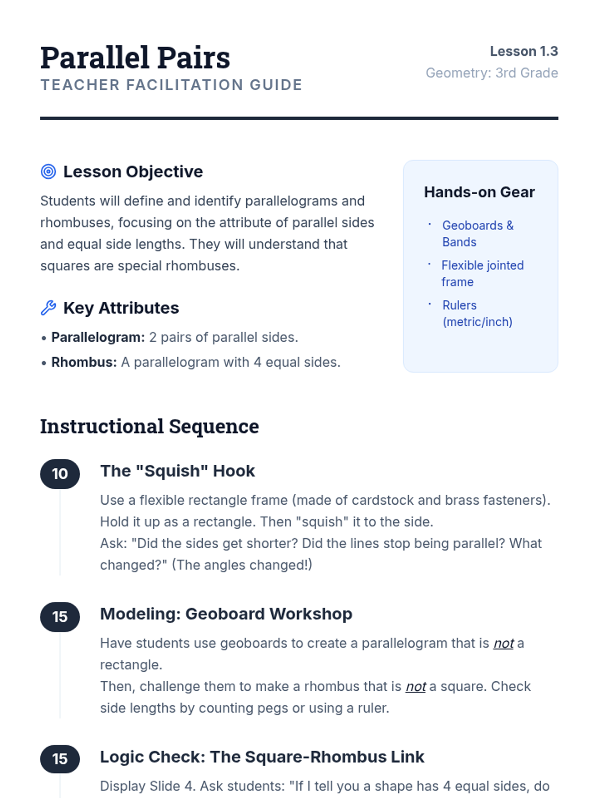 This sequence explores the classification and hierarchy of quadrilaterals for 3rd-grade students. Over five lessons, students progress from identifying basic quadrilaterals to understanding complex logical relationships and shared attributes within the shape family.