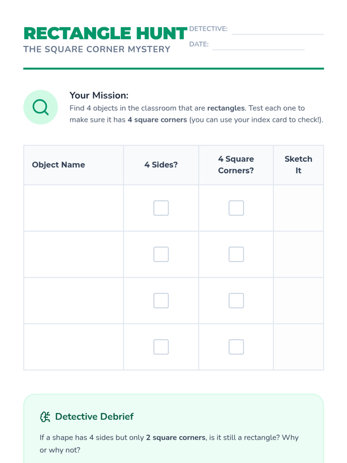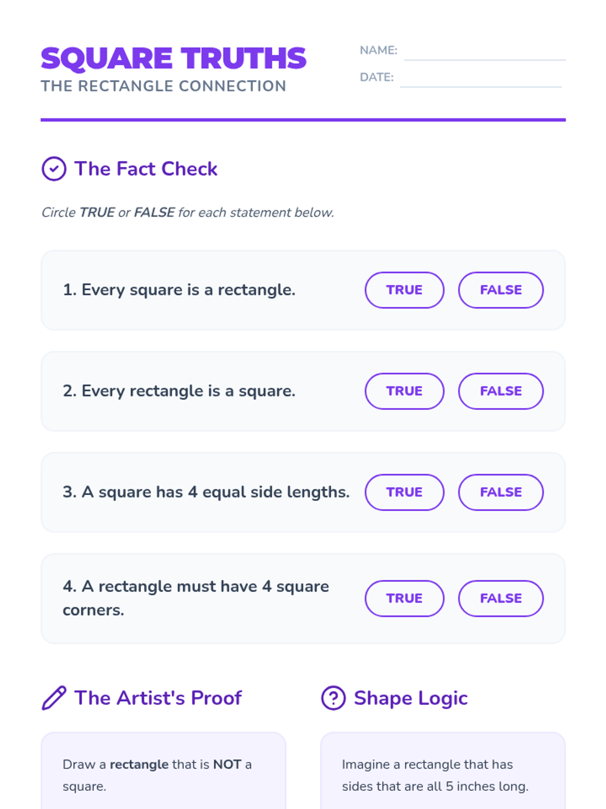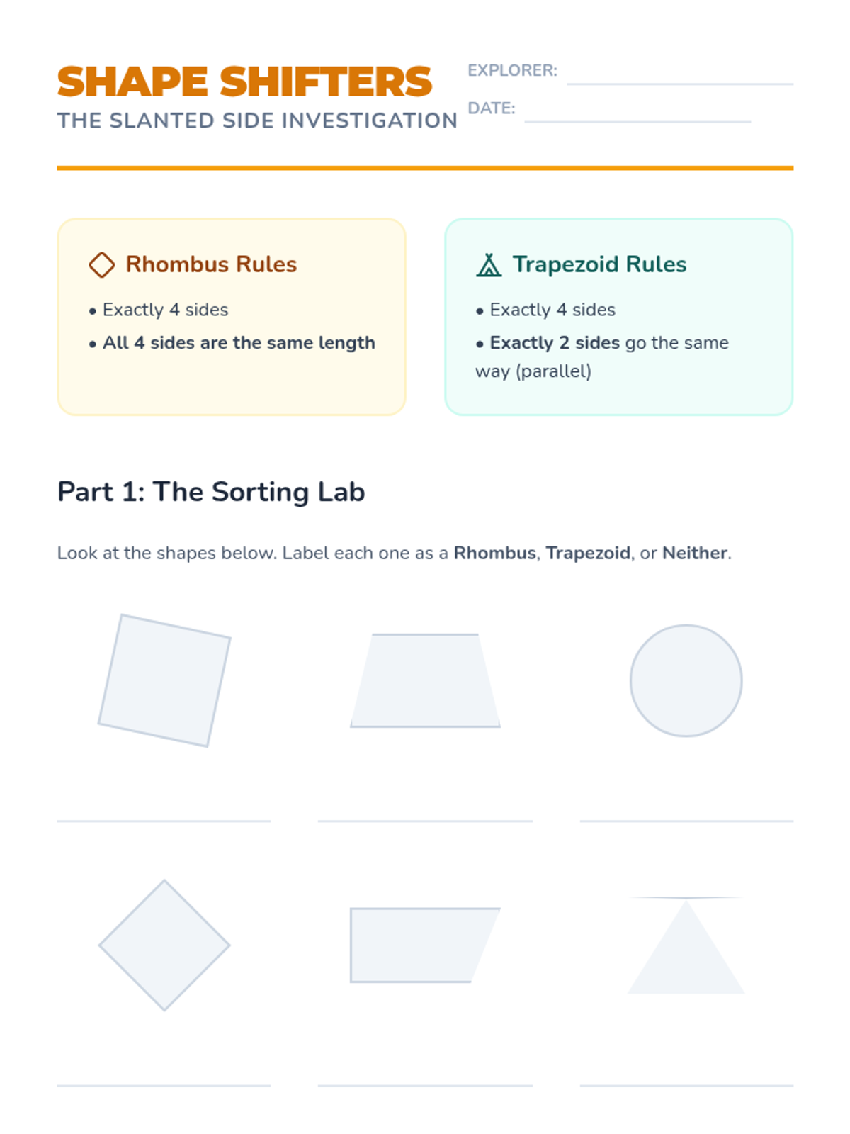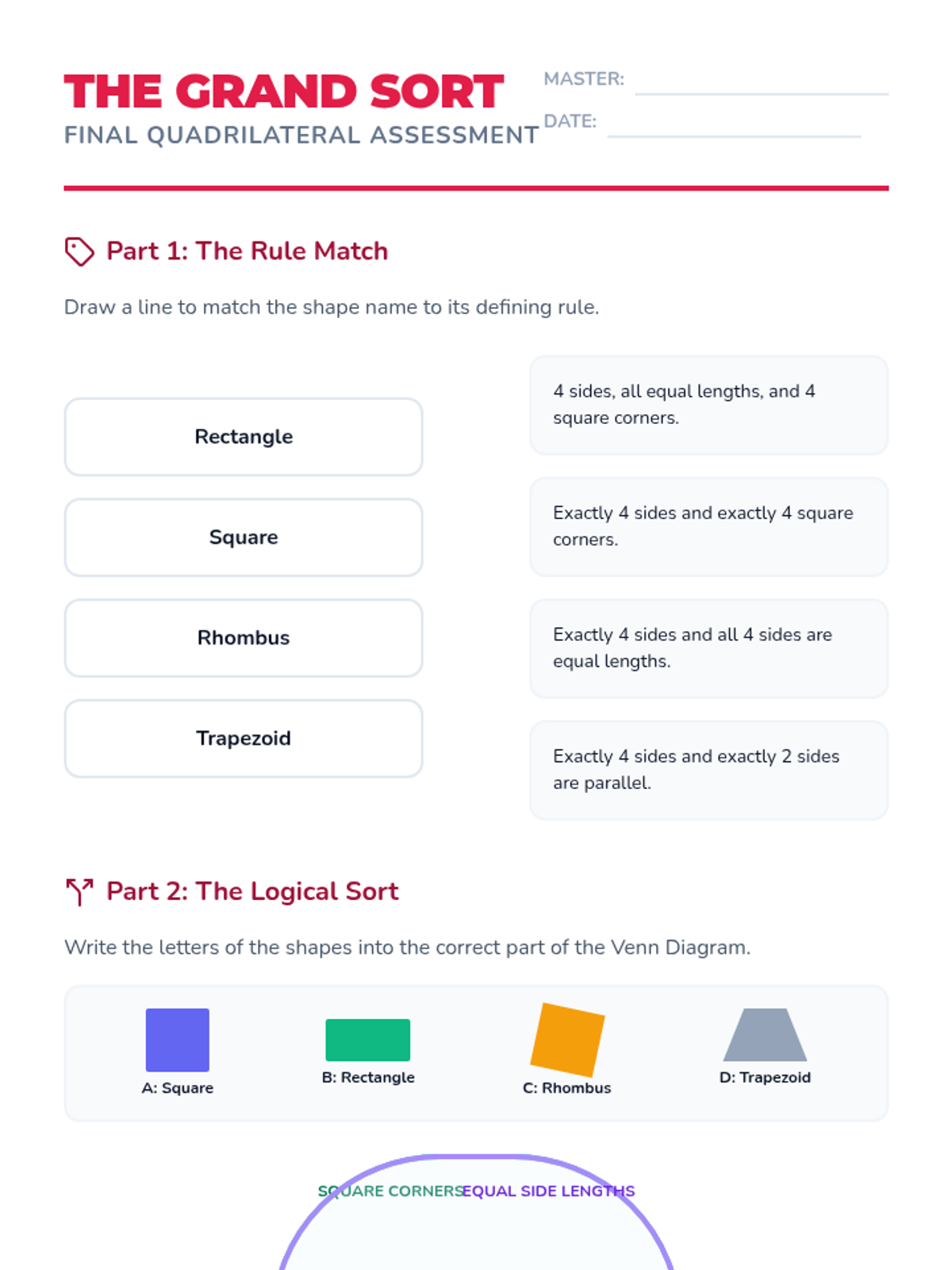 This sequence explores the classification of quadrilaterals for 2nd graders, moving from basic recognition to hierarchical understanding of attributes like right angles and equal side lengths. Students will learn to identify squares, rectangles, rhombuses, and trapezoids, ultimately understanding that shapes can belong to multiple categories.