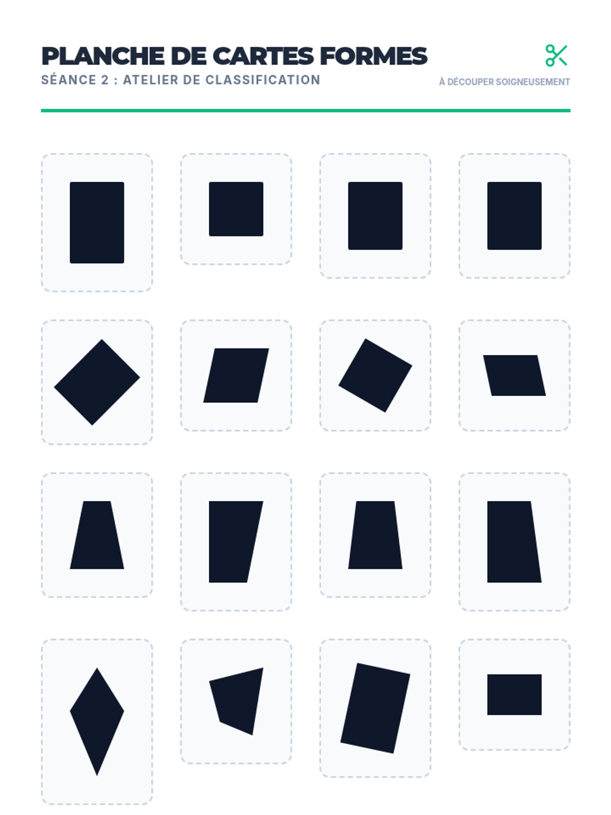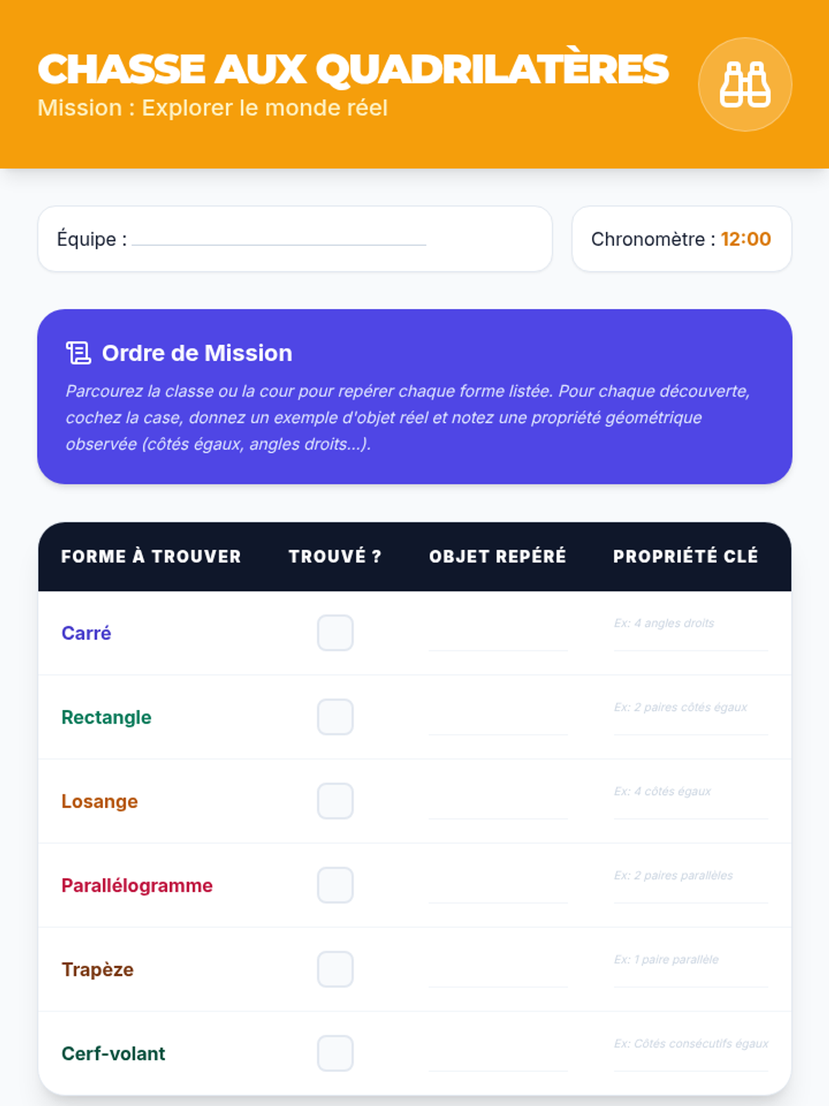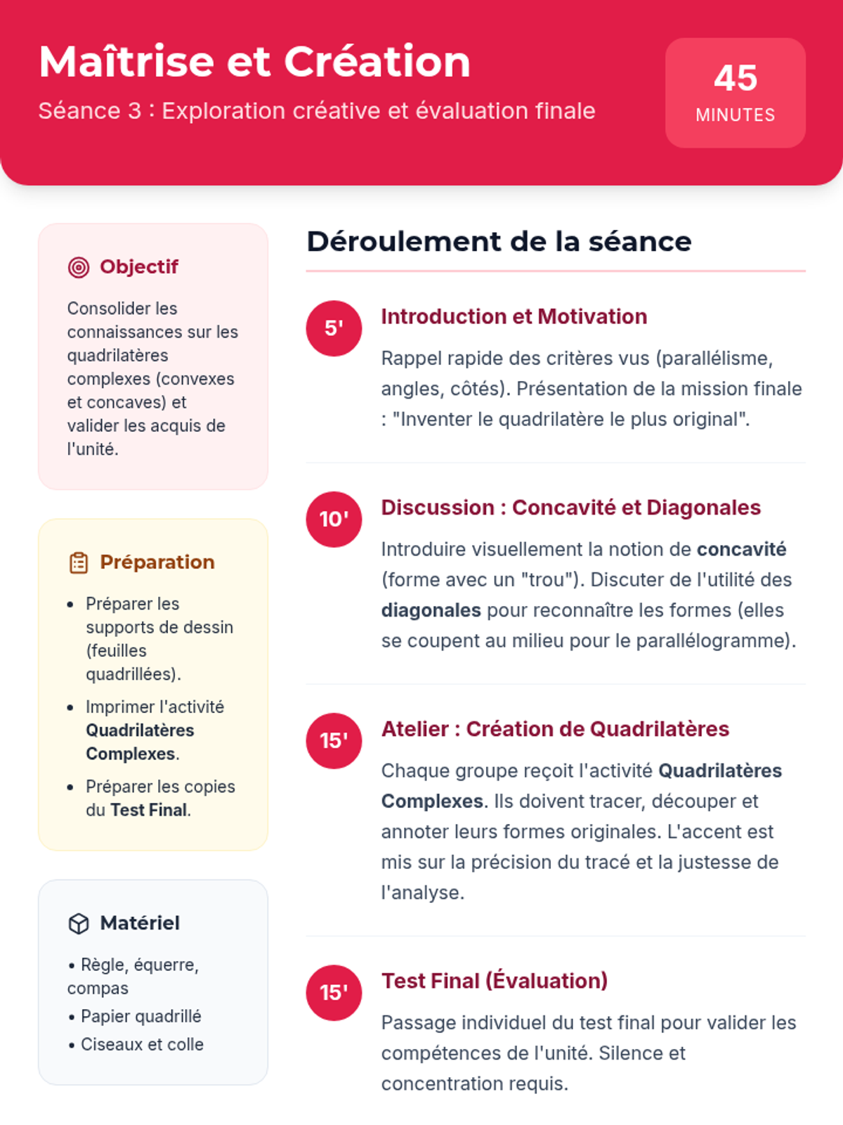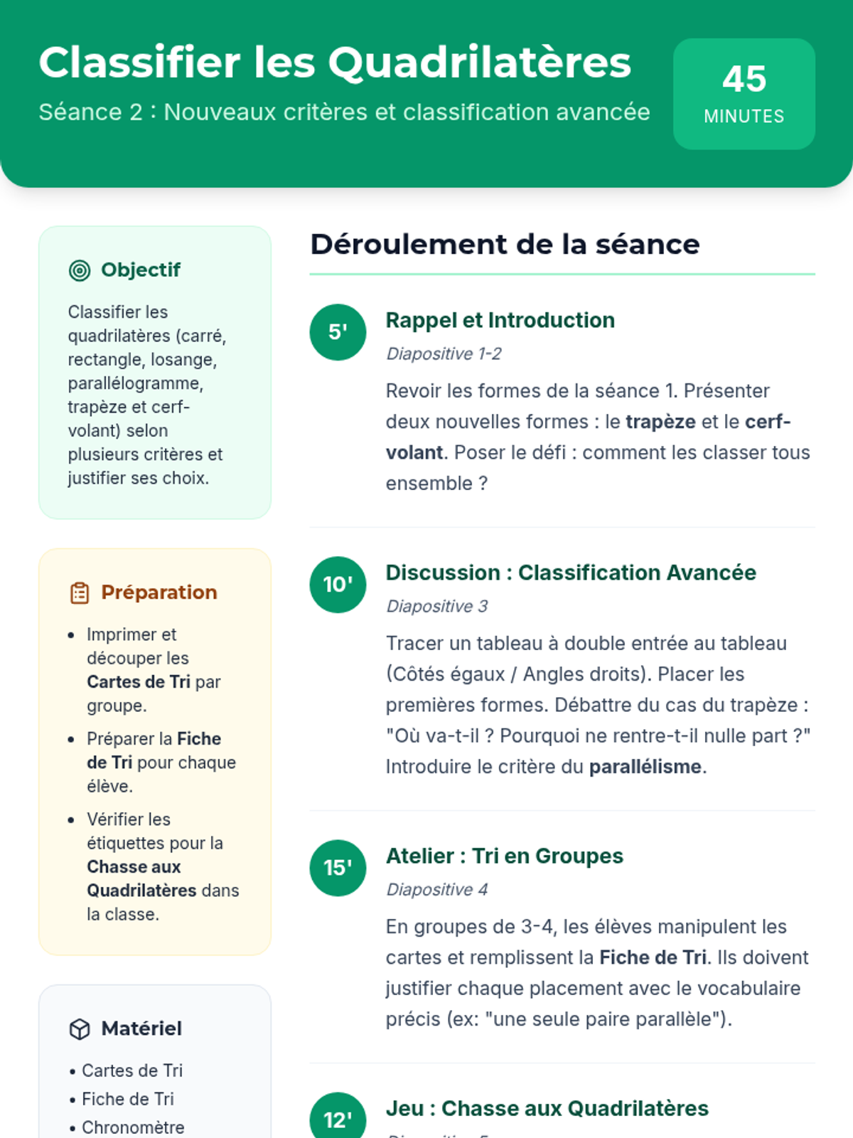 Cette unité de 3 séances guide les élèves de CE2 à la découverte des quadrilatères, explorant leurs propriétés par le jeu, le dessin et la classification. Les élèves développent leur vocabulaire géométrique et leur raisonnement spatial pour devenir experts en formes à quatre côtés.