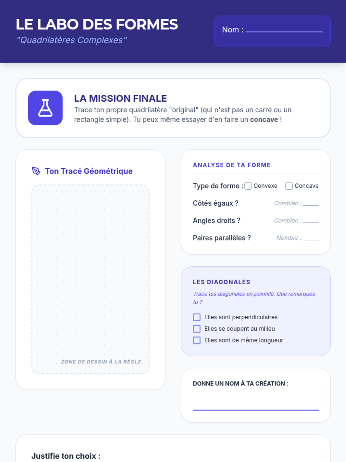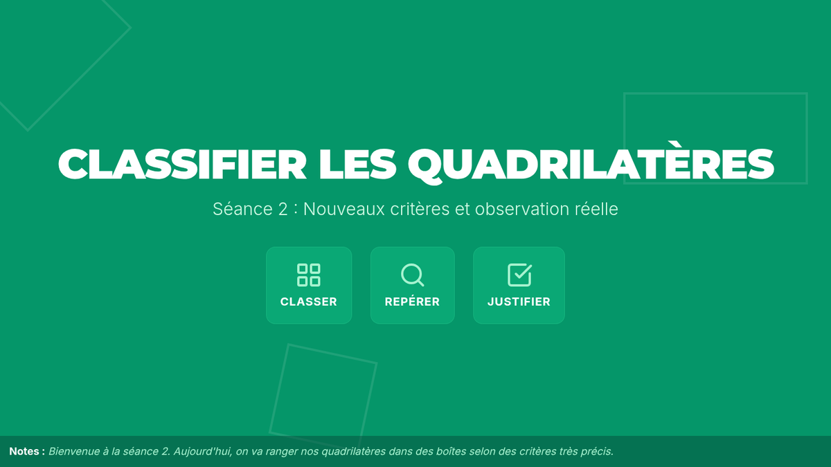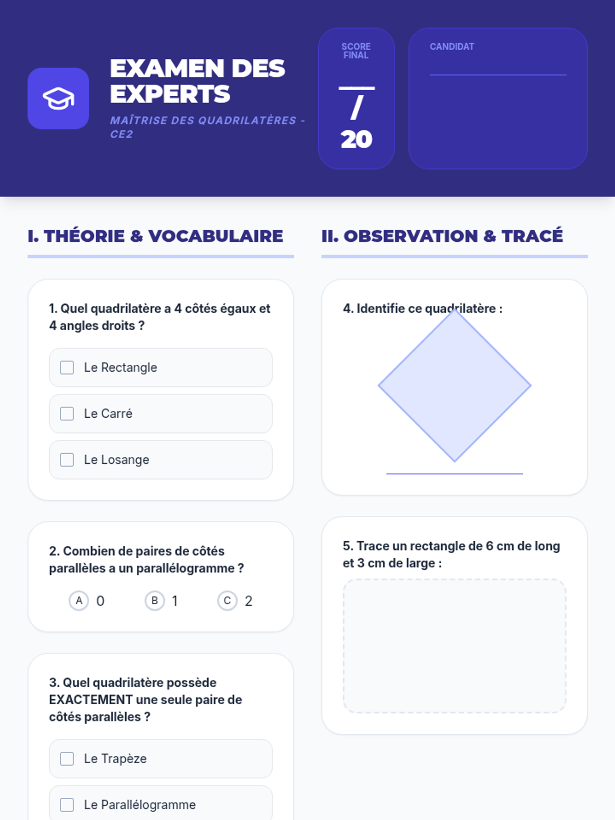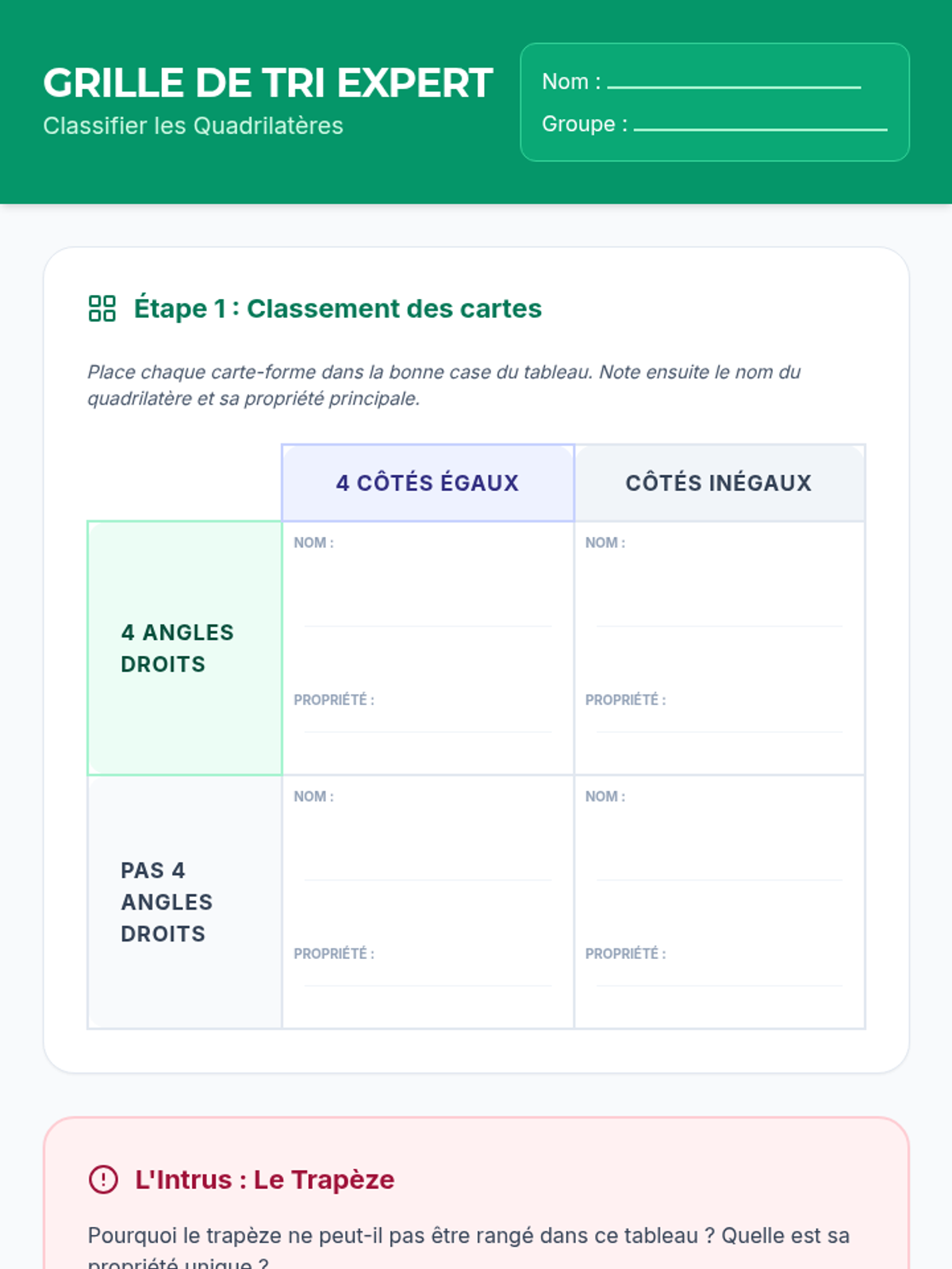 Cette unité de 3 séances guide les élèves de CE2 à la découverte des quadrilatères, explorant leurs propriétés par le jeu, le dessin et la classification. Les élèves développent leur vocabulaire géométrique et leur raisonnement spatial pour devenir experts en formes à quatre côtés.