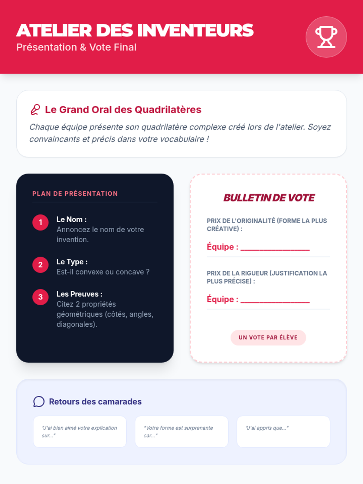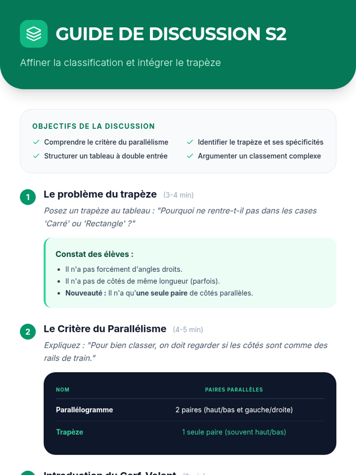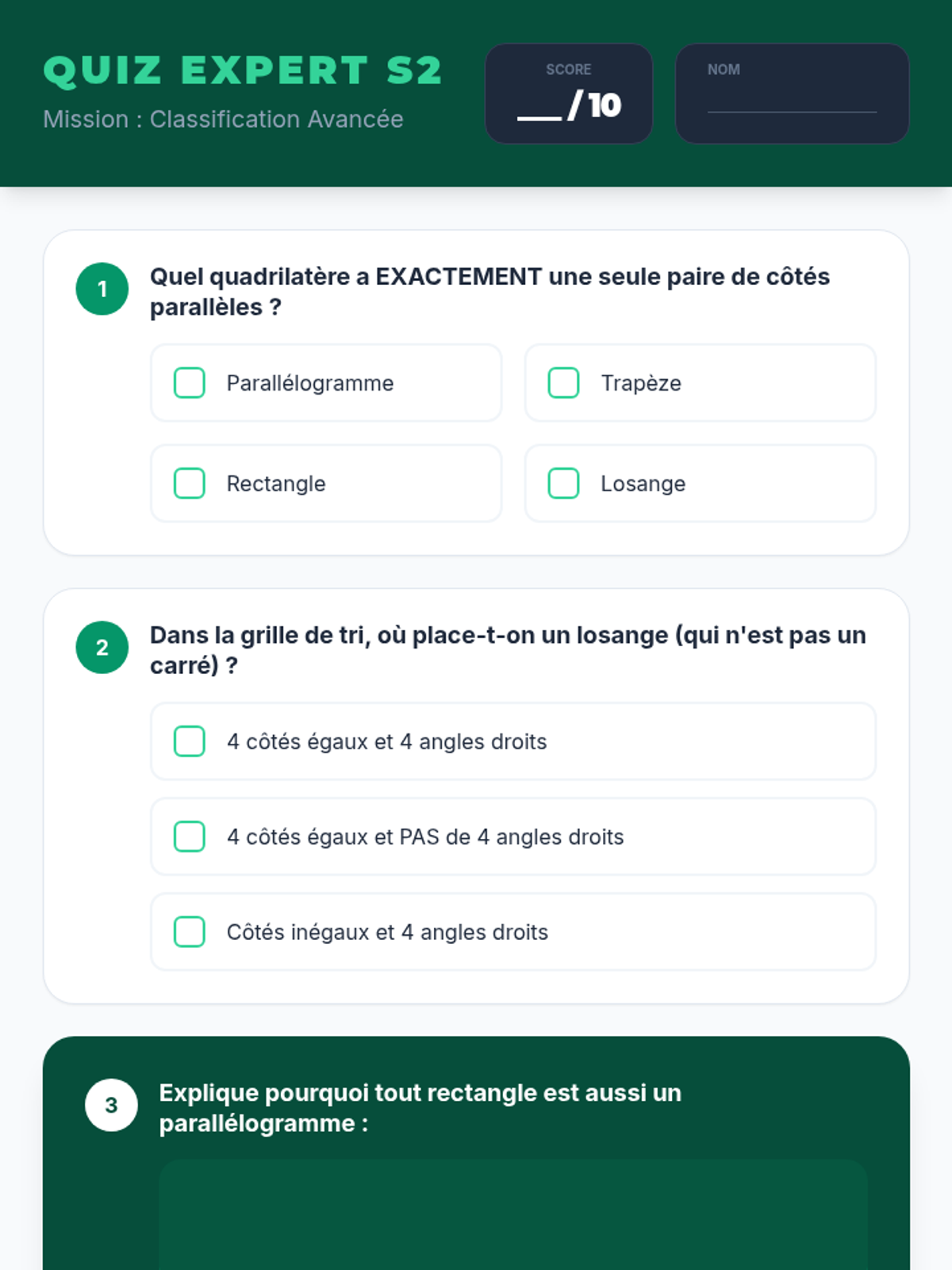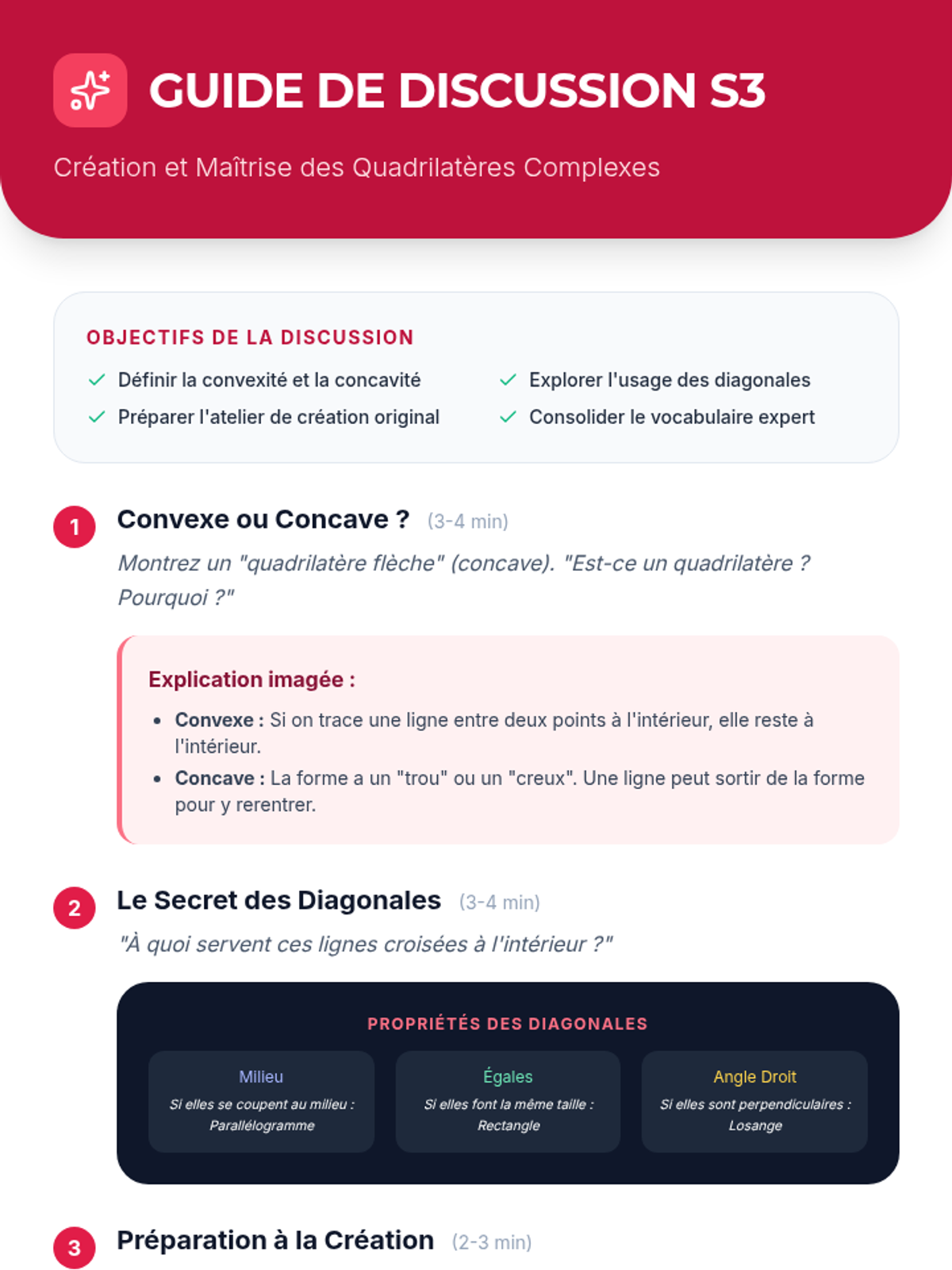 Cette unité de 3 séances guide les élèves de CE2 à la découverte des quadrilatères, explorant leurs propriétés par le jeu, le dessin et la classification. Les élèves développent leur vocabulaire géométrique et leur raisonnement spatial pour devenir experts en formes à quatre côtés.
