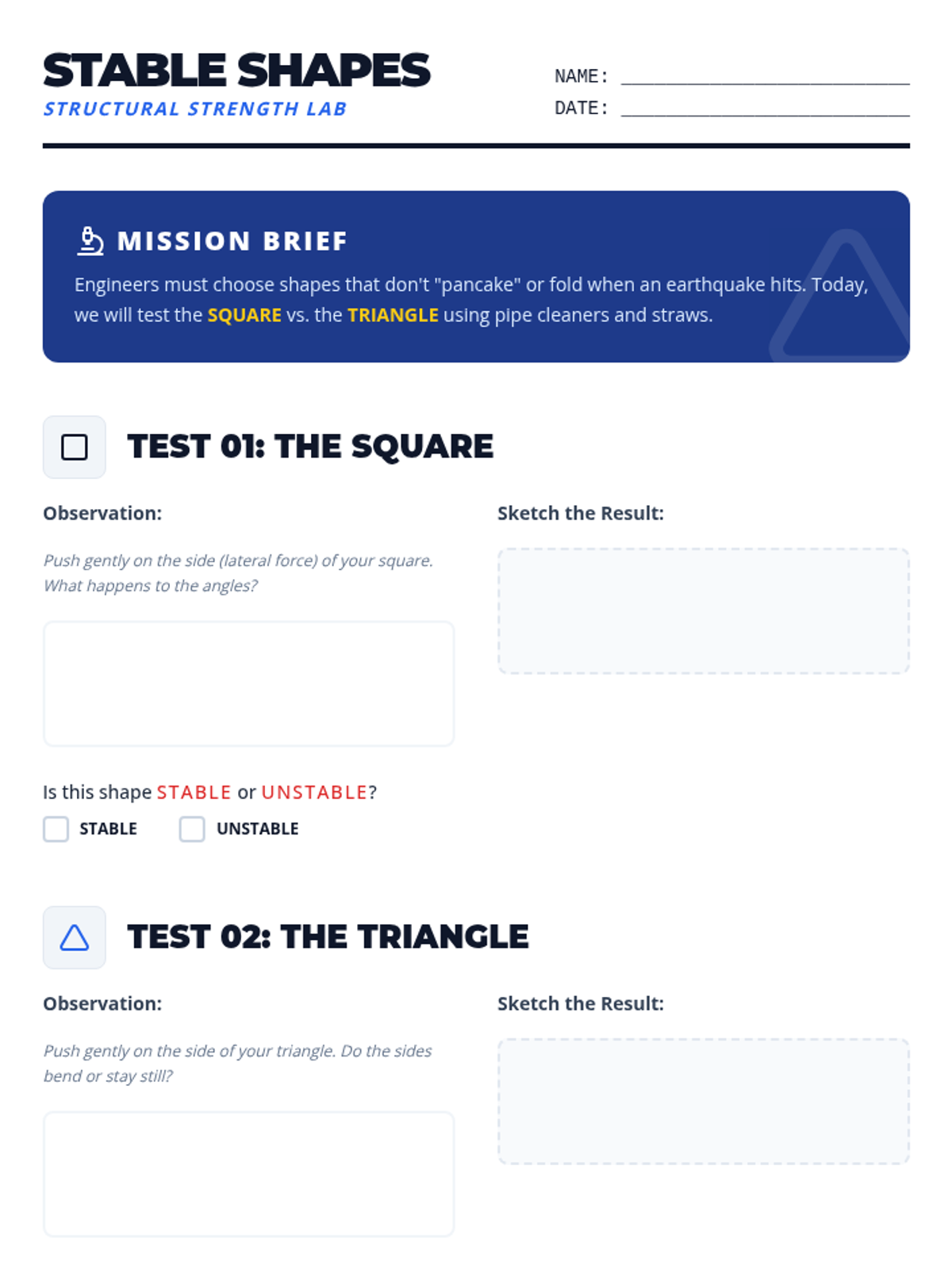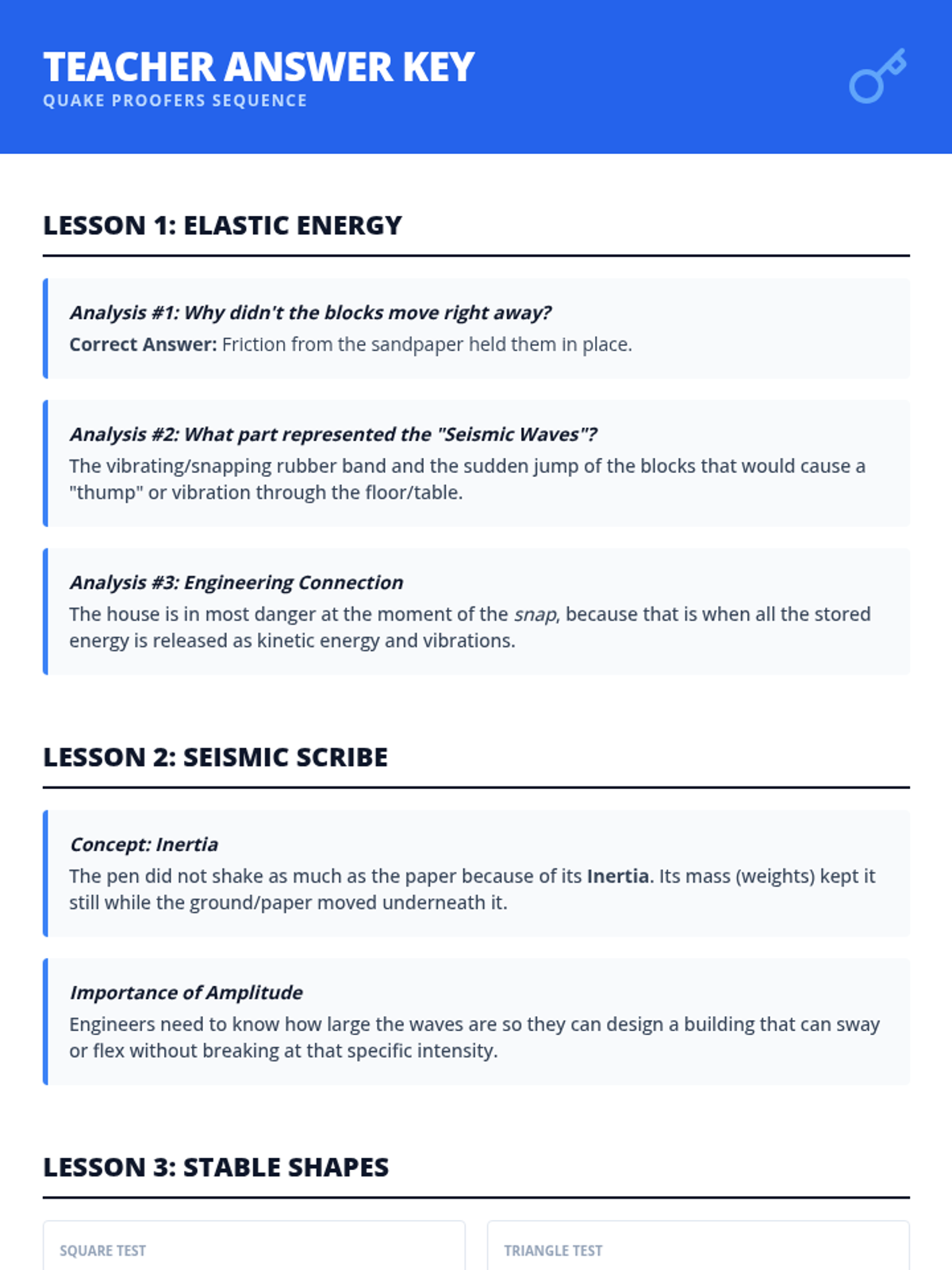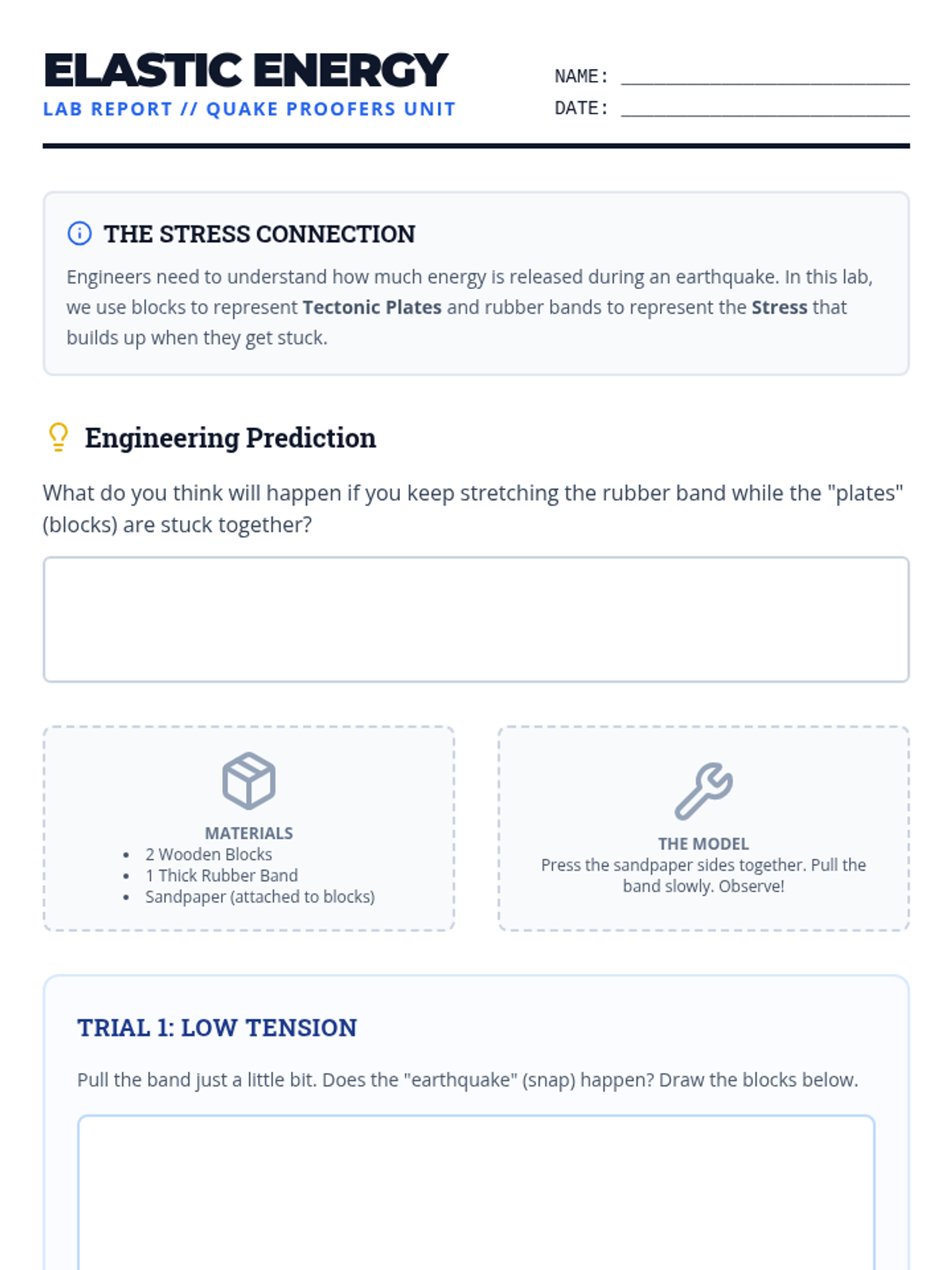 A 4th-grade engineering and earth science sequence exploring how tectonic plate movements create earthquakes and how engineers design structures to withstand seismic forces through inquiry-based experiments and a final design challenge.