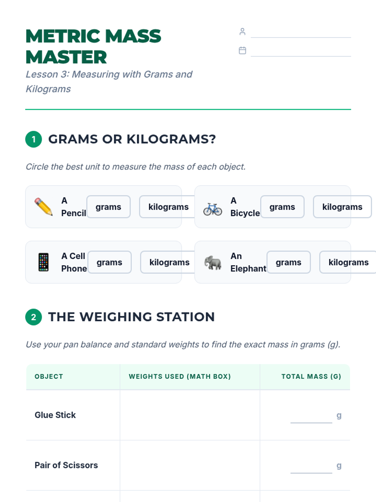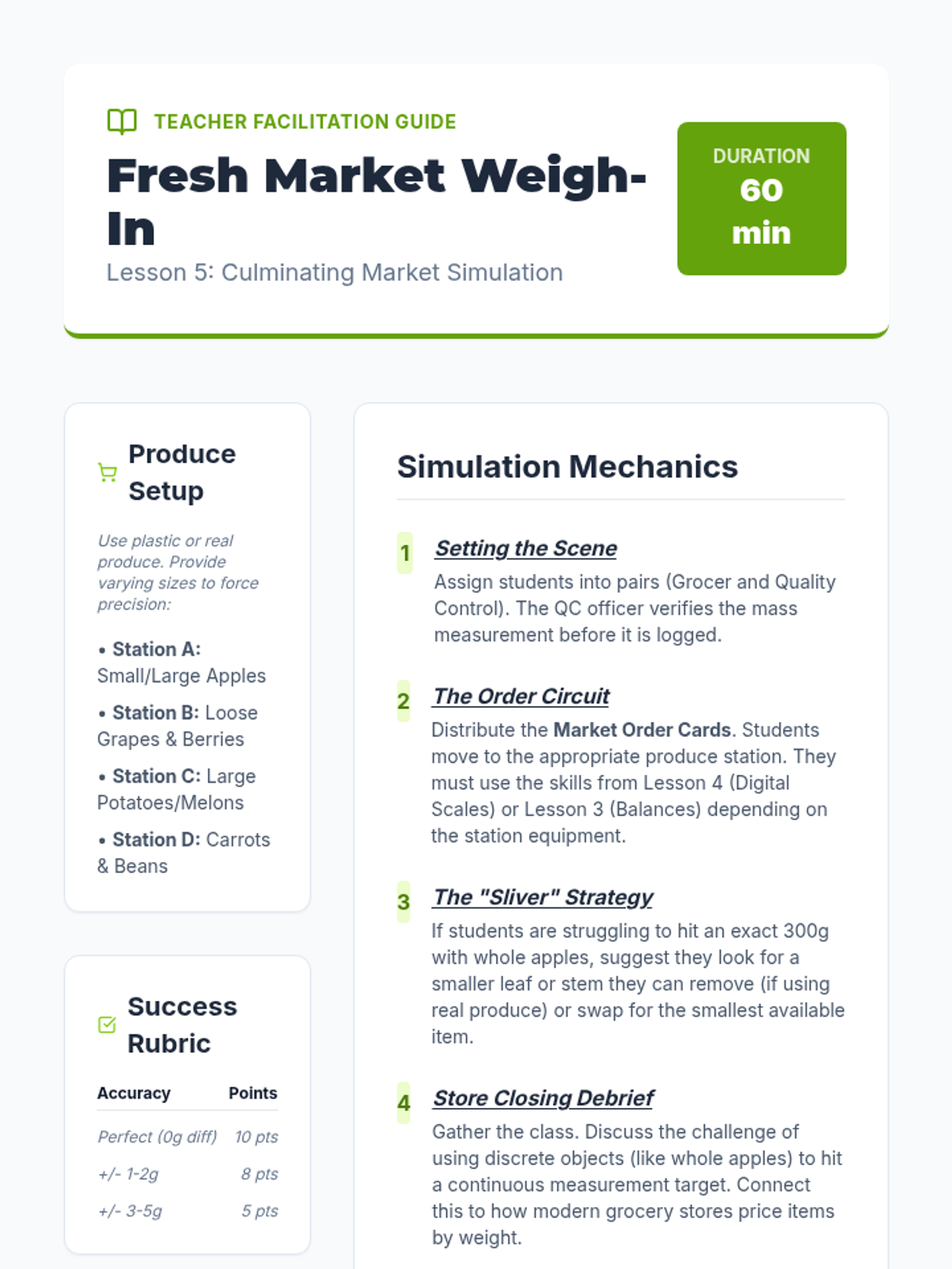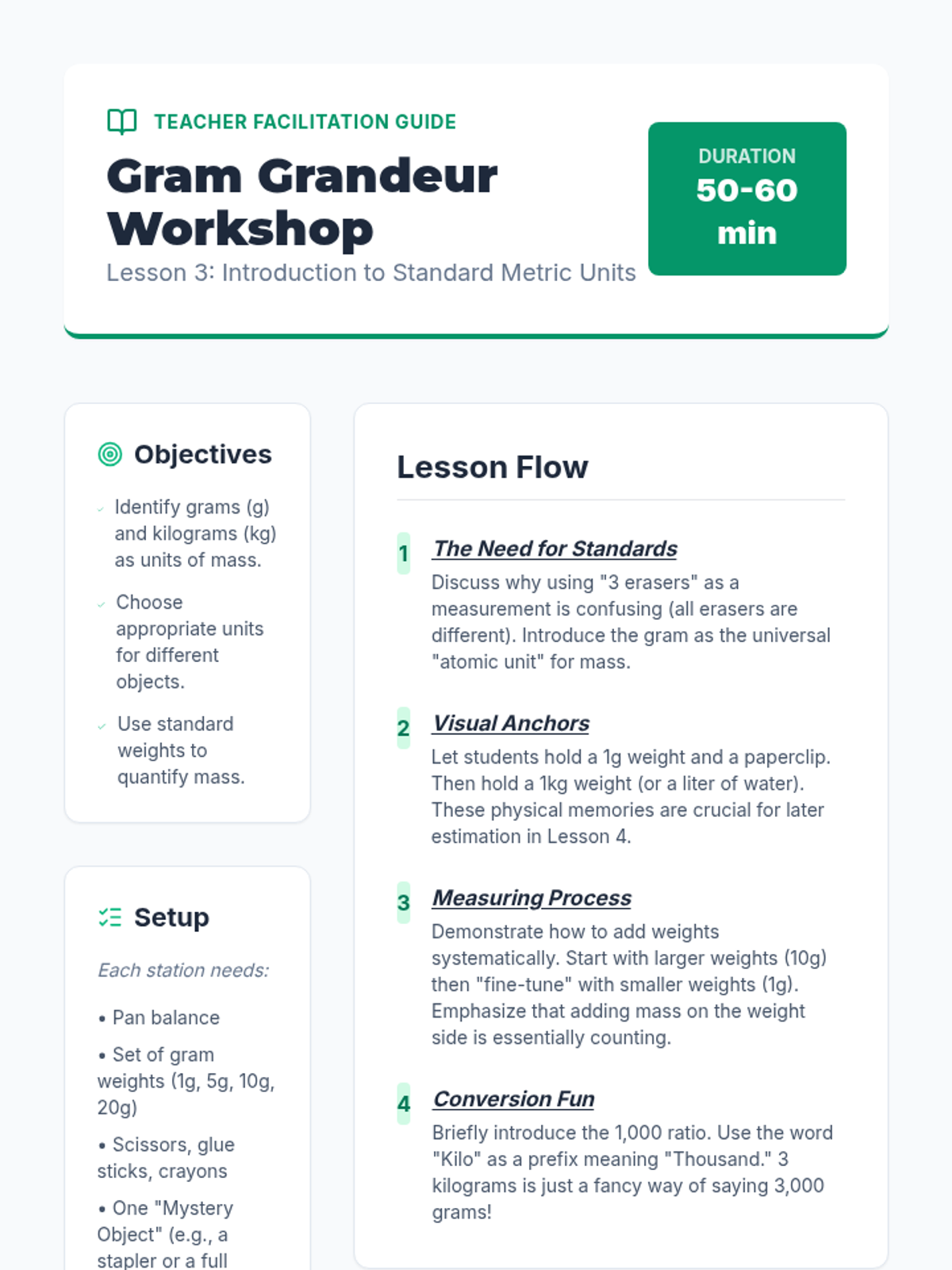 A 5-lesson sequence for 3rd graders focused on understanding mass using metric units (grams and kilograms). Students progress from qualitative comparisons to using pan balances, standard weights, digital scales, and finally applying their skills in a realistic market simulation.