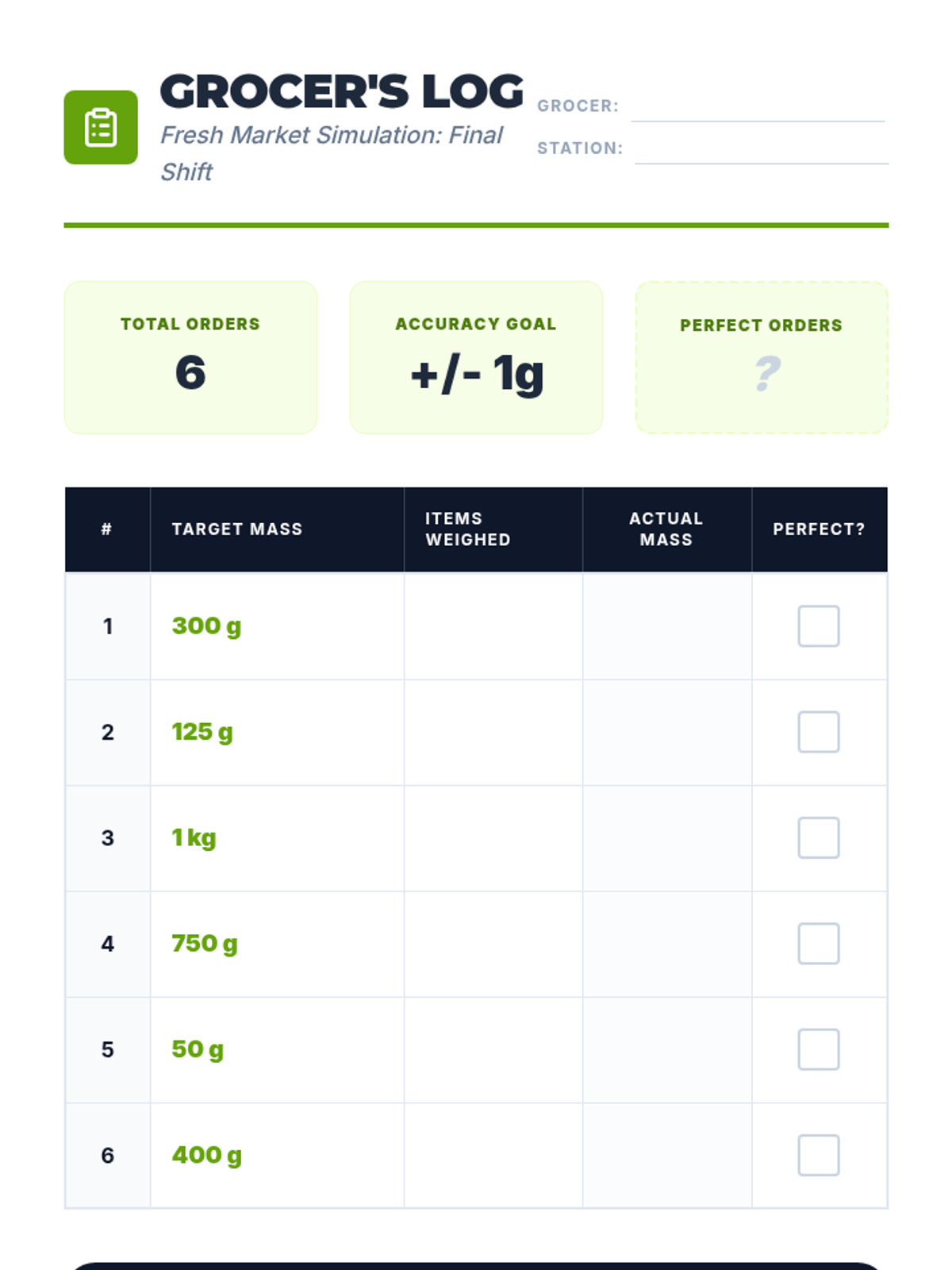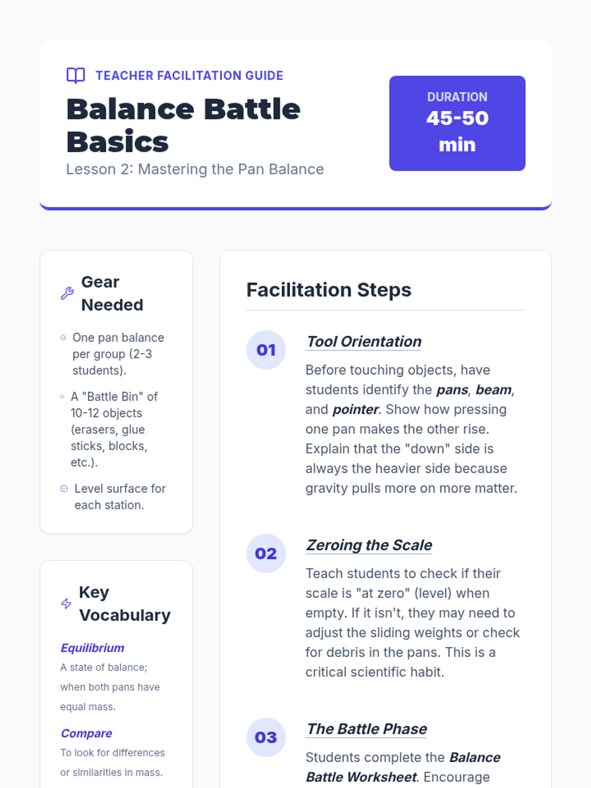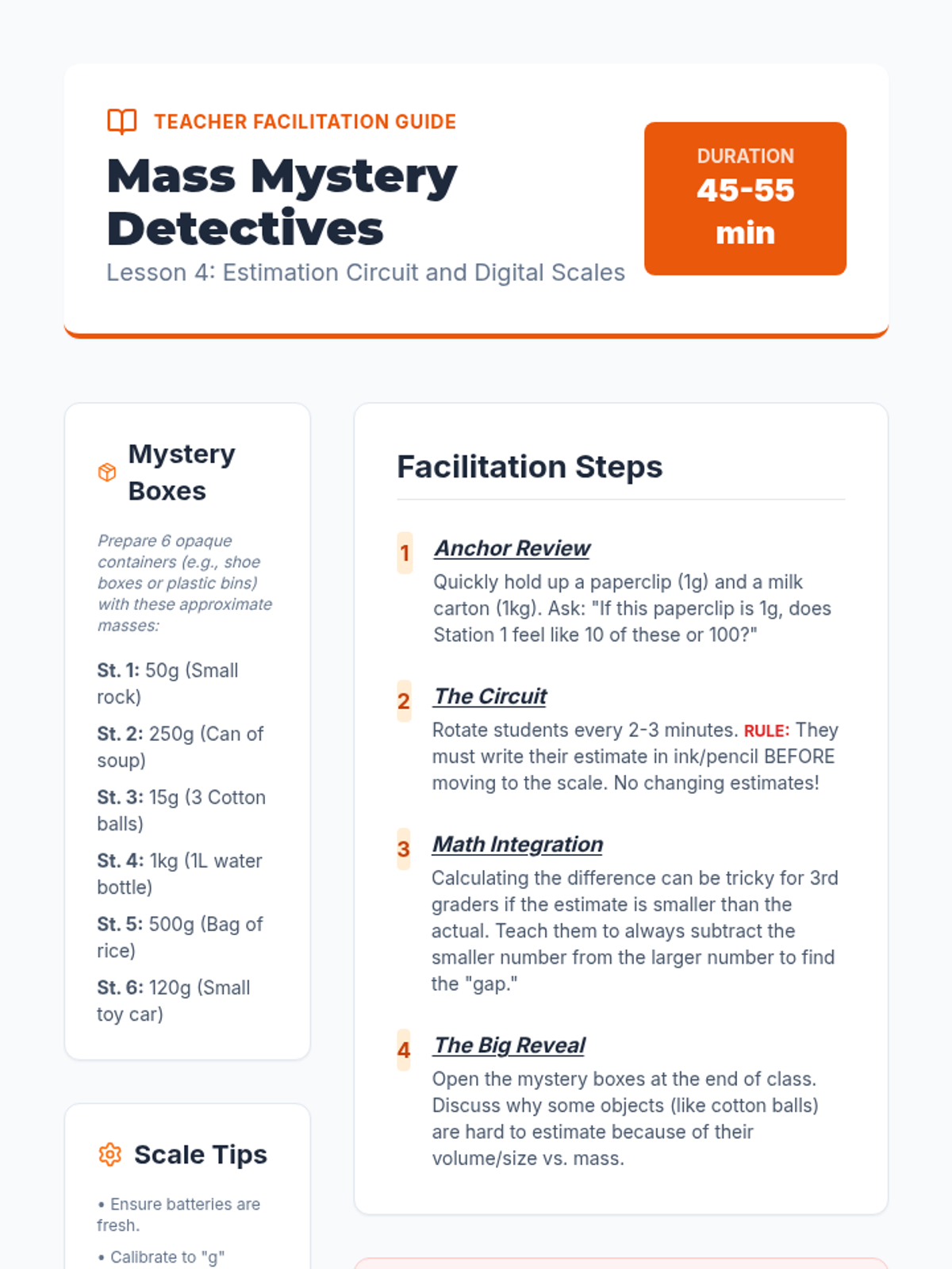 A 5-lesson sequence for 3rd graders focused on understanding mass using metric units (grams and kilograms). Students progress from qualitative comparisons to using pan balances, standard weights, digital scales, and finally applying their skills in a realistic market simulation.