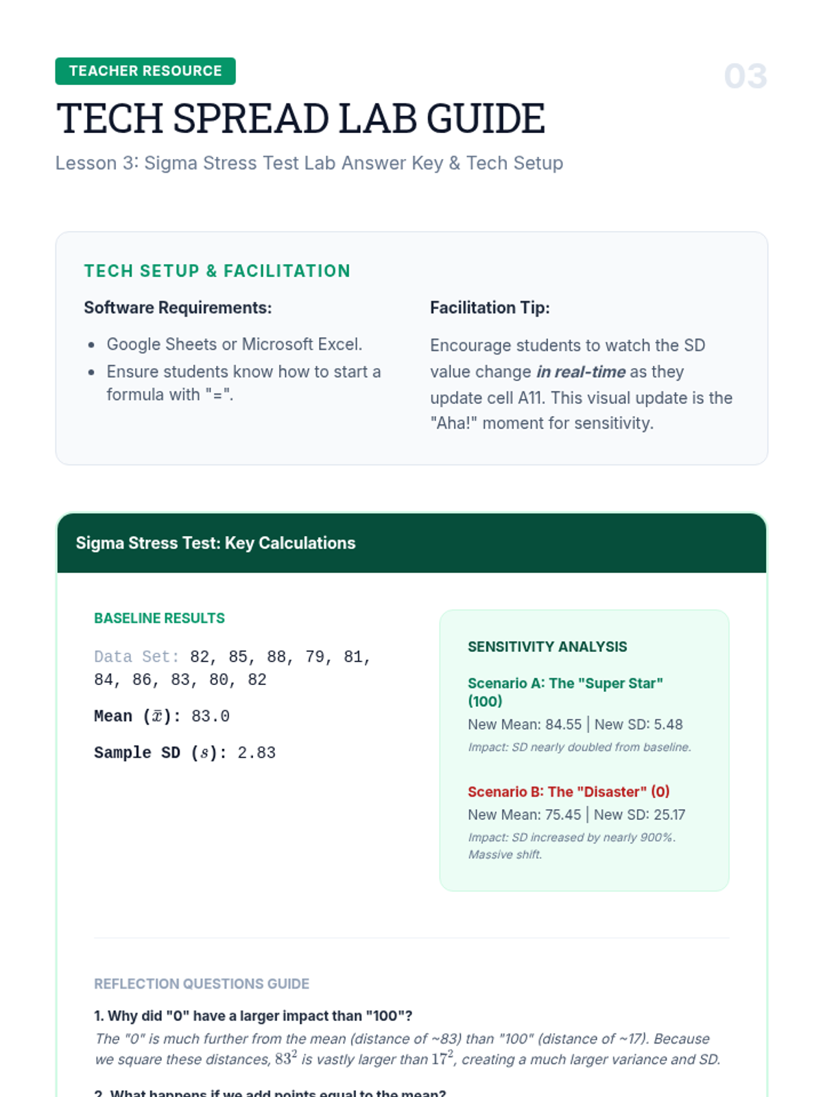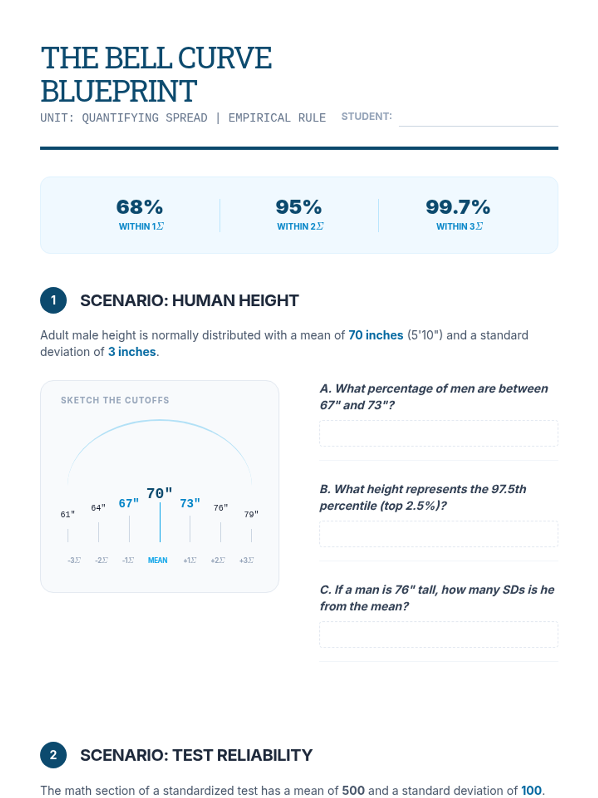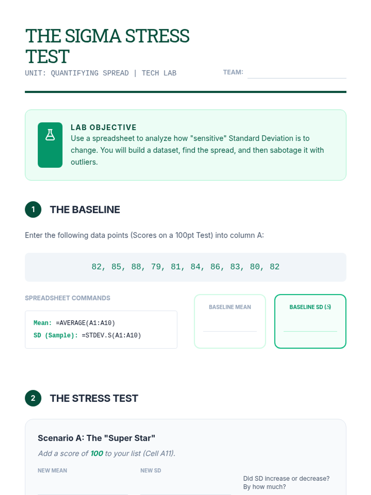 A 10th-grade statistics workshop exploring the mathematical transition from Mean Absolute Deviation to Standard Deviation. Students analyze data spread, the logic of variance, and the application of the Empirical Rule and Z-scores to real-world datasets.