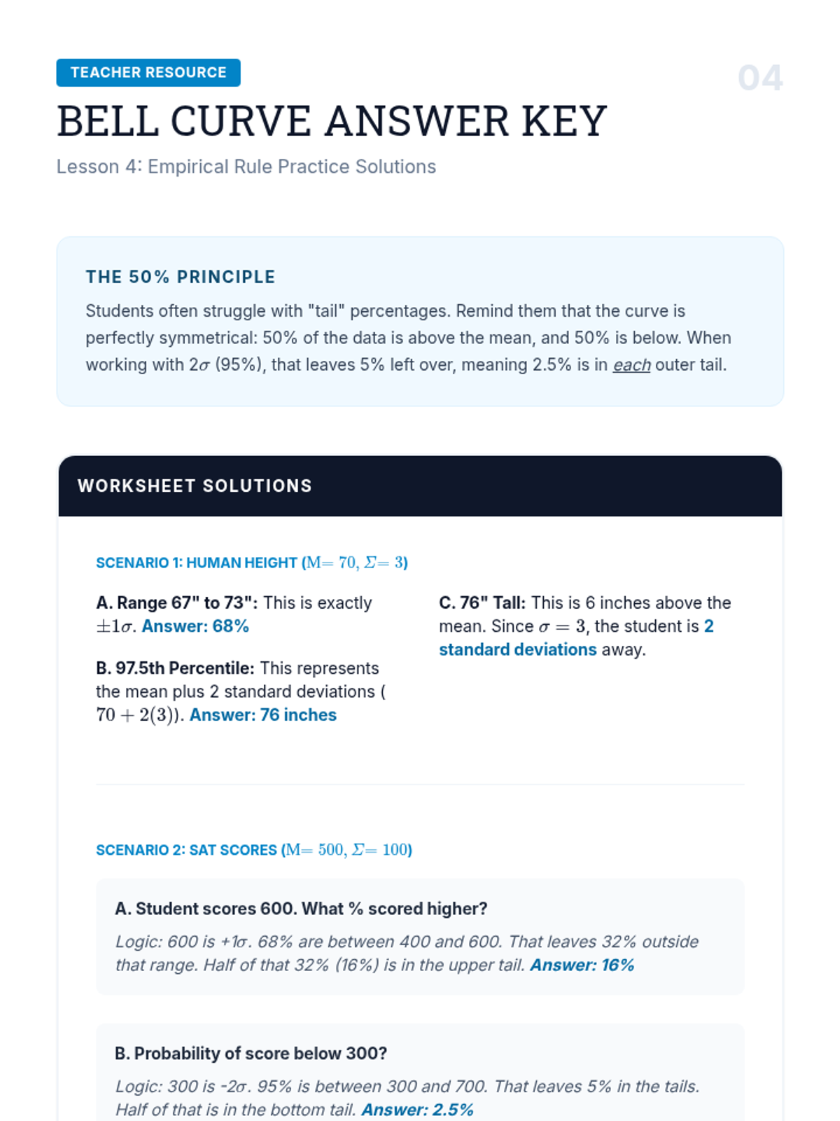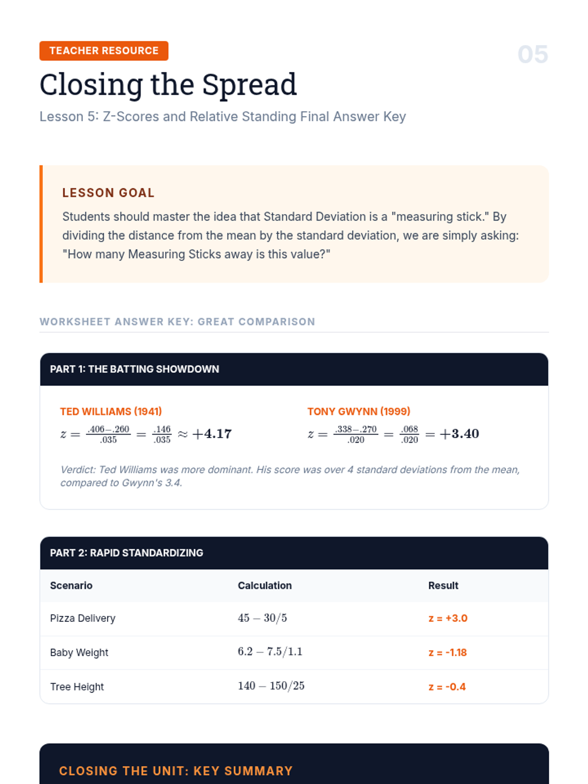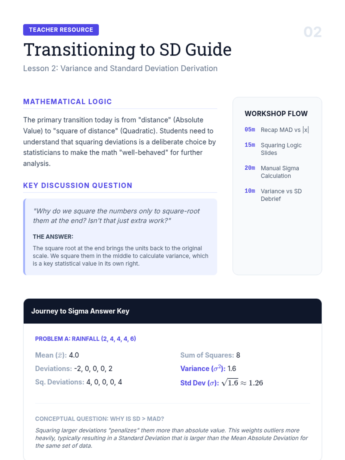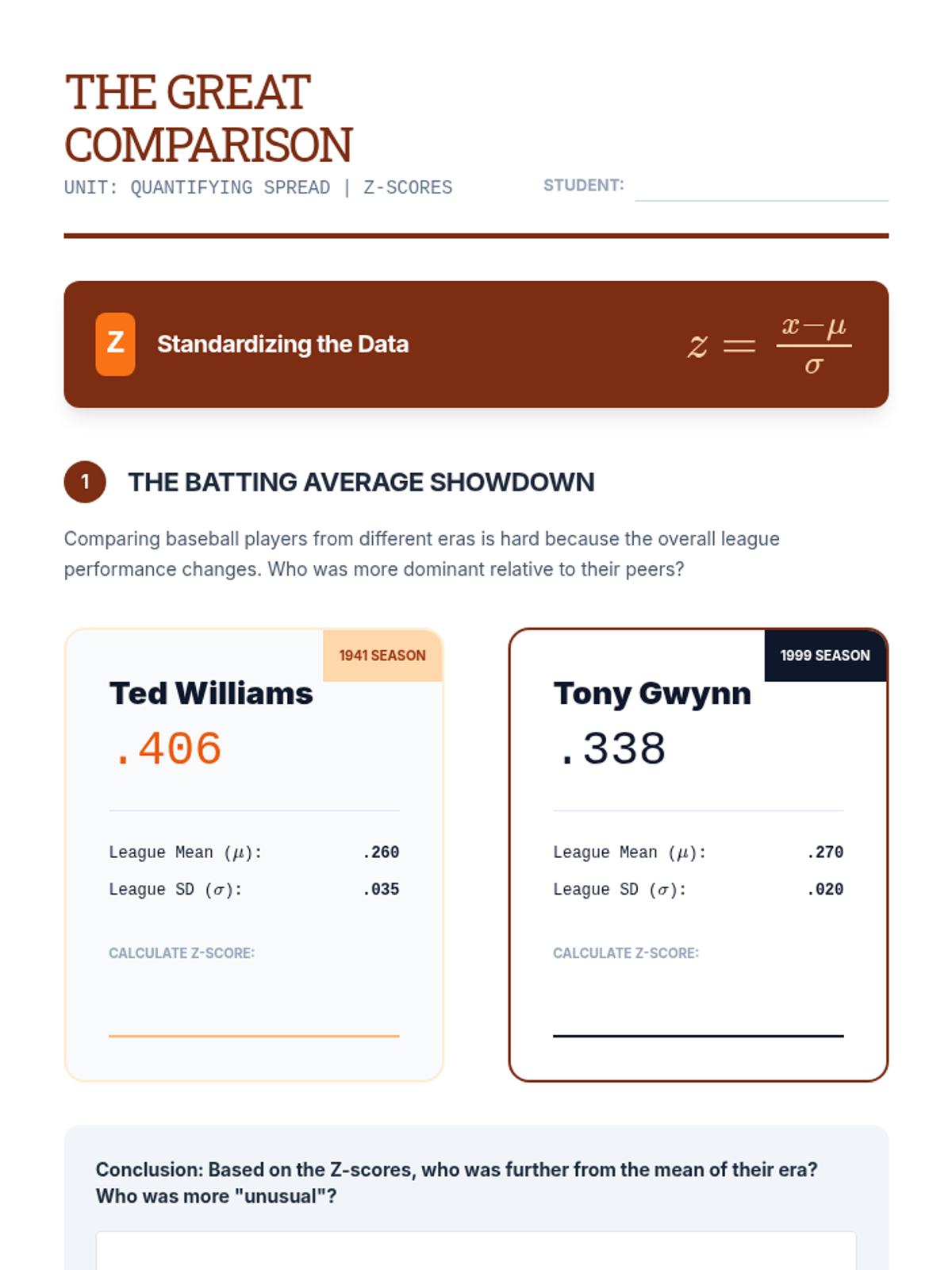 A 10th-grade statistics workshop exploring the mathematical transition from Mean Absolute Deviation to Standard Deviation. Students analyze data spread, the logic of variance, and the application of the Empirical Rule and Z-scores to real-world datasets.