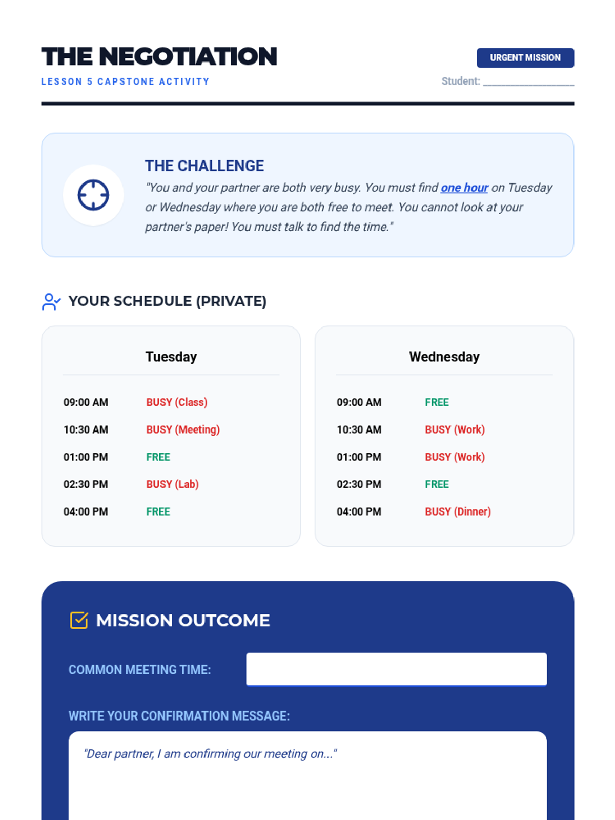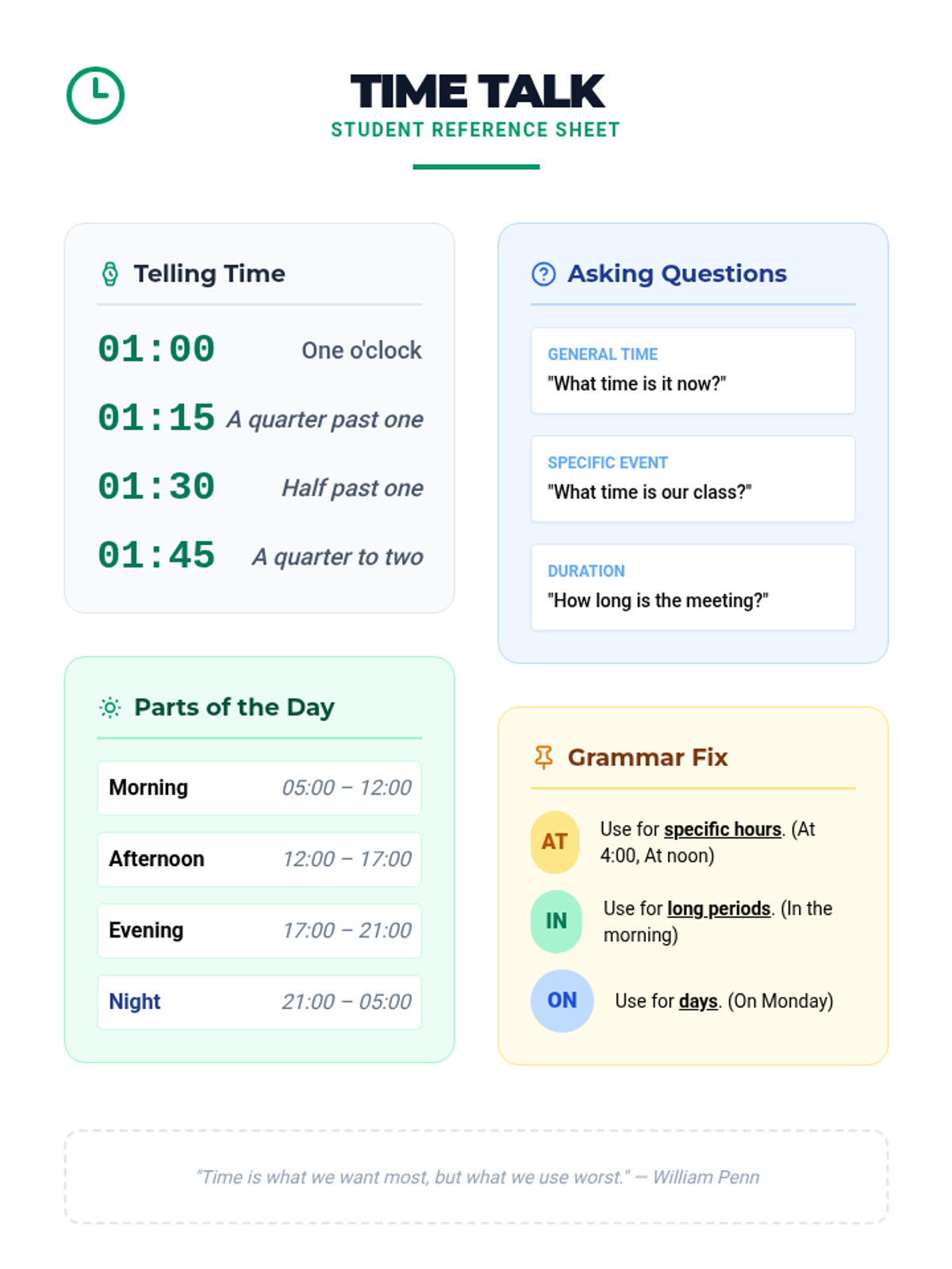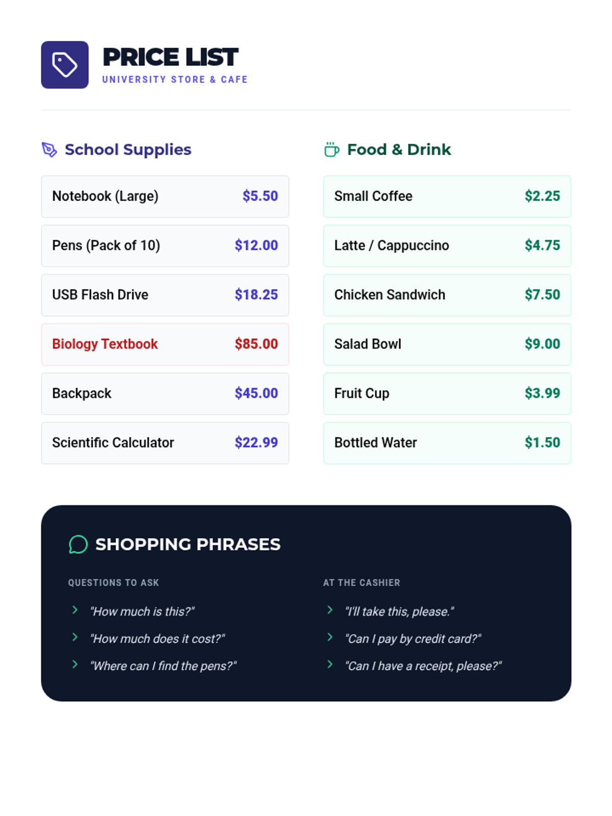 A comprehensive ESL sequence for undergraduate students focusing on numbers, time management, and financial transactions within a university context. Students move from basic numeracy to complex scheduling and budgeting tasks using real-world academic scenarios.