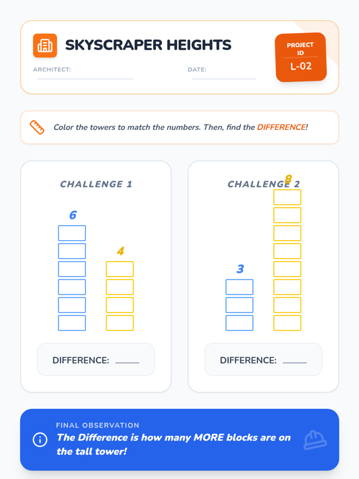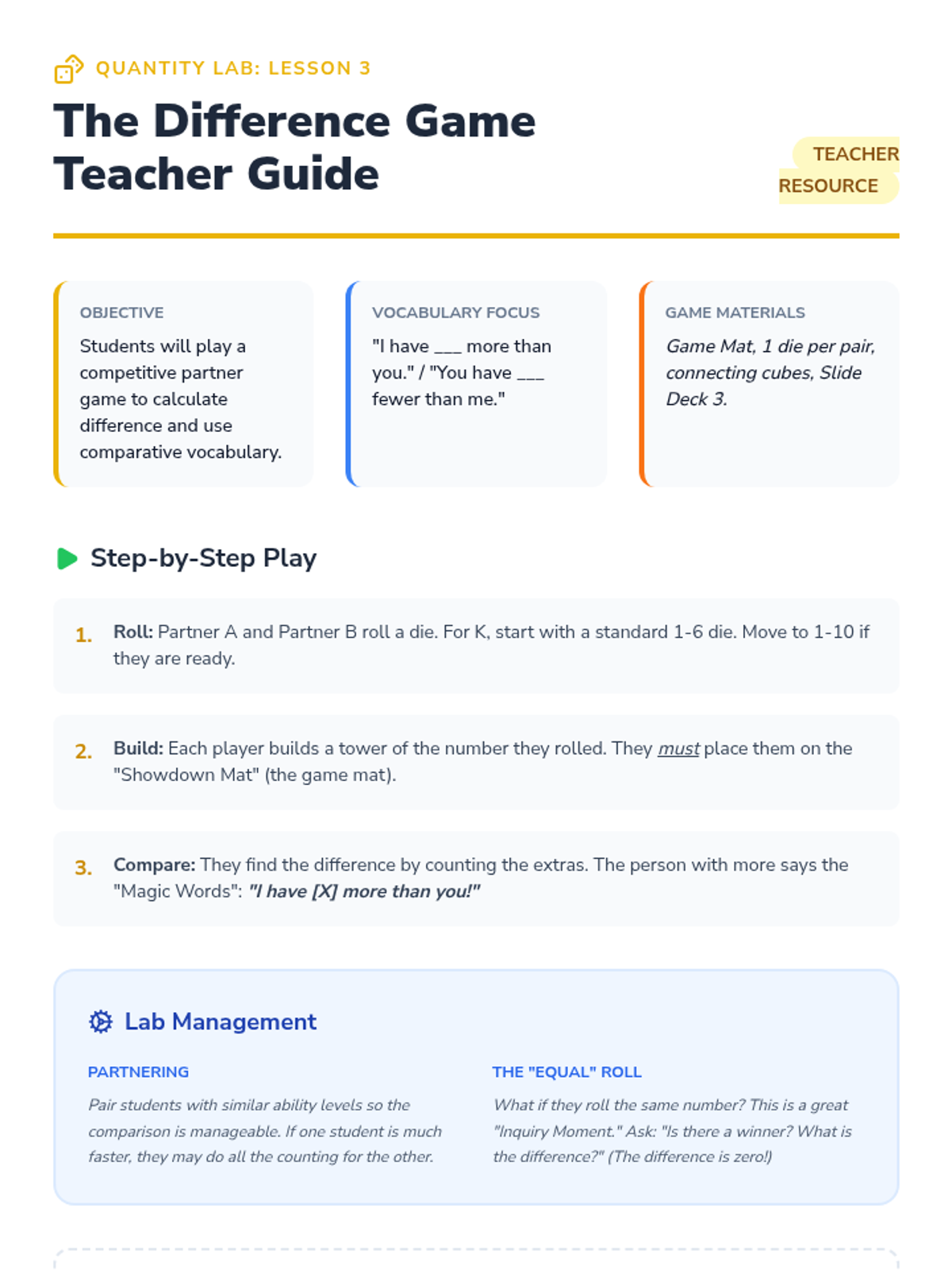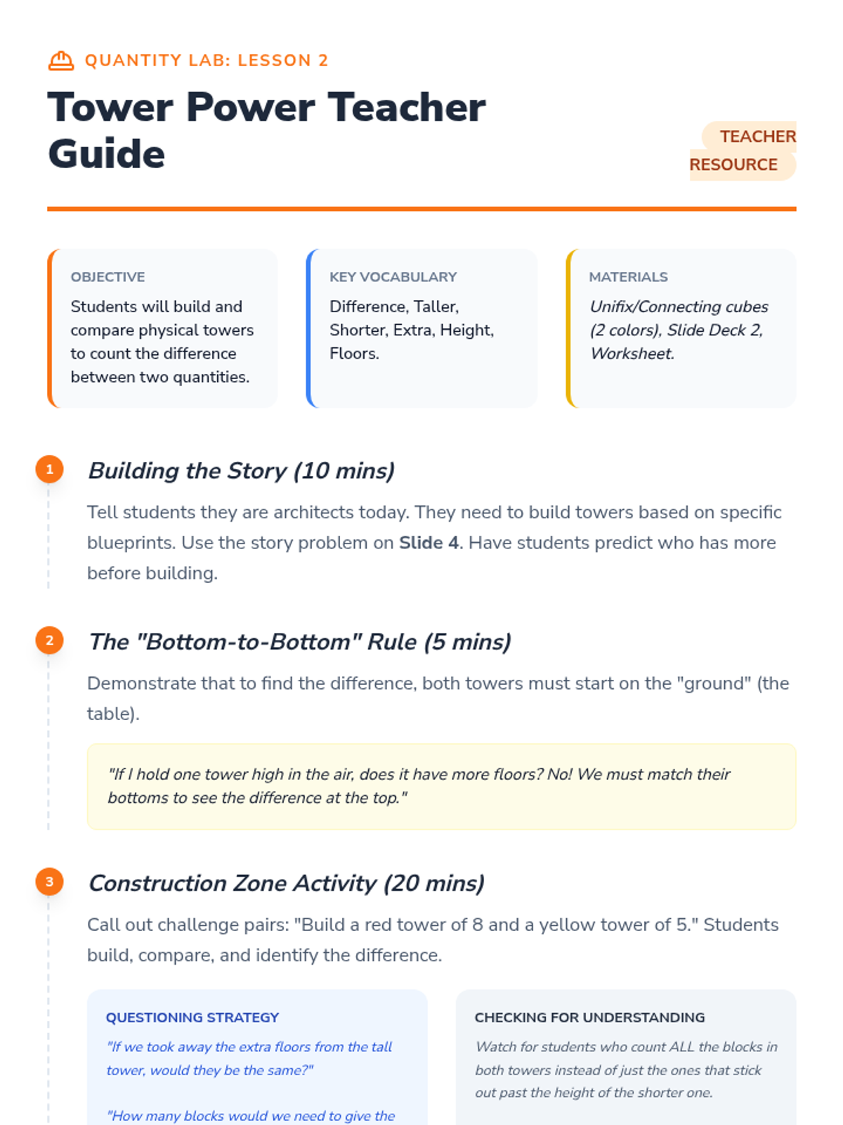 A Kindergarten math sequence focusing on comparison problems. Students use matching, tower building, and data analysis to understand 'how many more' and 'how many fewer' through inquiry-based activities.