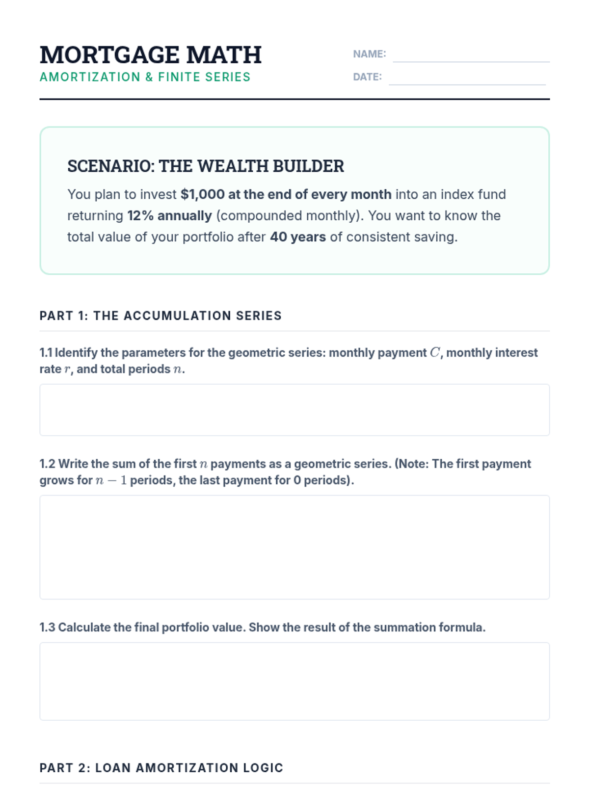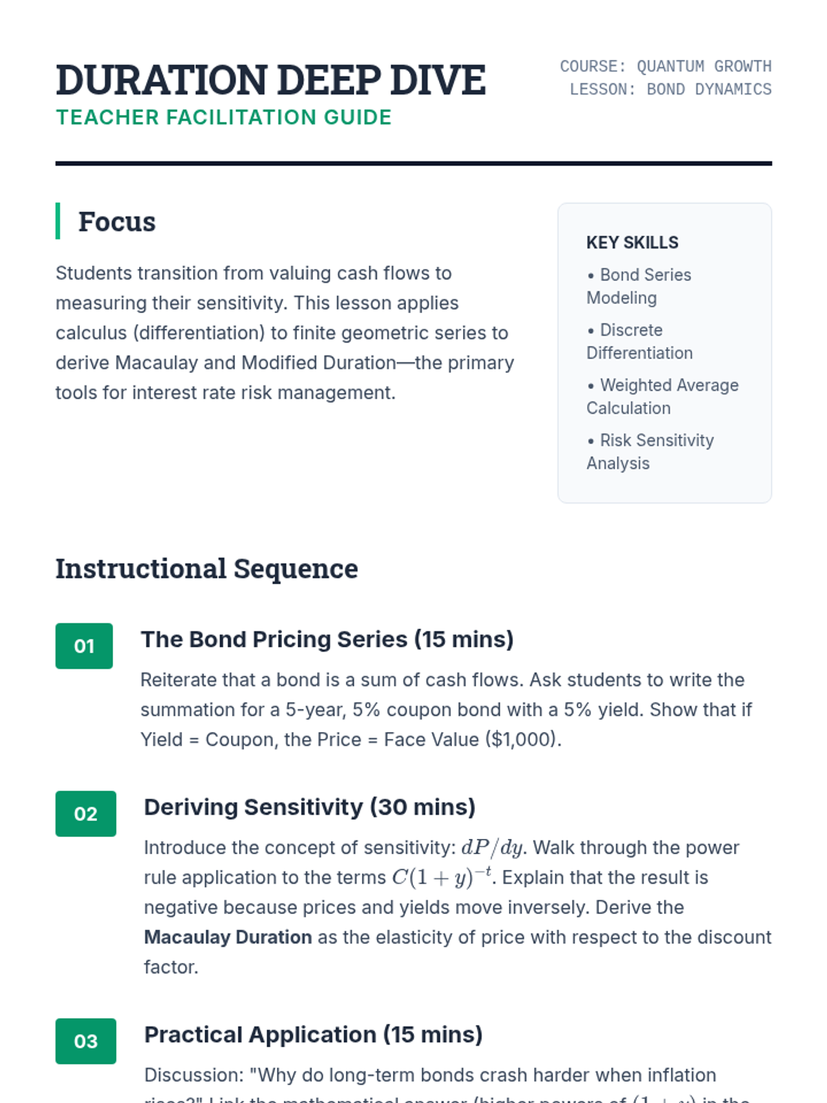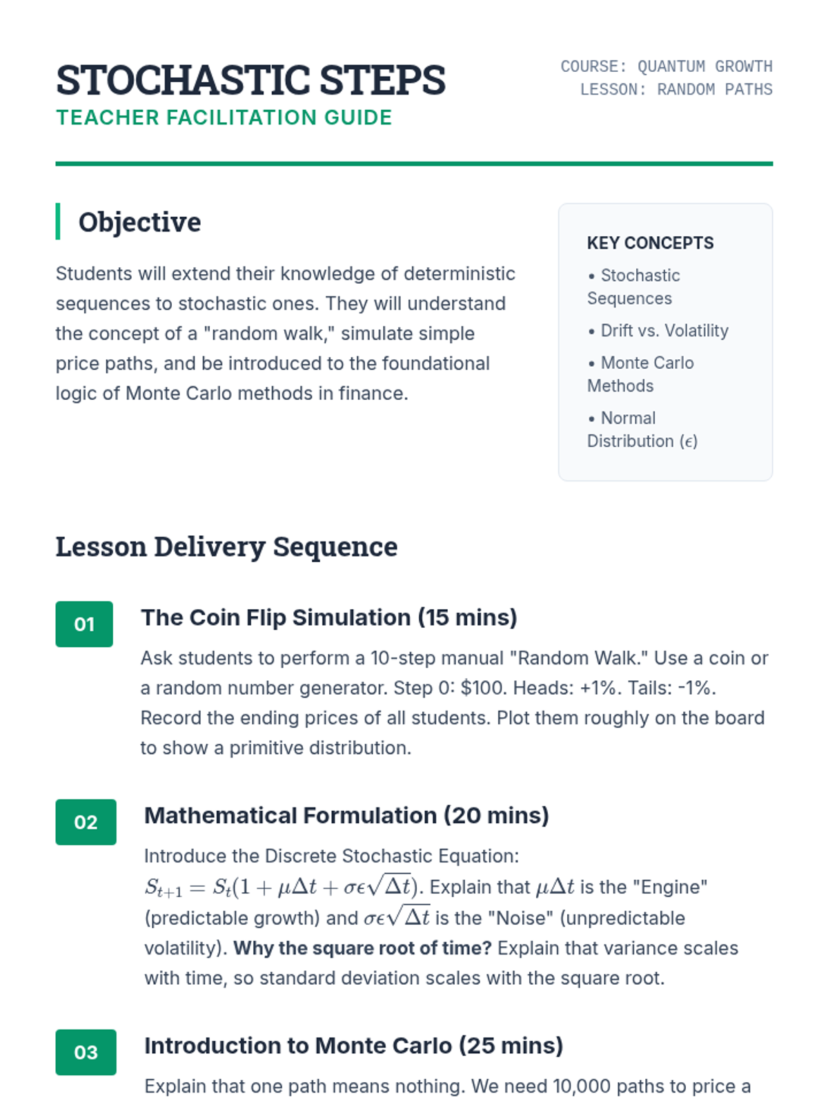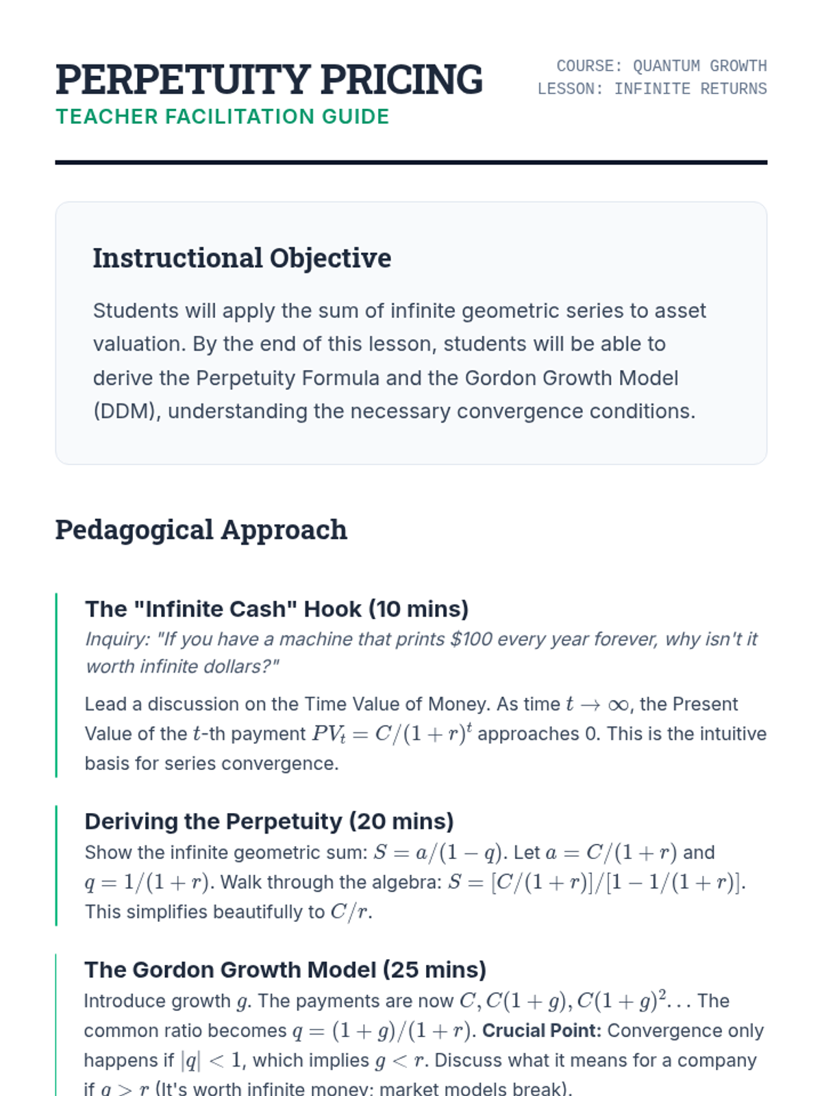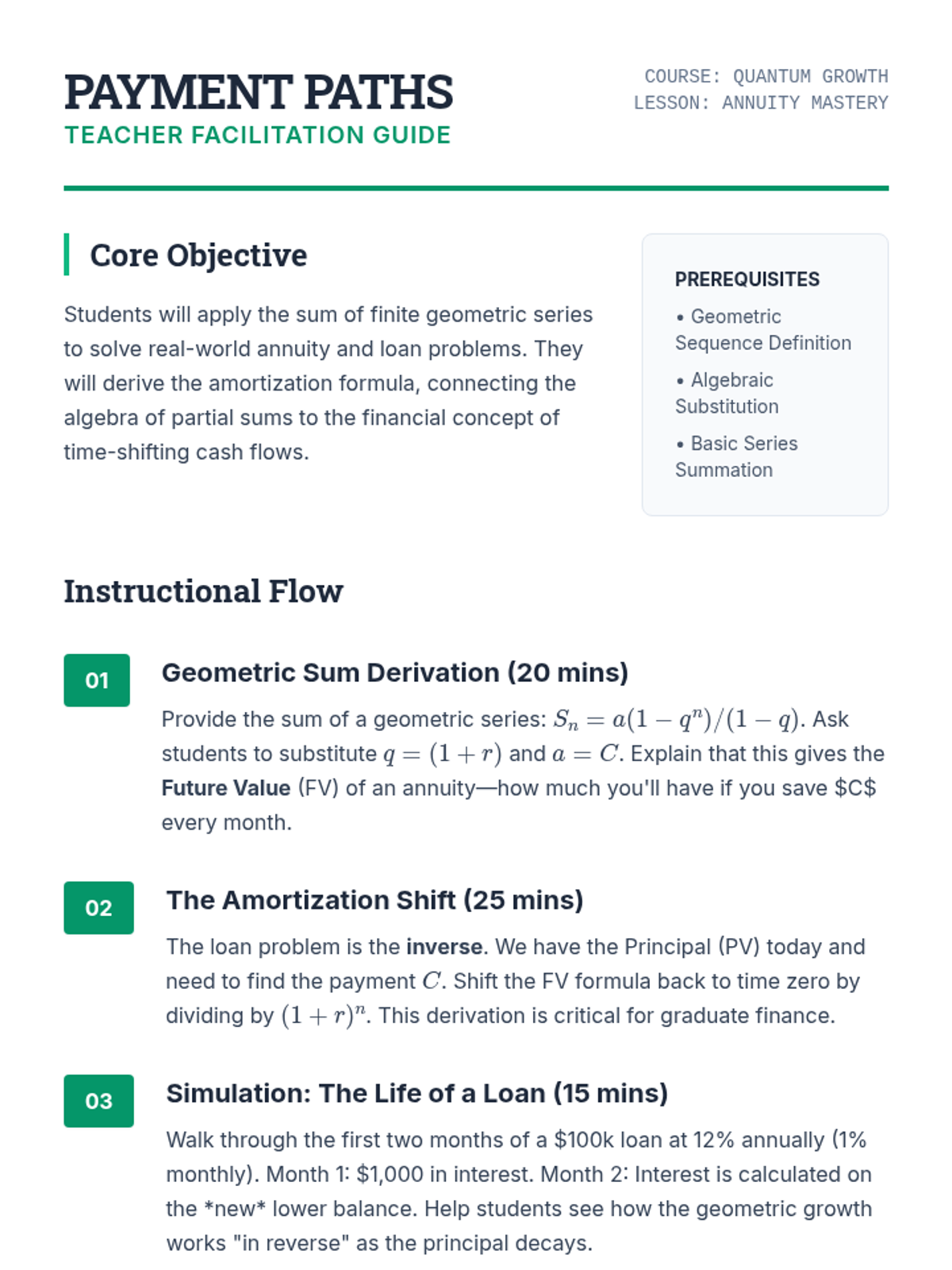 This sequence bridges the gap between discrete mathematics and quantitative finance, focusing on the application of geometric series to asset valuation, loan amortization, and risk management. Graduate students will develop the mathematical foundations for pricing complex financial instruments and understanding market dynamics.