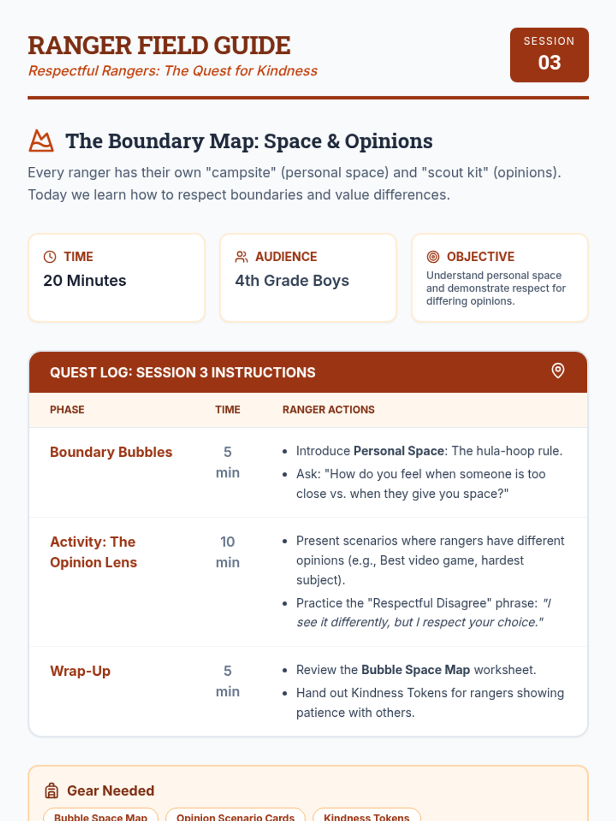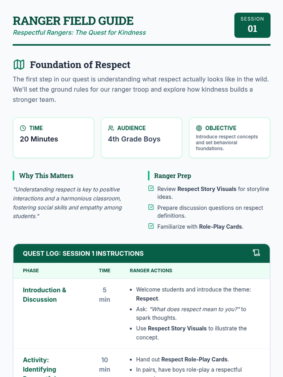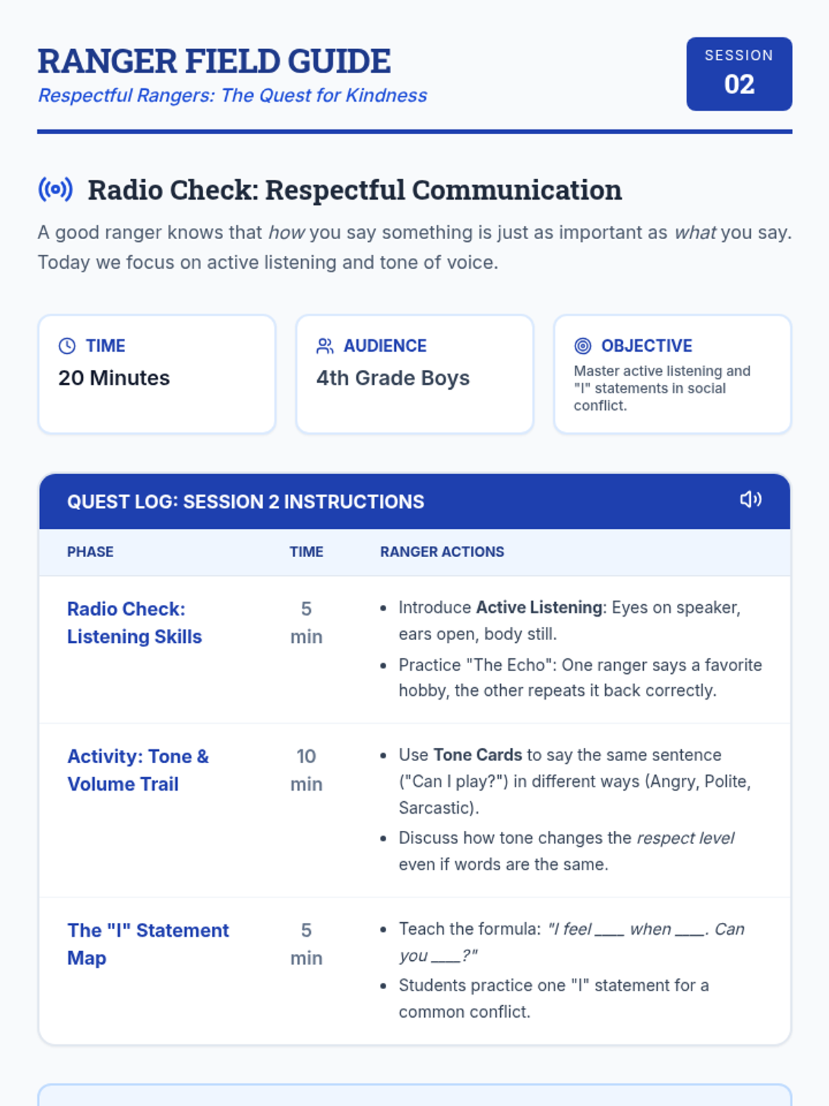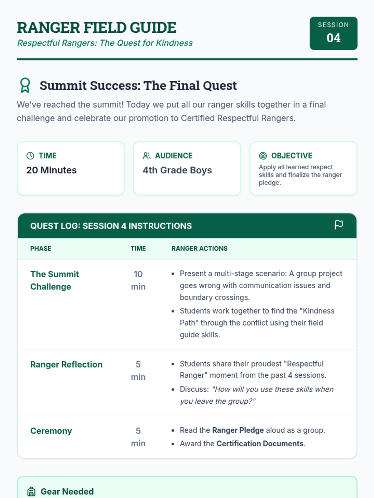 A 4-session social-emotional learning sequence for 4th-grade boys focused on developing respect, communication skills, and empathy through a "Park Ranger" adventure theme.