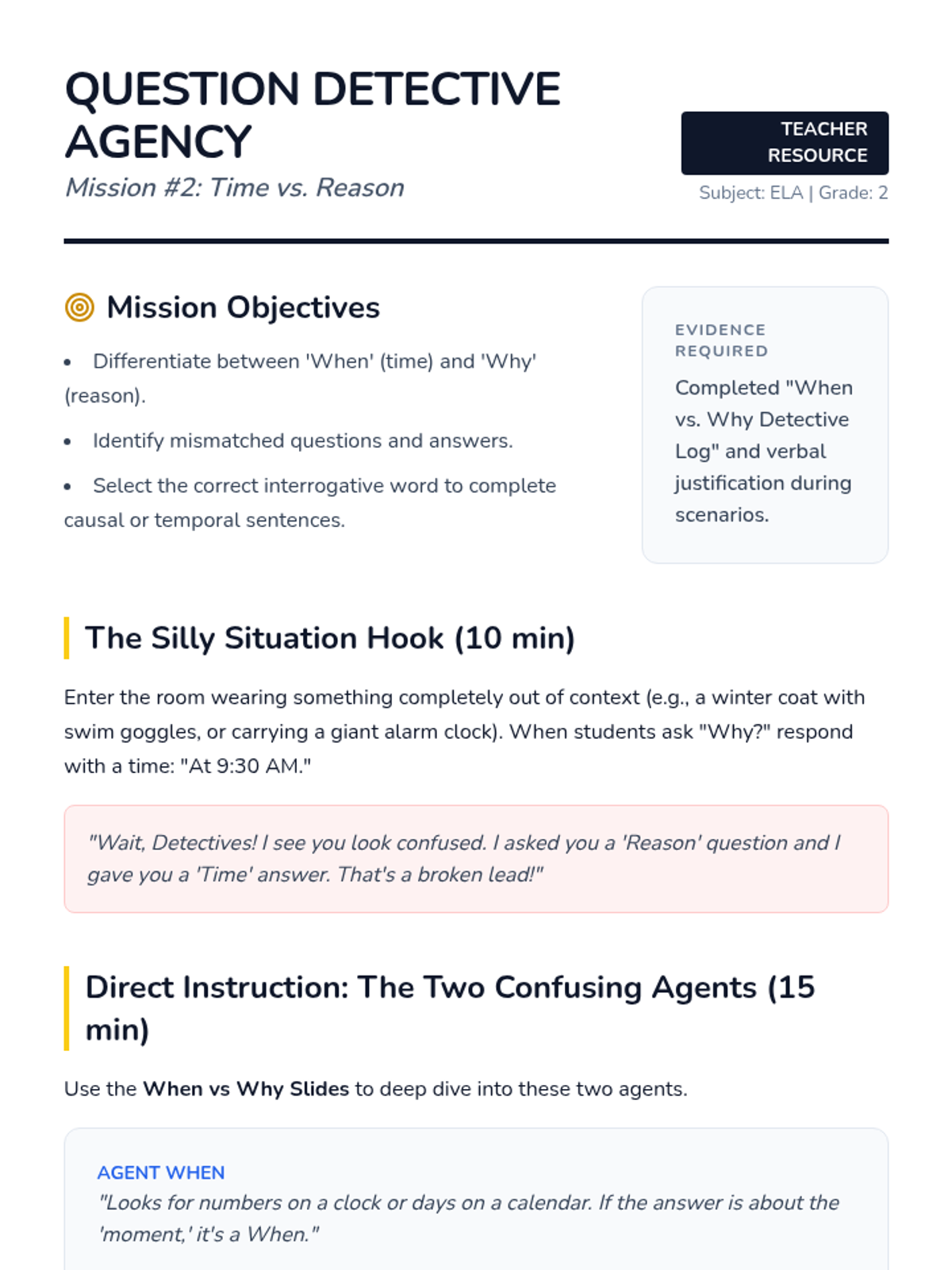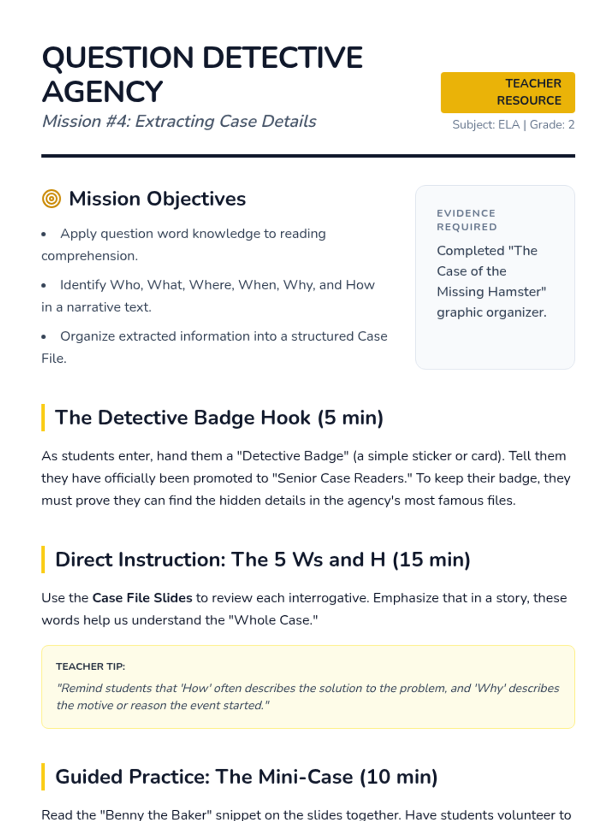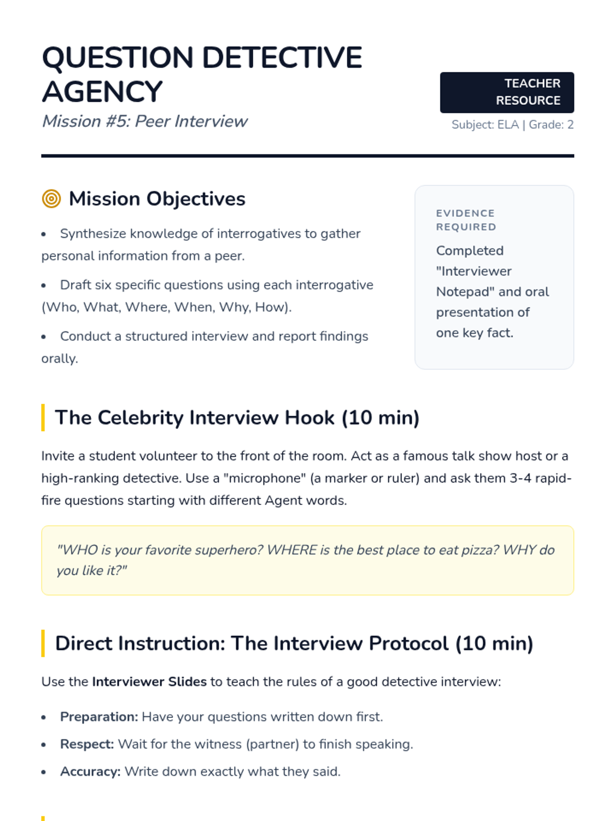 A comprehensive sequence for 2nd Grade ELA that teaches the six primary interrogatives (who, what, where, when, why, how) through a 'Question Detective Agency' theme. Students progress from categorizing question words to building sentences, extracting text details, and conducting peer interviews.