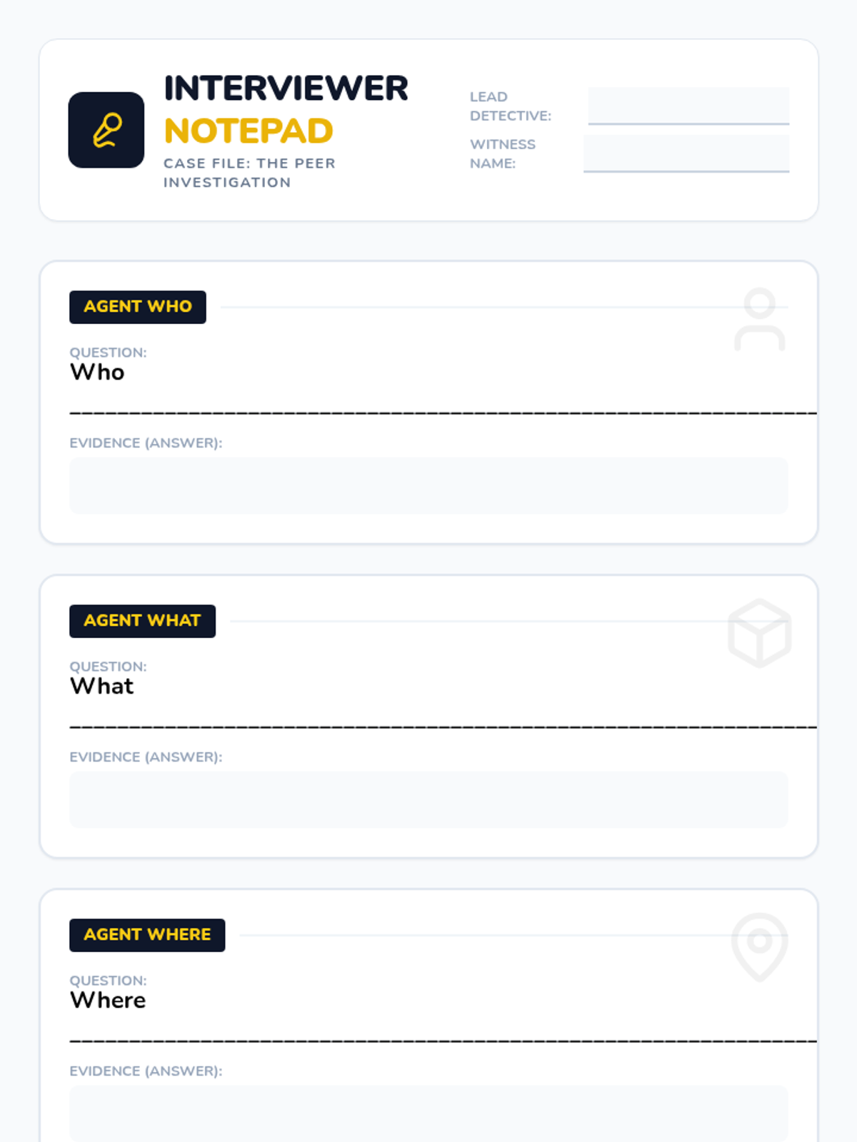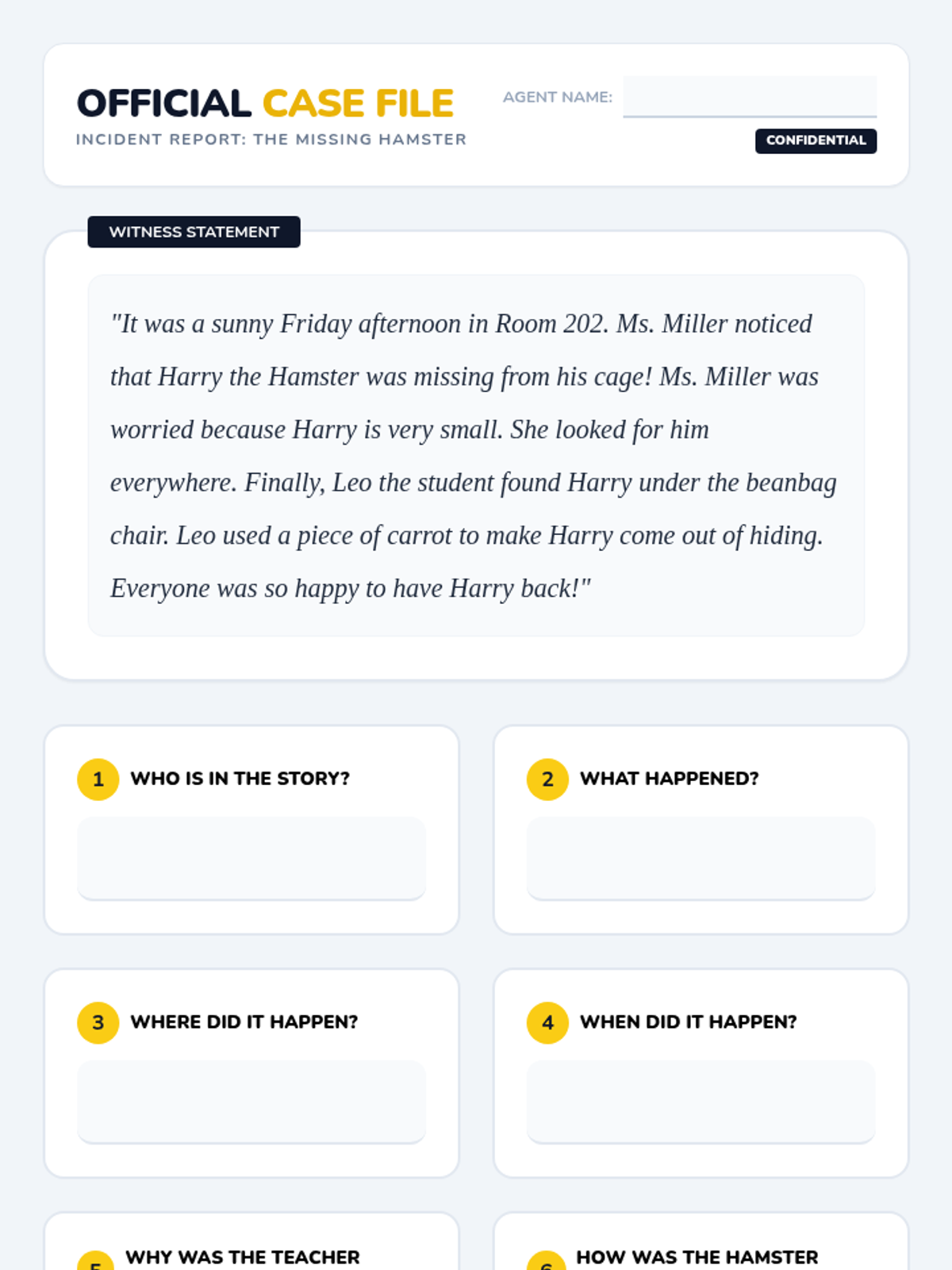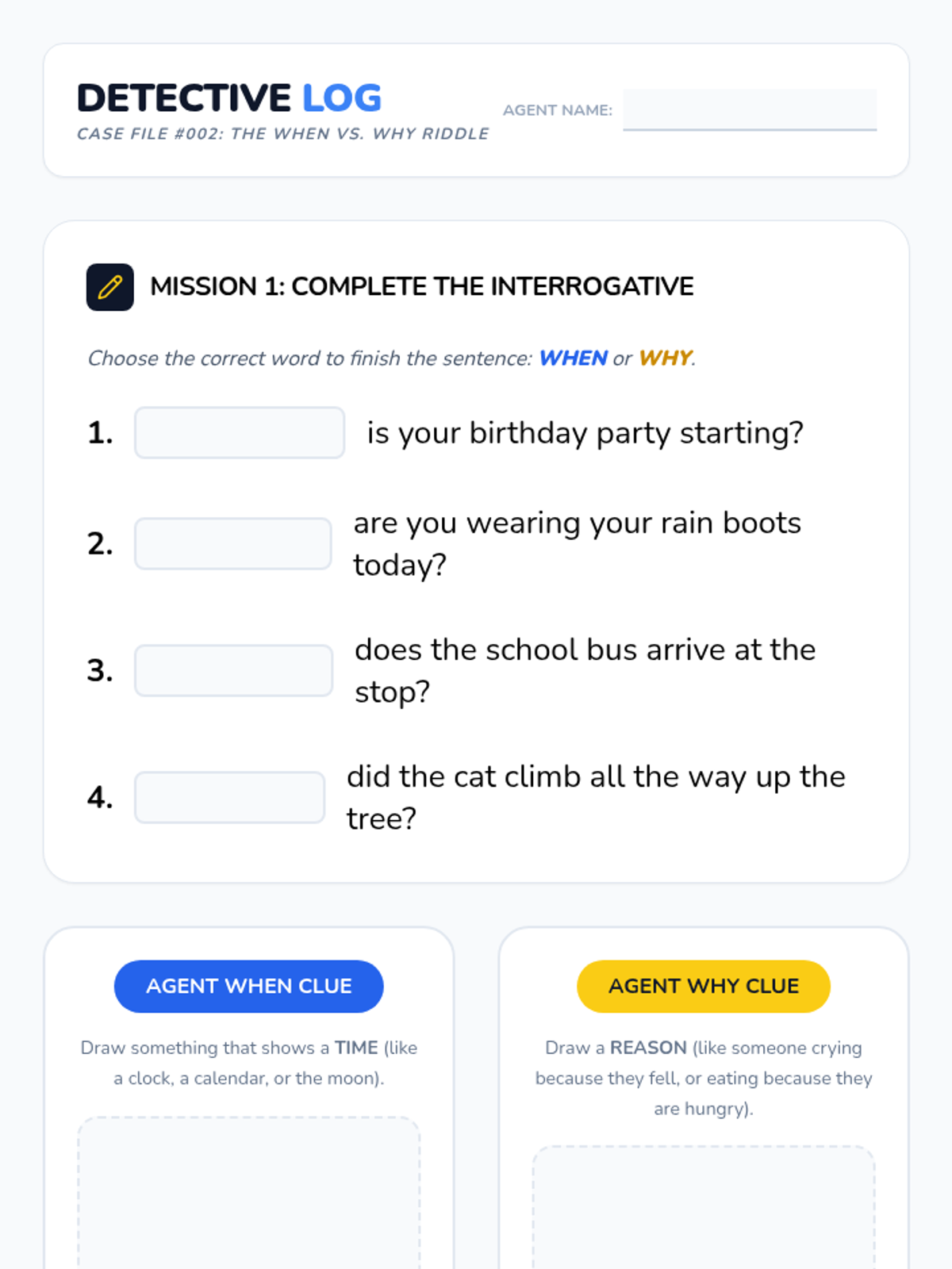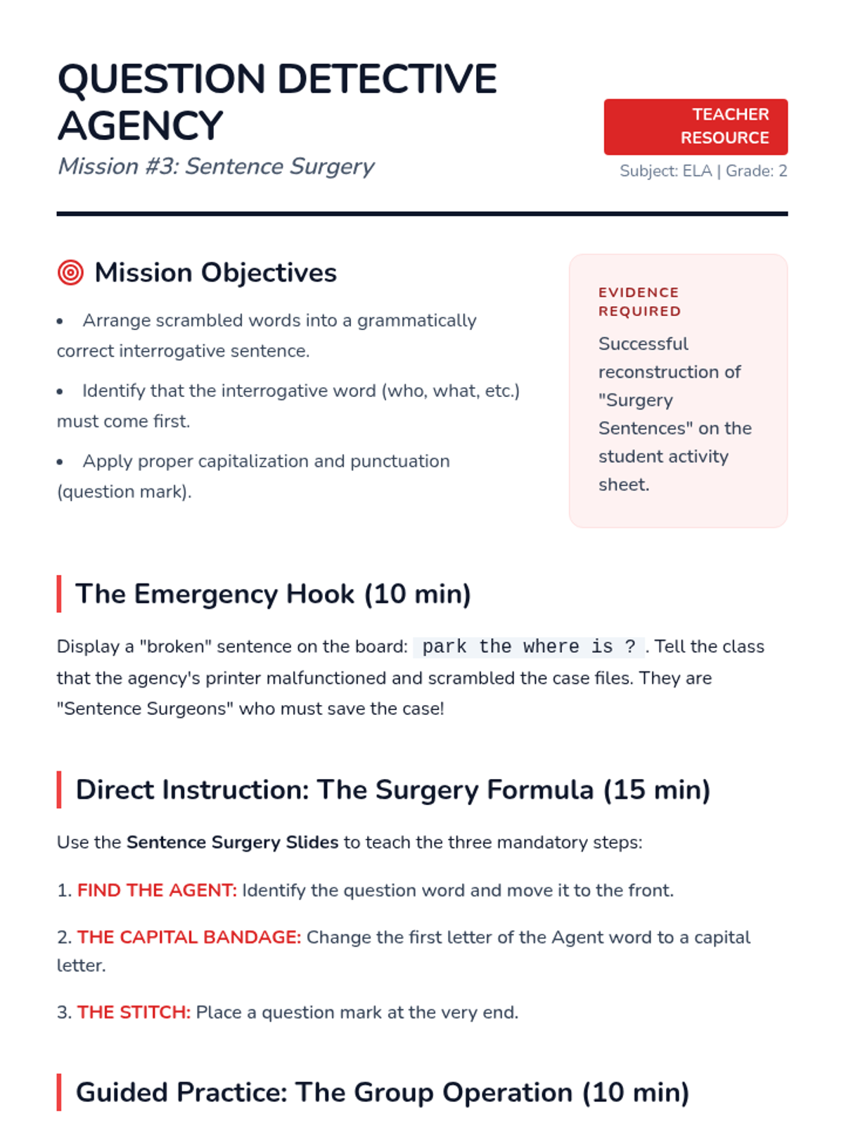 A comprehensive sequence for 2nd Grade ELA that teaches the six primary interrogatives (who, what, where, when, why, how) through a 'Question Detective Agency' theme. Students progress from categorizing question words to building sentences, extracting text details, and conducting peer interviews.