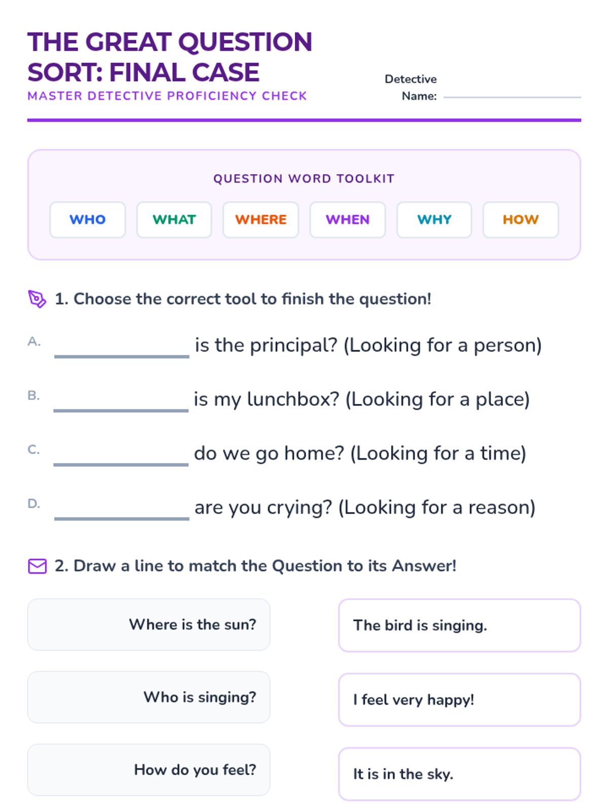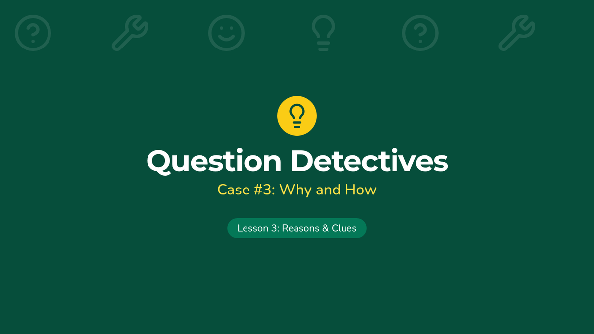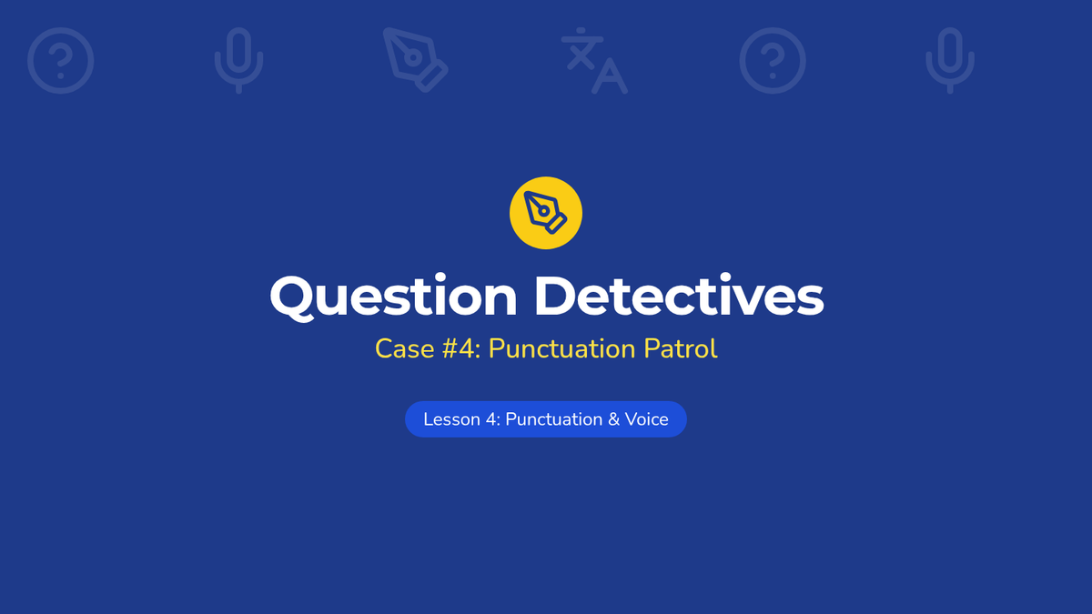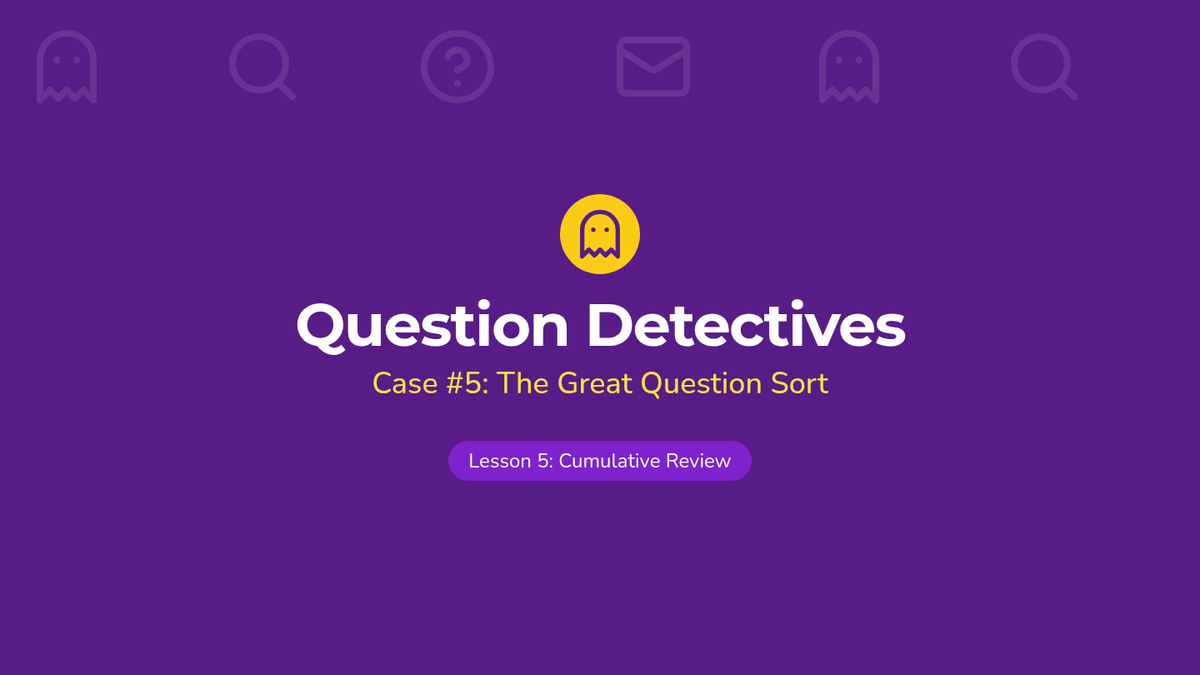 A 1st-grade sequence exploring the six primary question words (who, what, where, when, why, how) through a detective-themed investigation. Students move from basic identification to understanding specific functions, punctuation, and intonation.