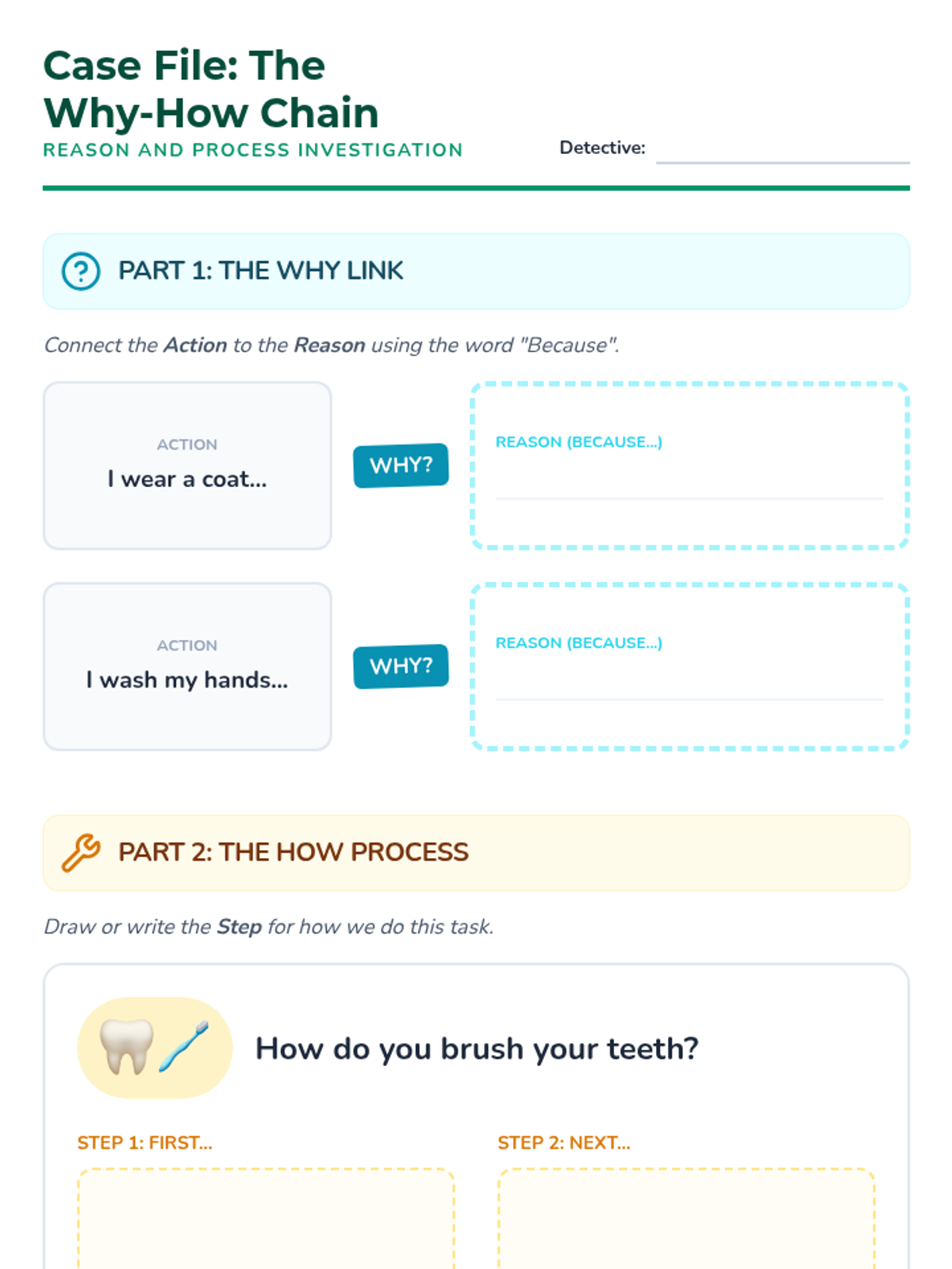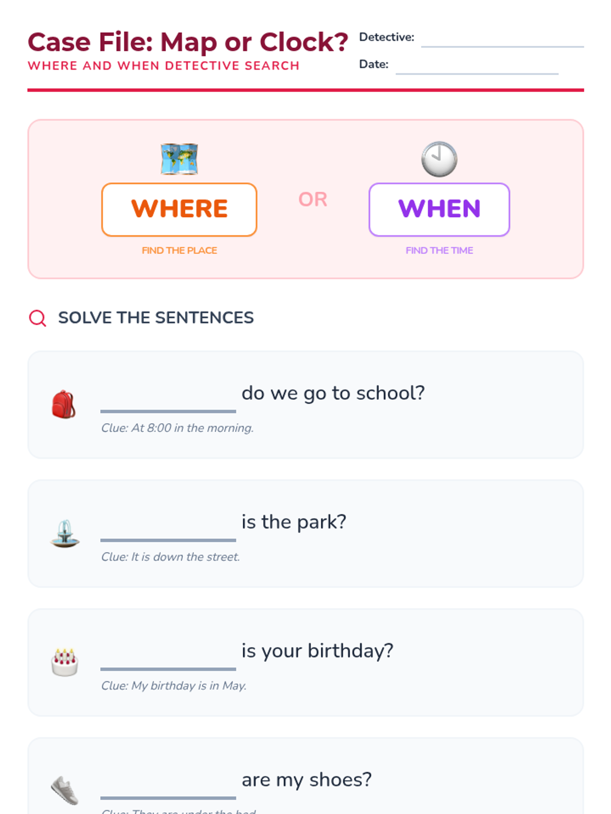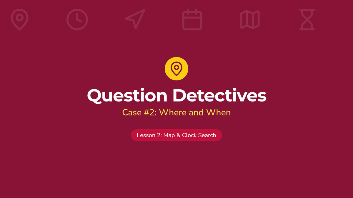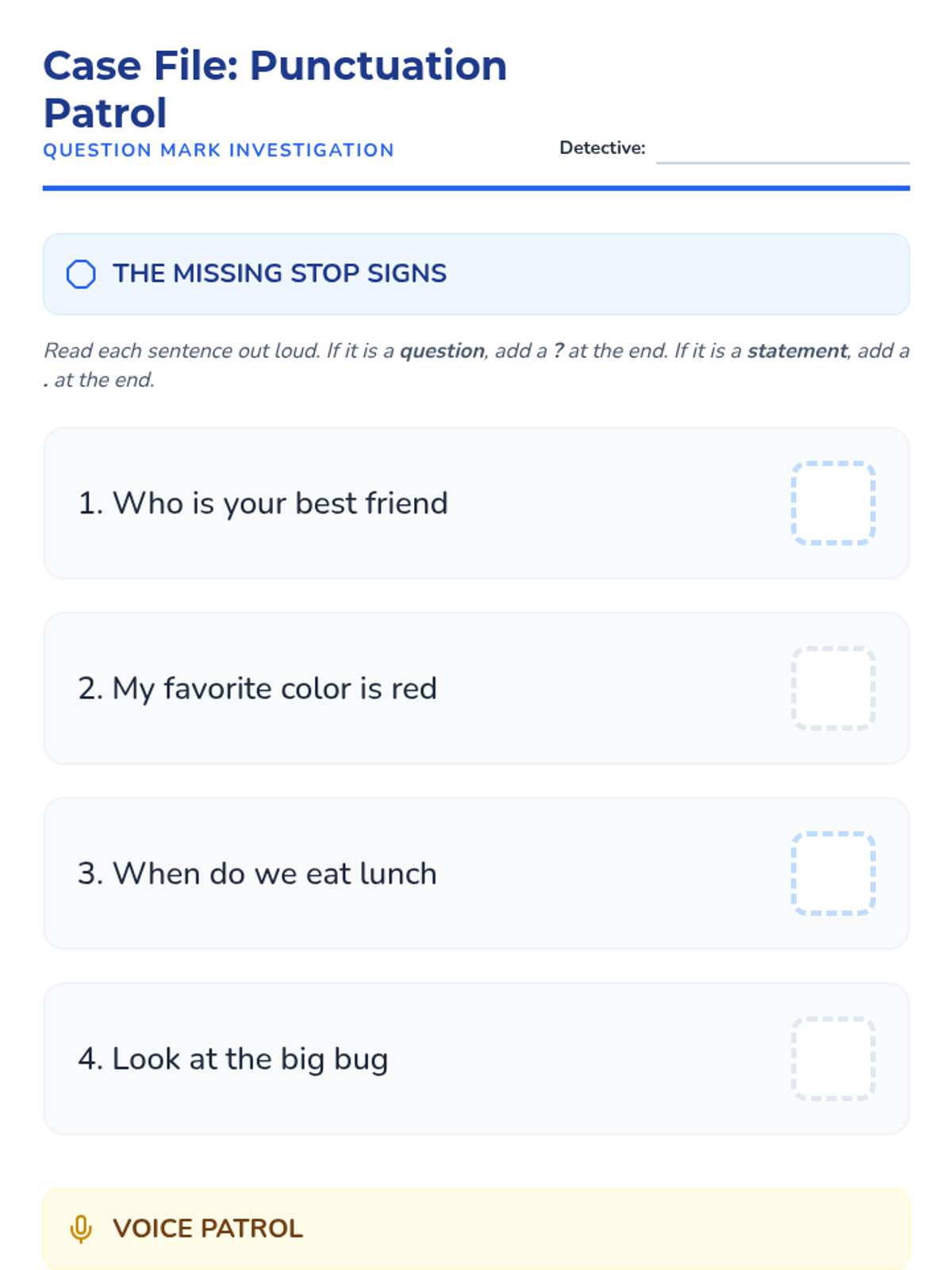 A 1st-grade sequence exploring the six primary question words (who, what, where, when, why, how) through a detective-themed investigation. Students move from basic identification to understanding specific functions, punctuation, and intonation.