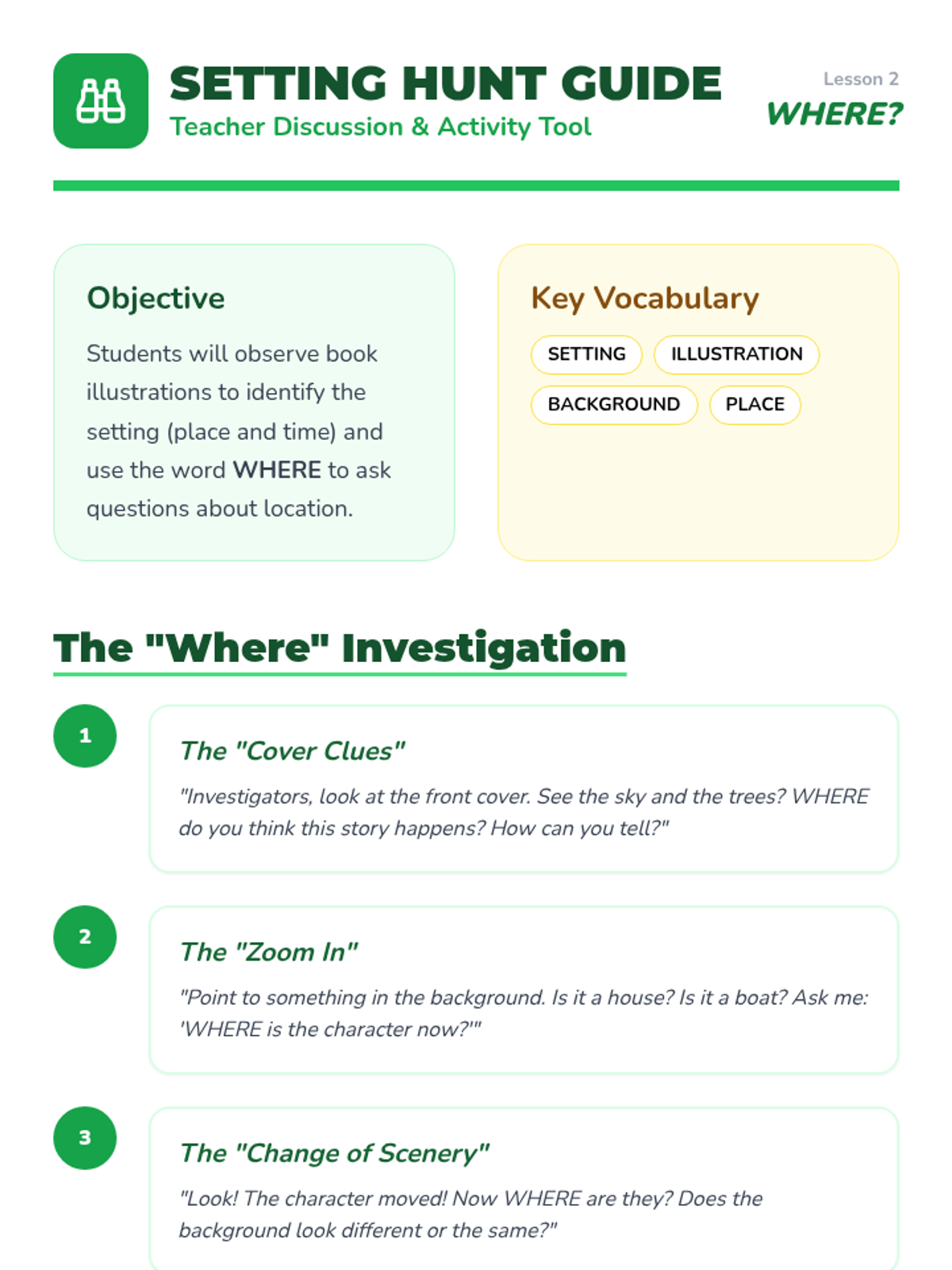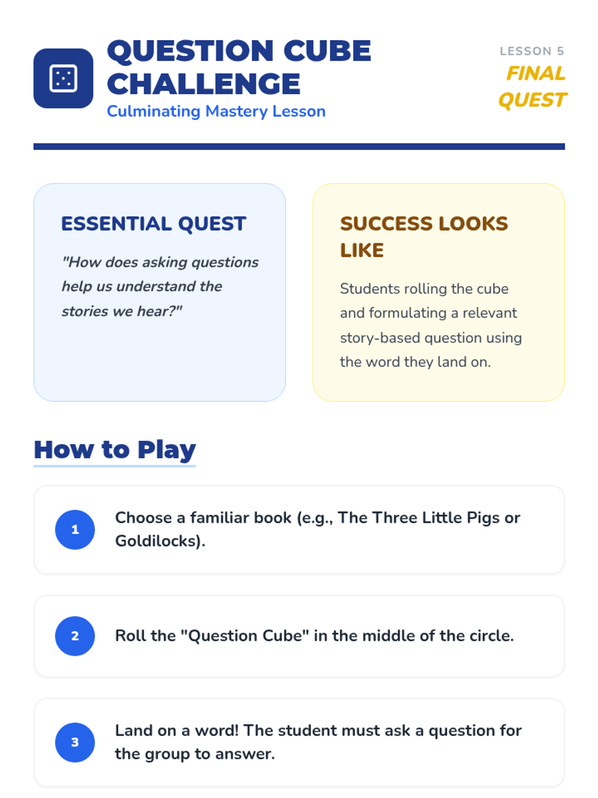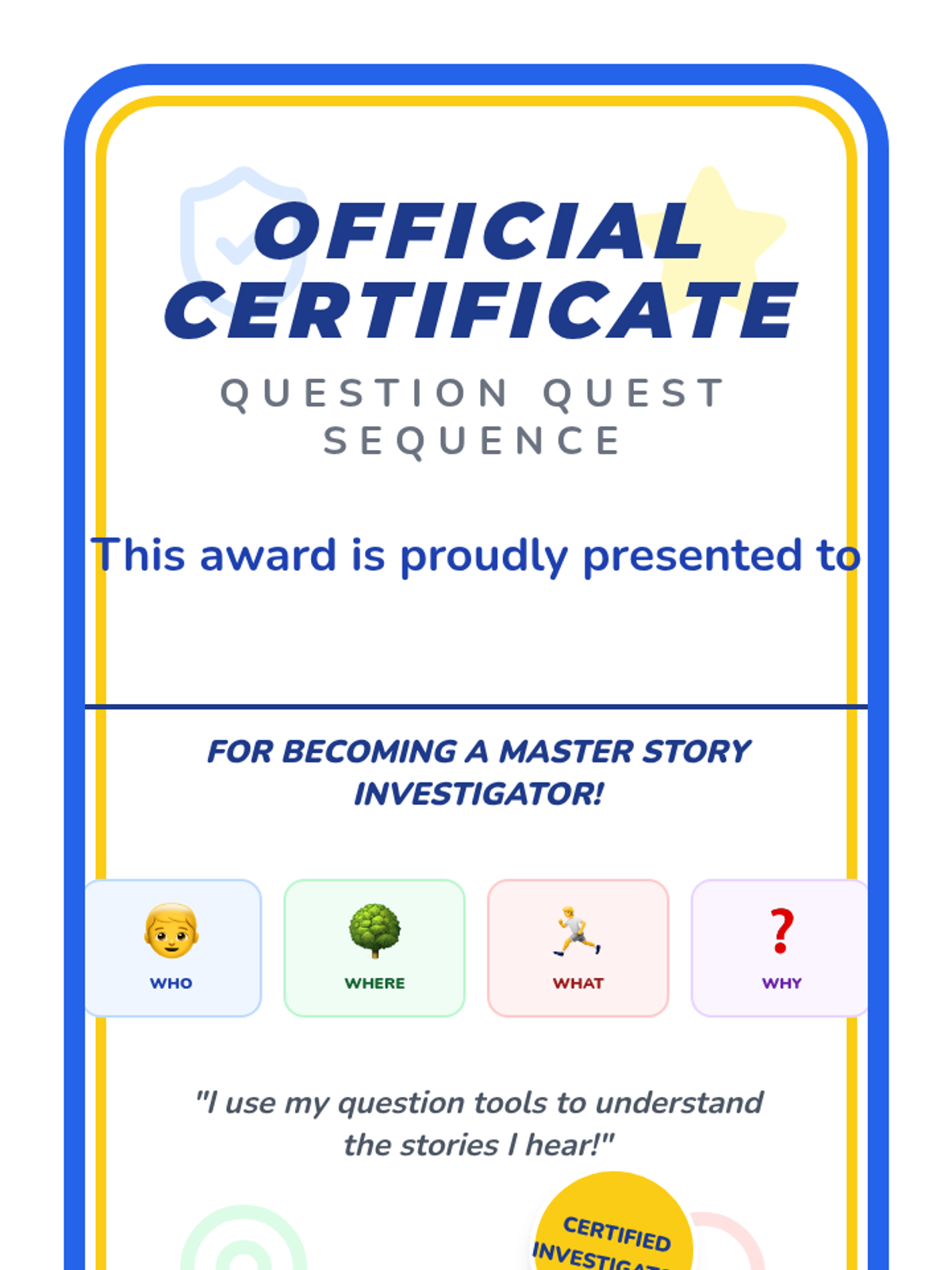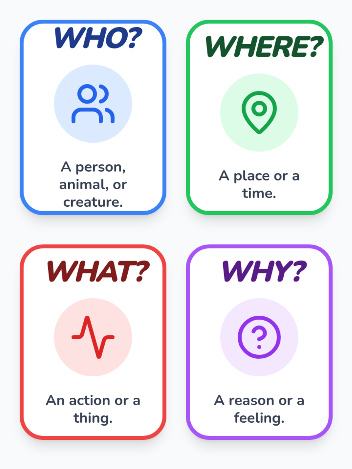 A Pre-K ELA sequence focused on teaching children to use 'Who', 'Where', 'What', and 'Why' to understand stories. Through interactive read-alouds, games, and creative activities, students become 'Story Investigators' who use question words as tools for comprehension.