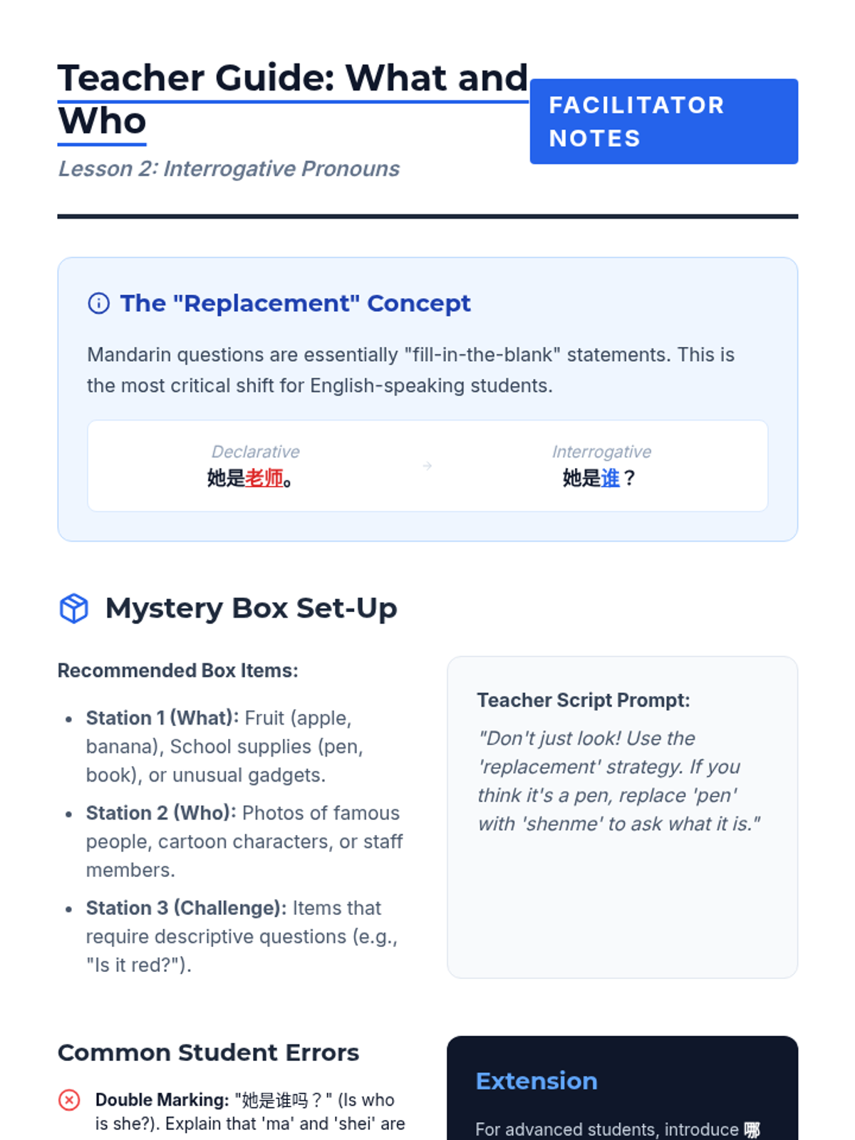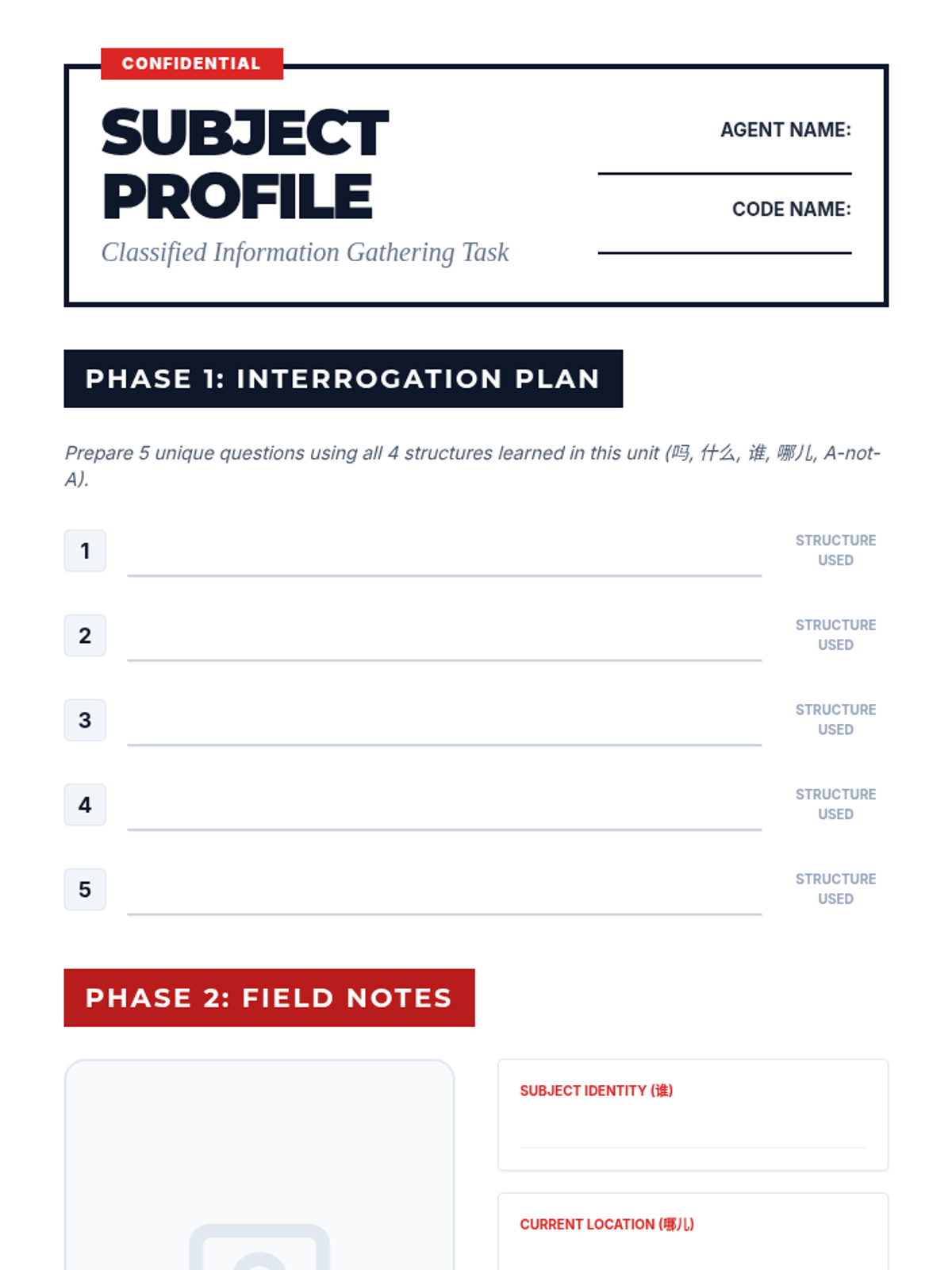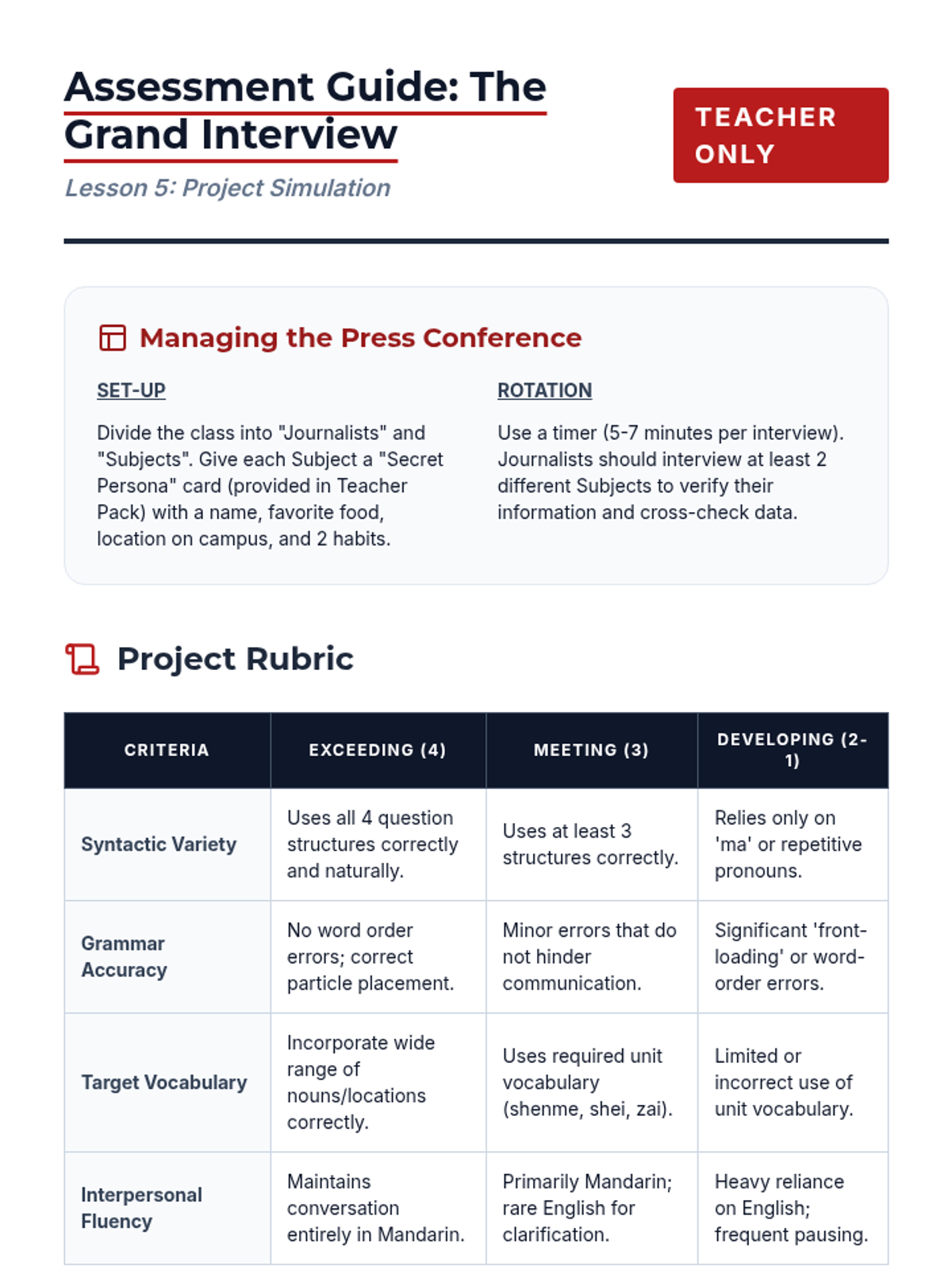 A comprehensive unit for 9th-grade Mandarin students focusing on interrogative structures. Students progress from simple yes/no particles to specific interrogative pronouns and the unique A-not-A verb structure, culminating in a simulated interview project.
