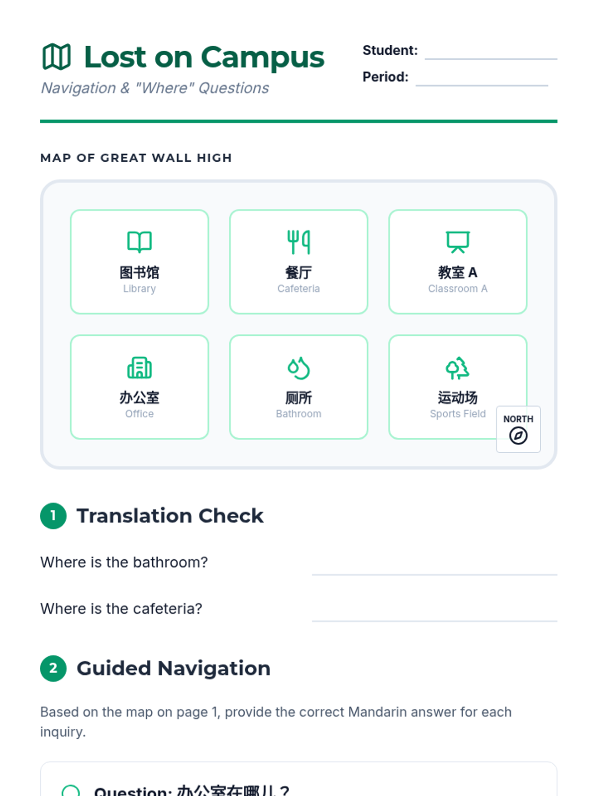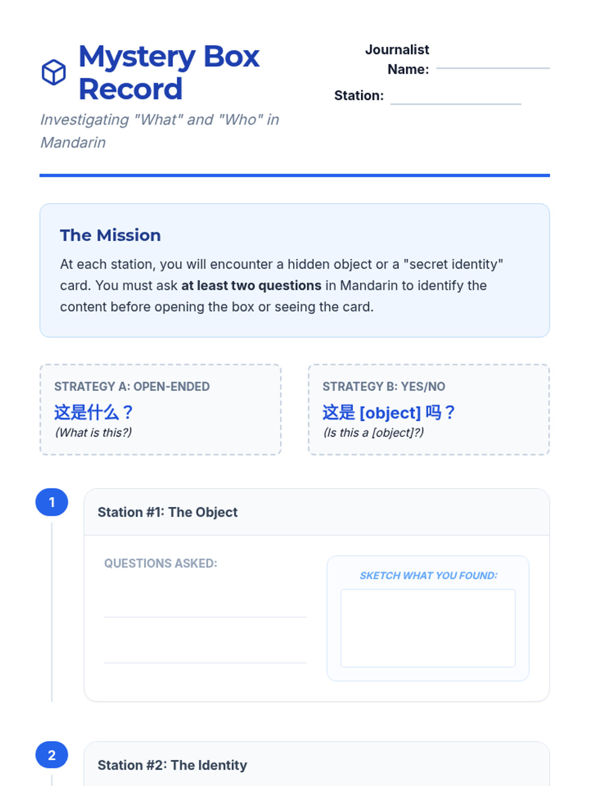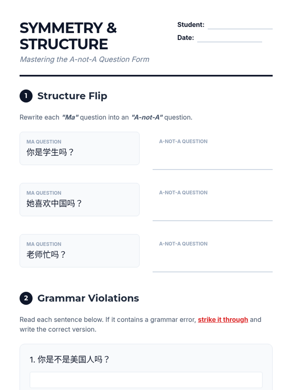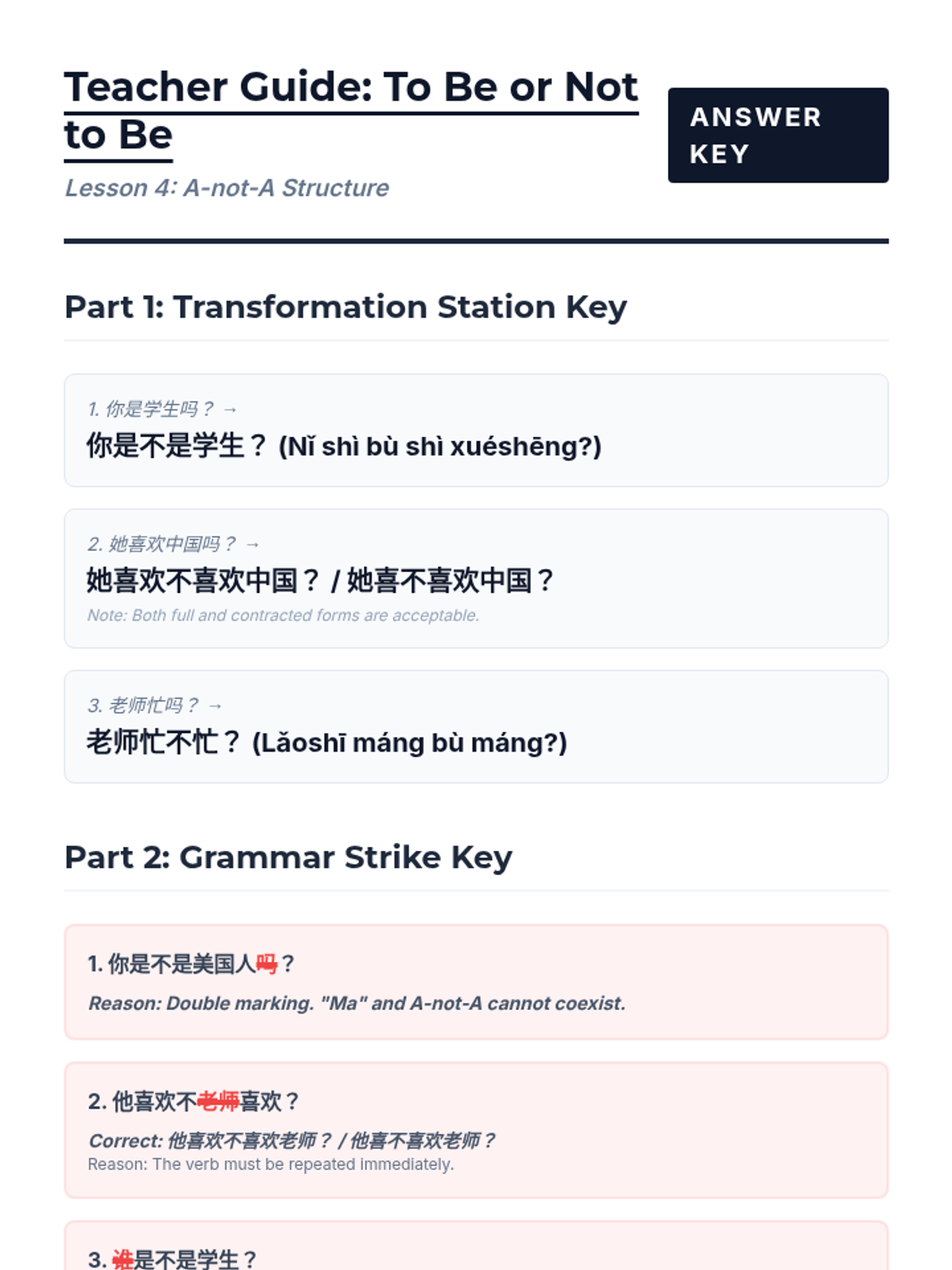 A comprehensive unit for 9th-grade Mandarin students focusing on interrogative structures. Students progress from simple yes/no particles to specific interrogative pronouns and the unique A-not-A verb structure, culminating in a simulated interview project.