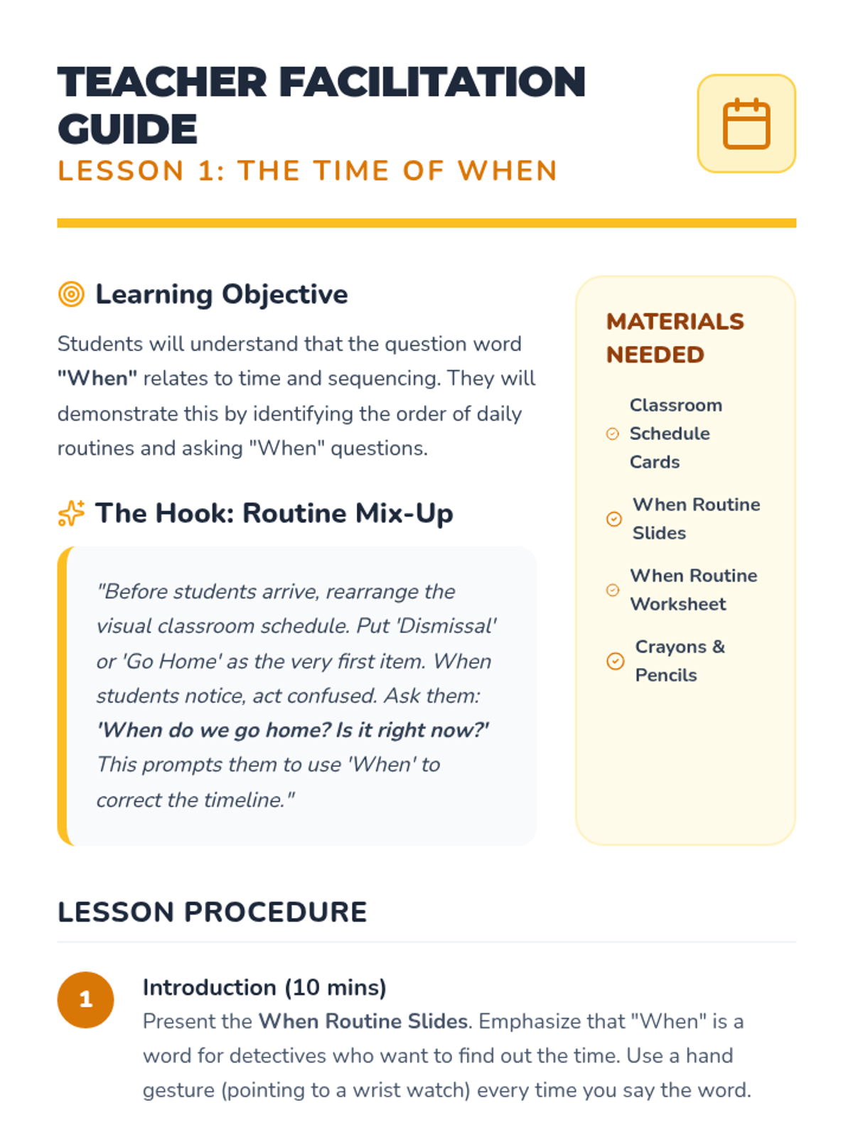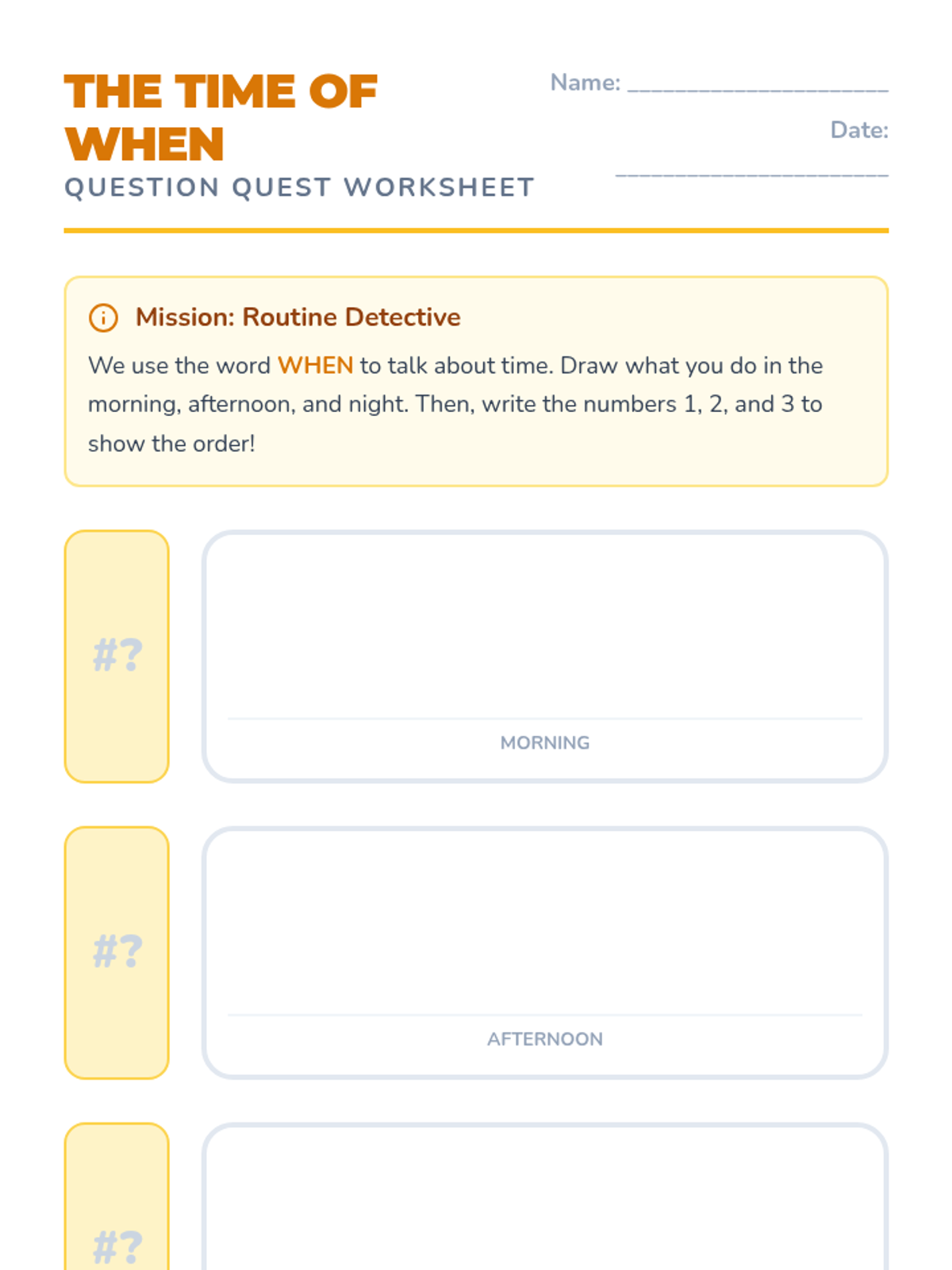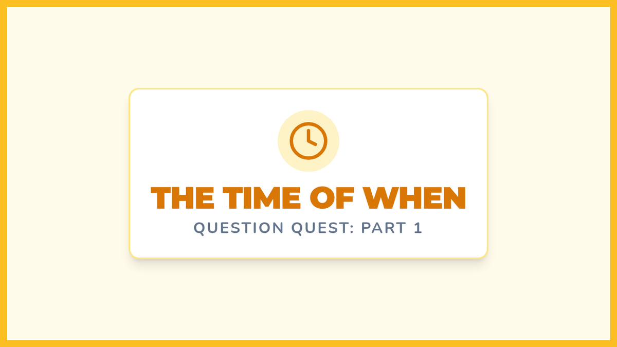 A Kindergarten sequence focused on the question words 'When', 'Why', and 'How' through storytelling, daily routines, and hands-on experiments. Students progress from time-based sequencing to understanding causality and procedural steps.