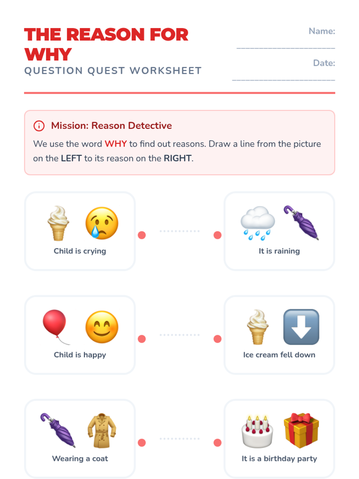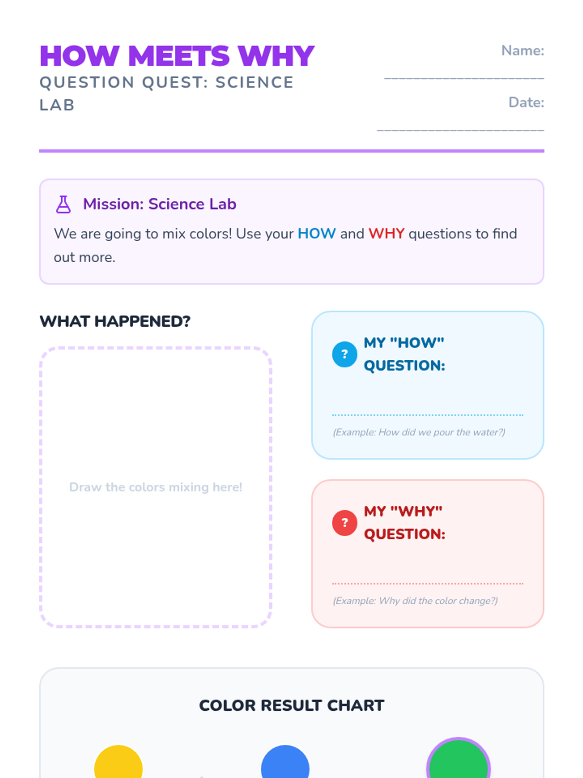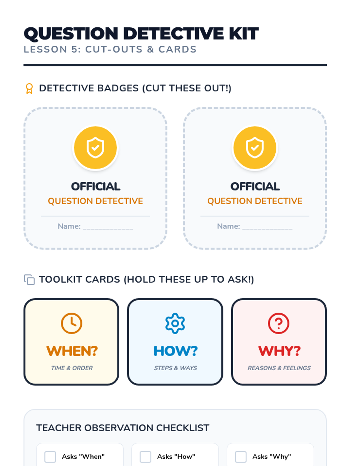 A Kindergarten sequence focused on the question words 'When', 'Why', and 'How' through storytelling, daily routines, and hands-on experiments. Students progress from time-based sequencing to understanding causality and procedural steps.