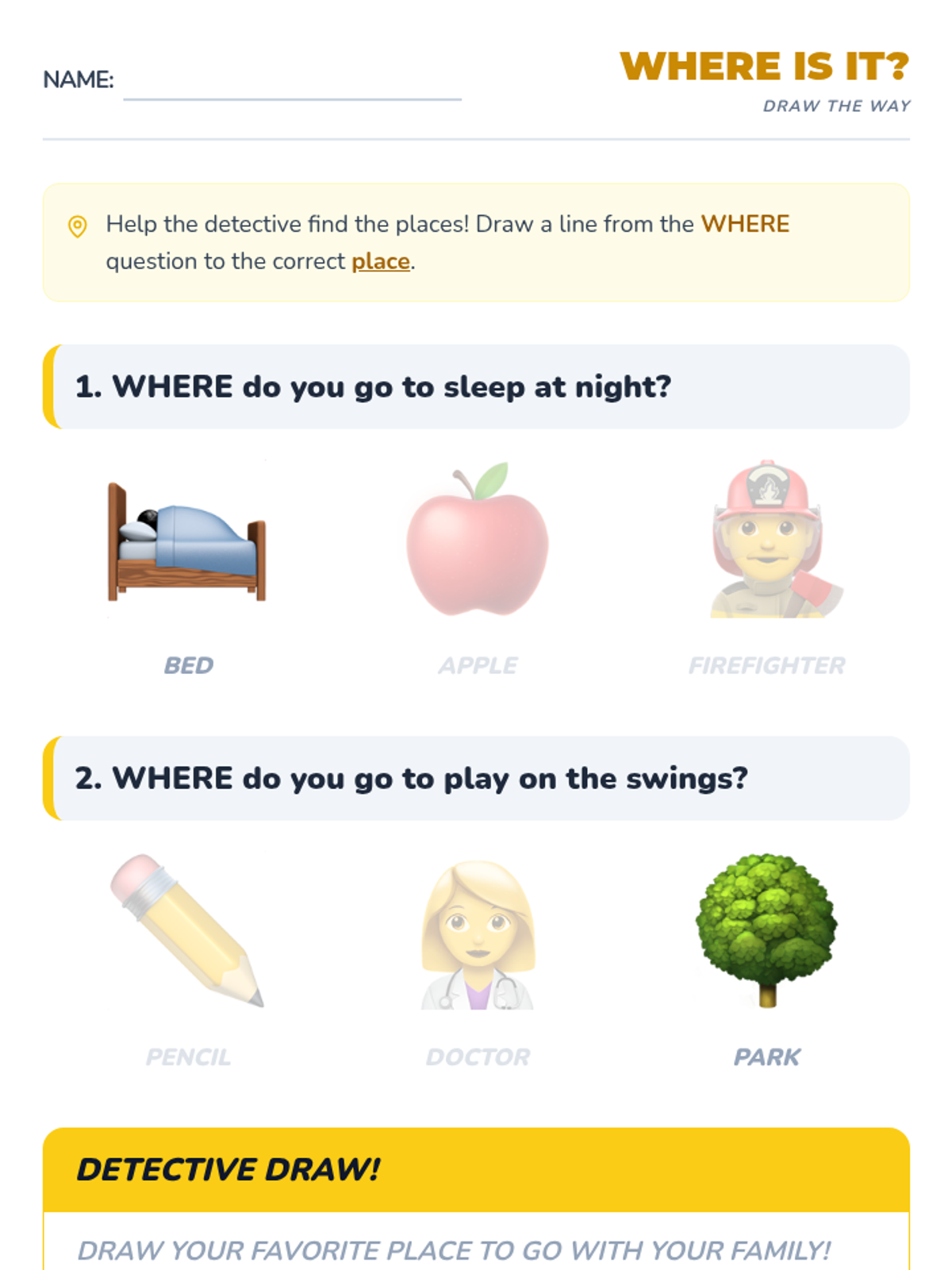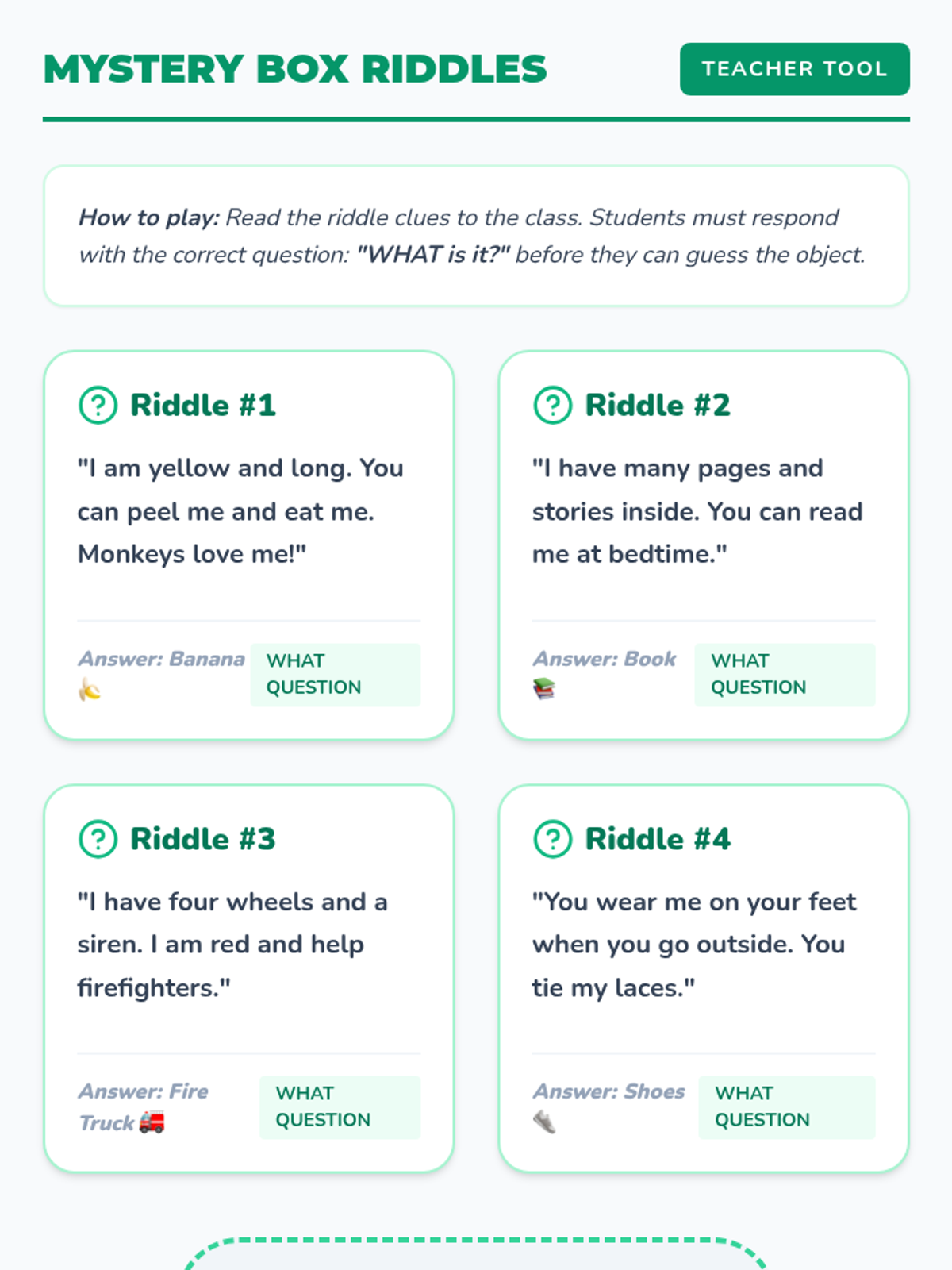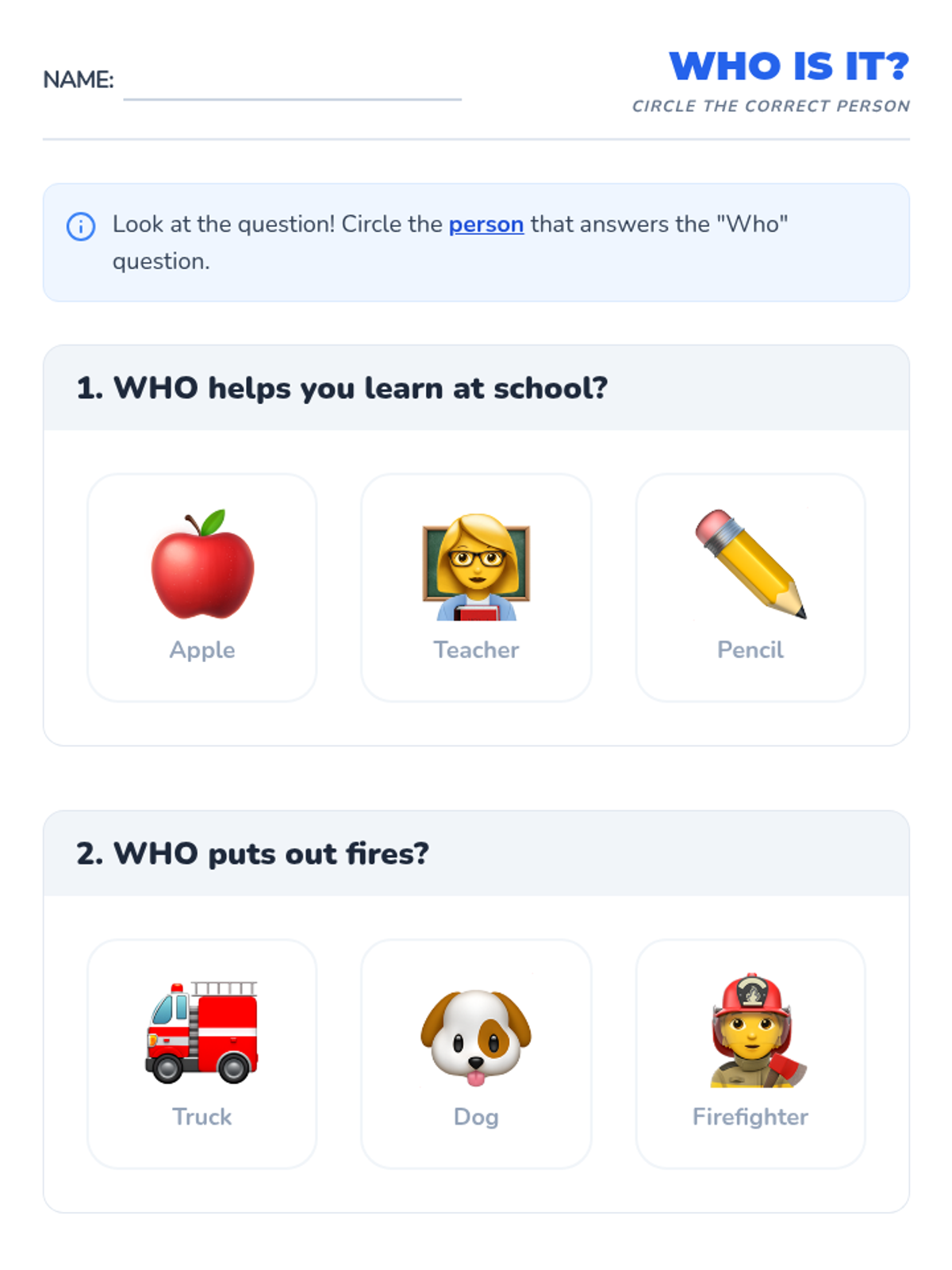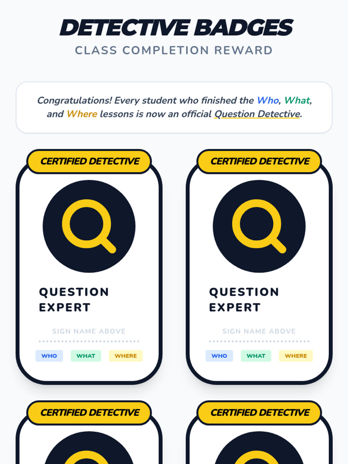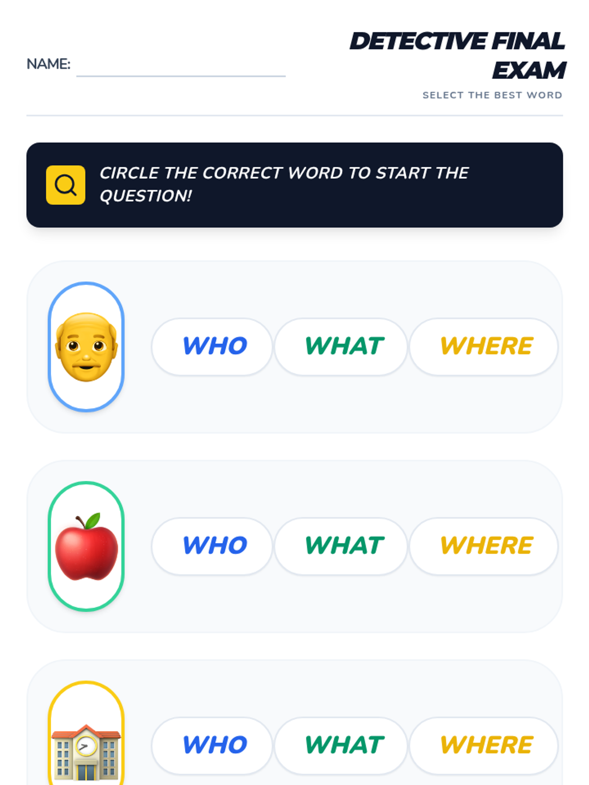 A foundational ELA sequence for Kindergarten students focusing on the question words 'Who', 'What', and 'Where'. Through games, sorting activities, and mystery-solving, students learn to associate 'Who' with people, 'What' with objects, and 'Where' with locations.