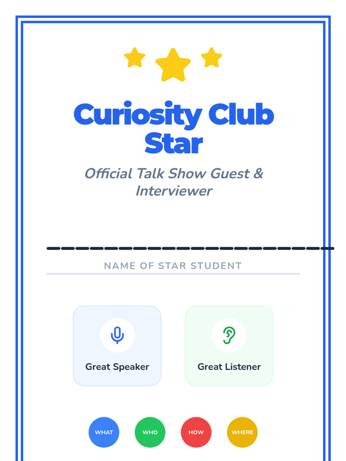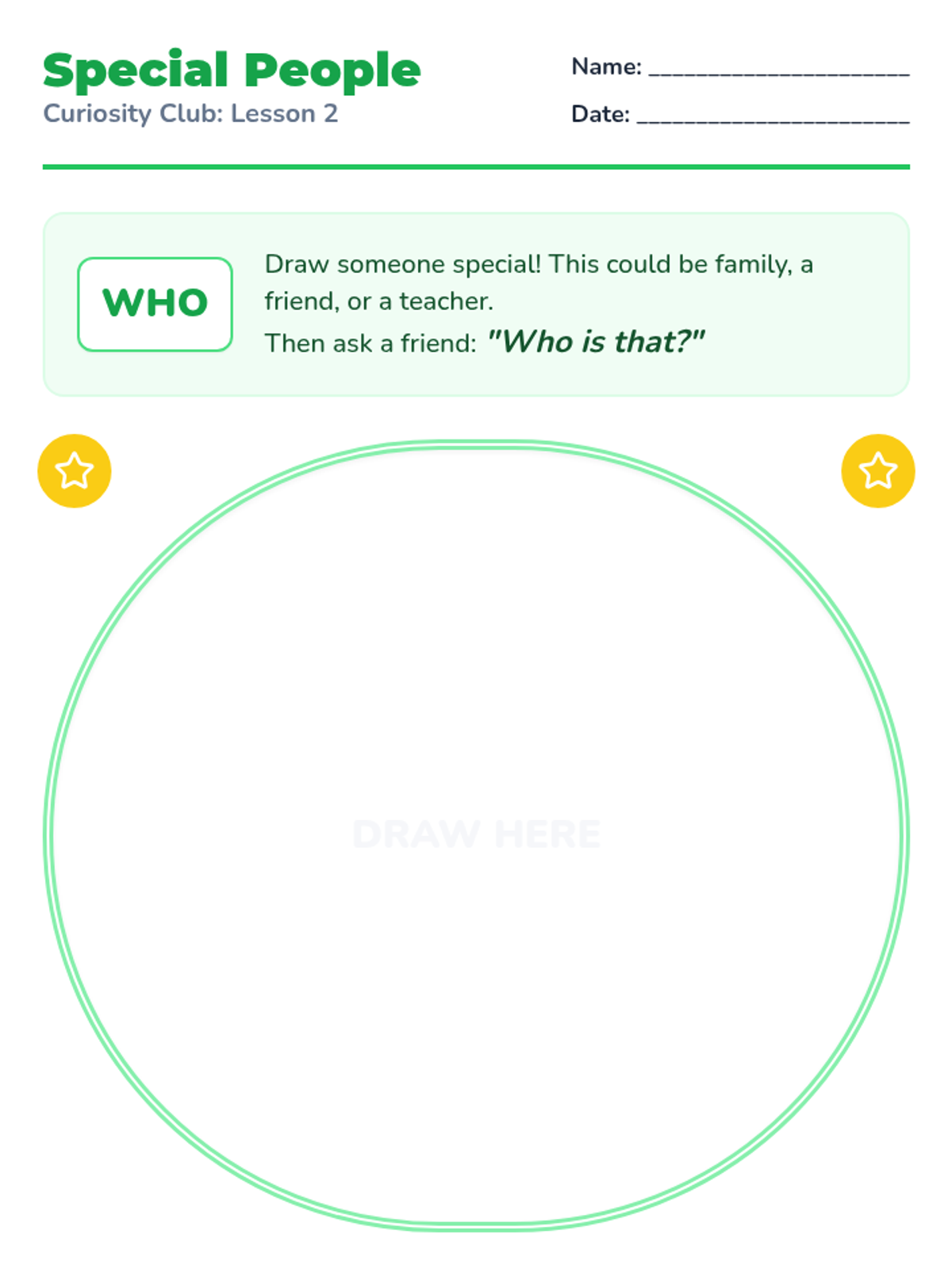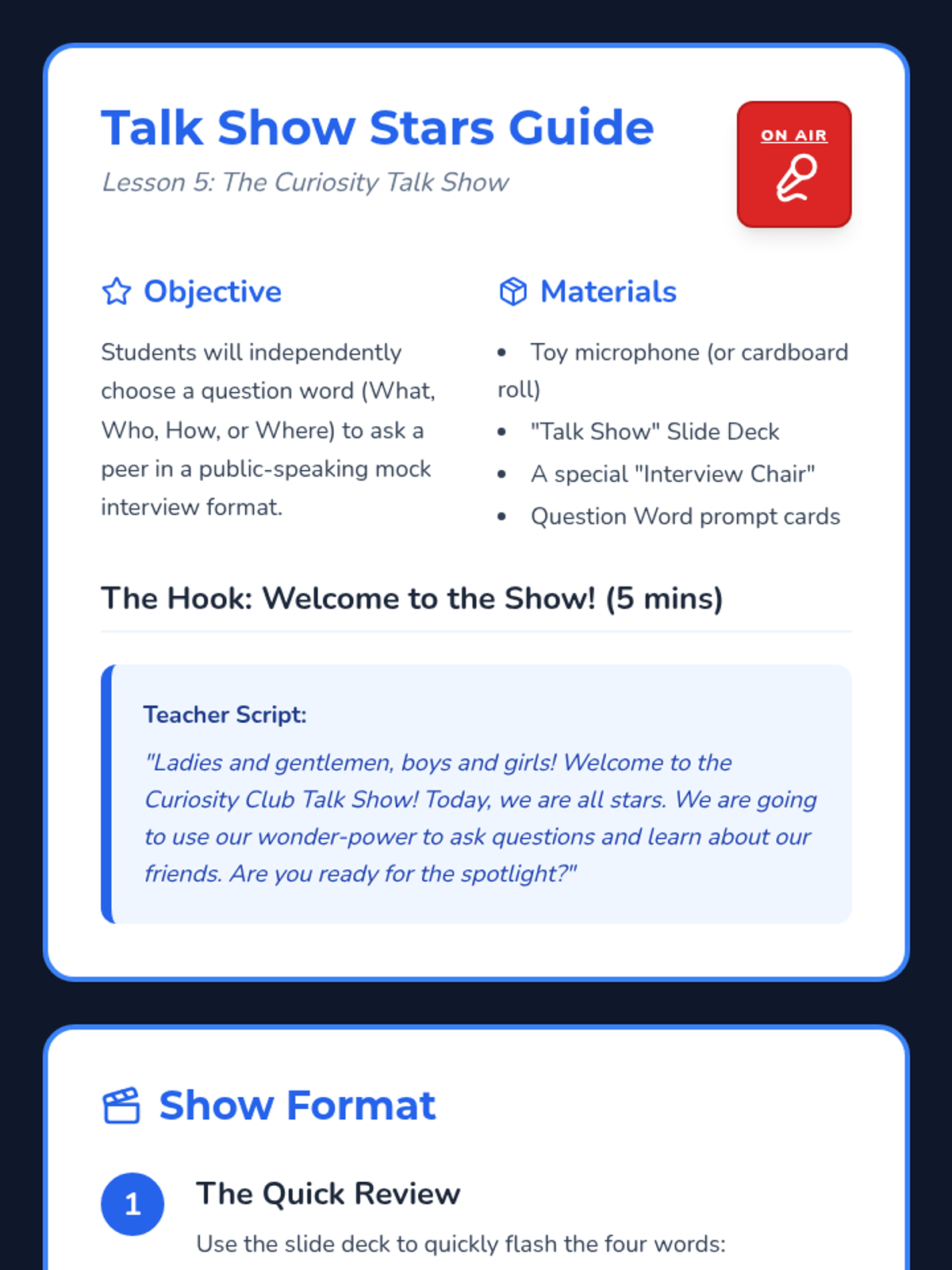 A sequence focused on oral language development for Pre-K students, teaching the use of 'What', 'Who', 'How', and 'Where' to build social connections and curiosity.