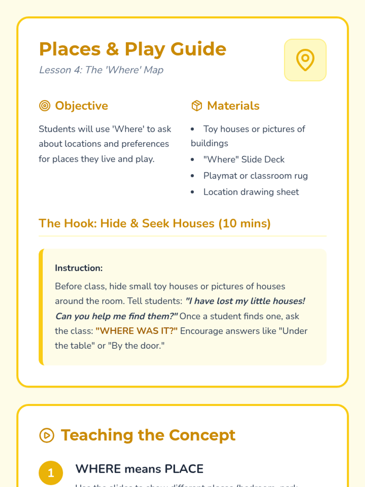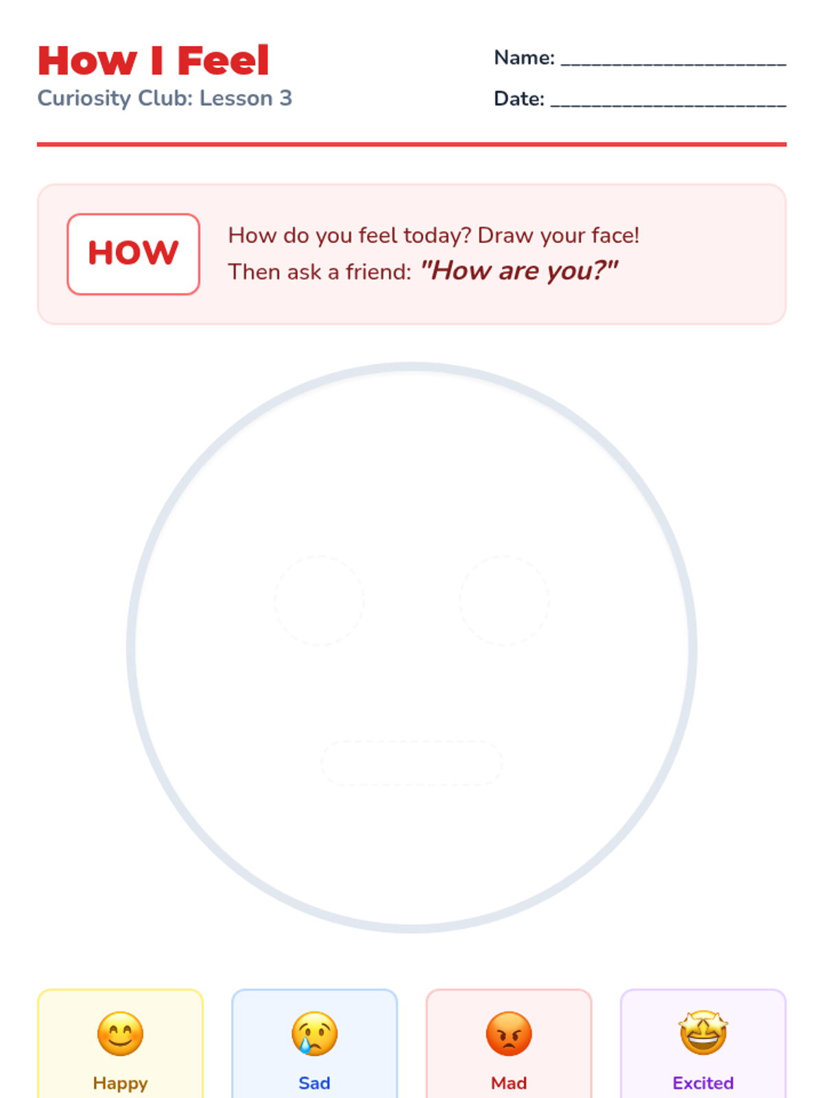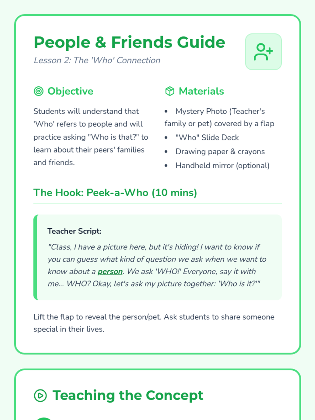 A sequence focused on oral language development for Pre-K students, teaching the use of 'What', 'Who', 'How', and 'Where' to build social connections and curiosity.