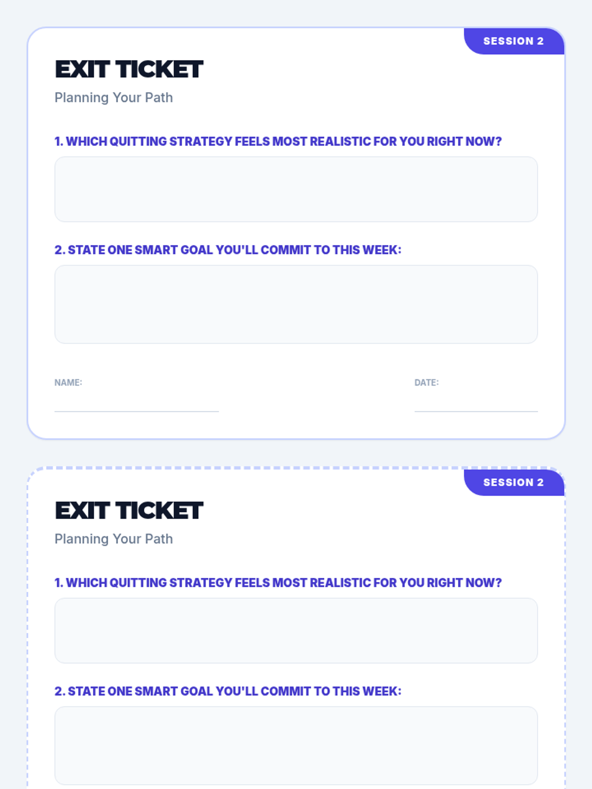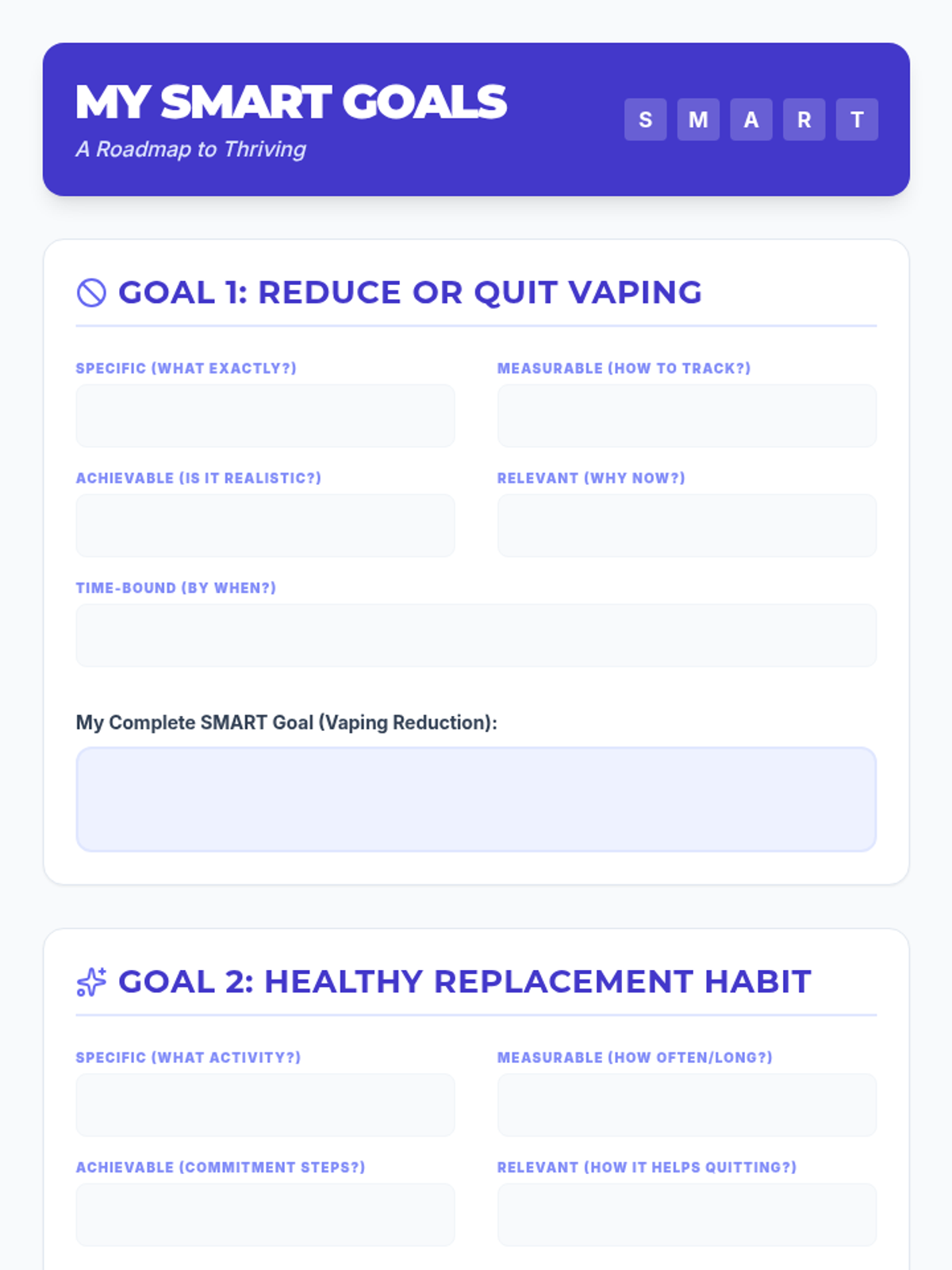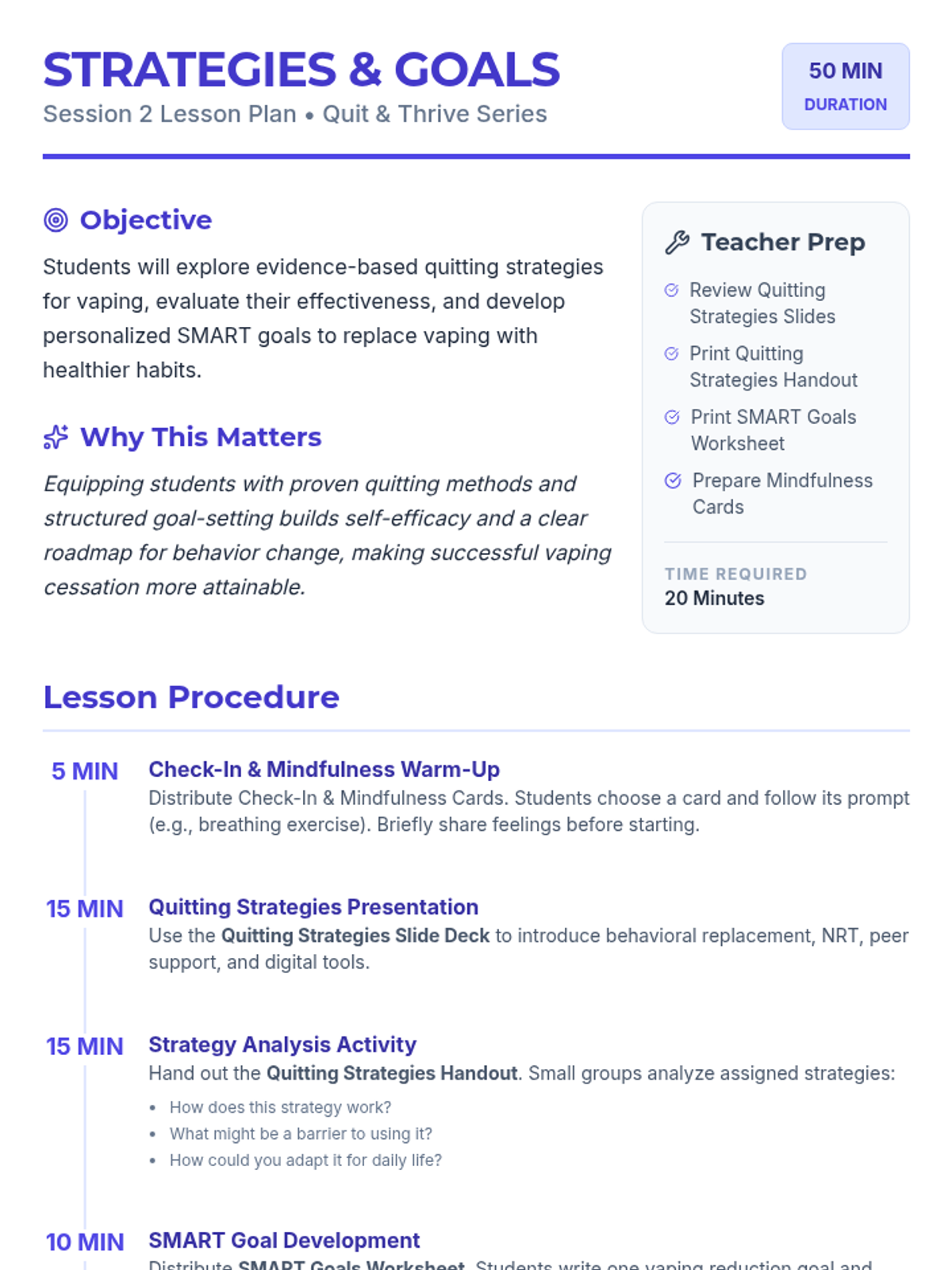 A 4-session Tier 2 intervention for high school students focused on vaping cessation, quitting strategies, and building healthy replacement habits through peer support and interactive activities.