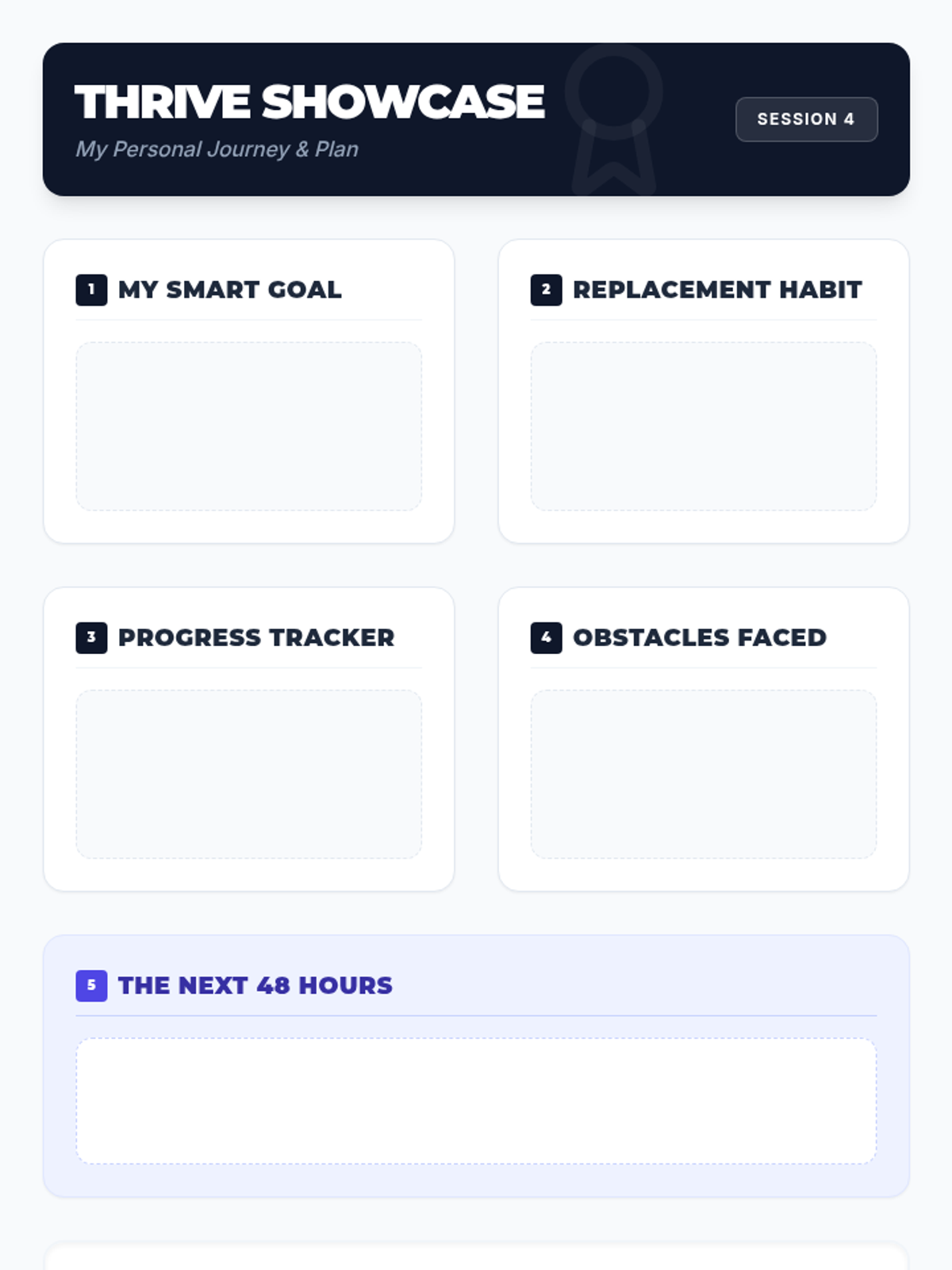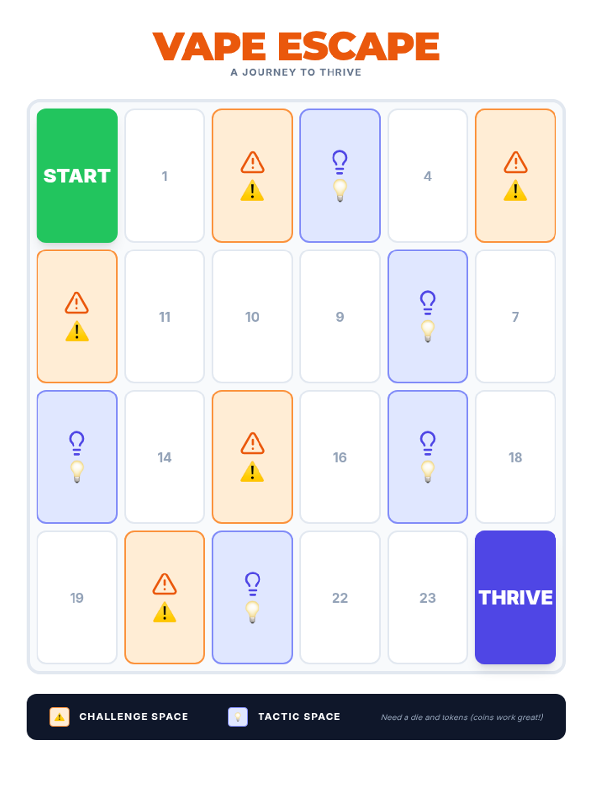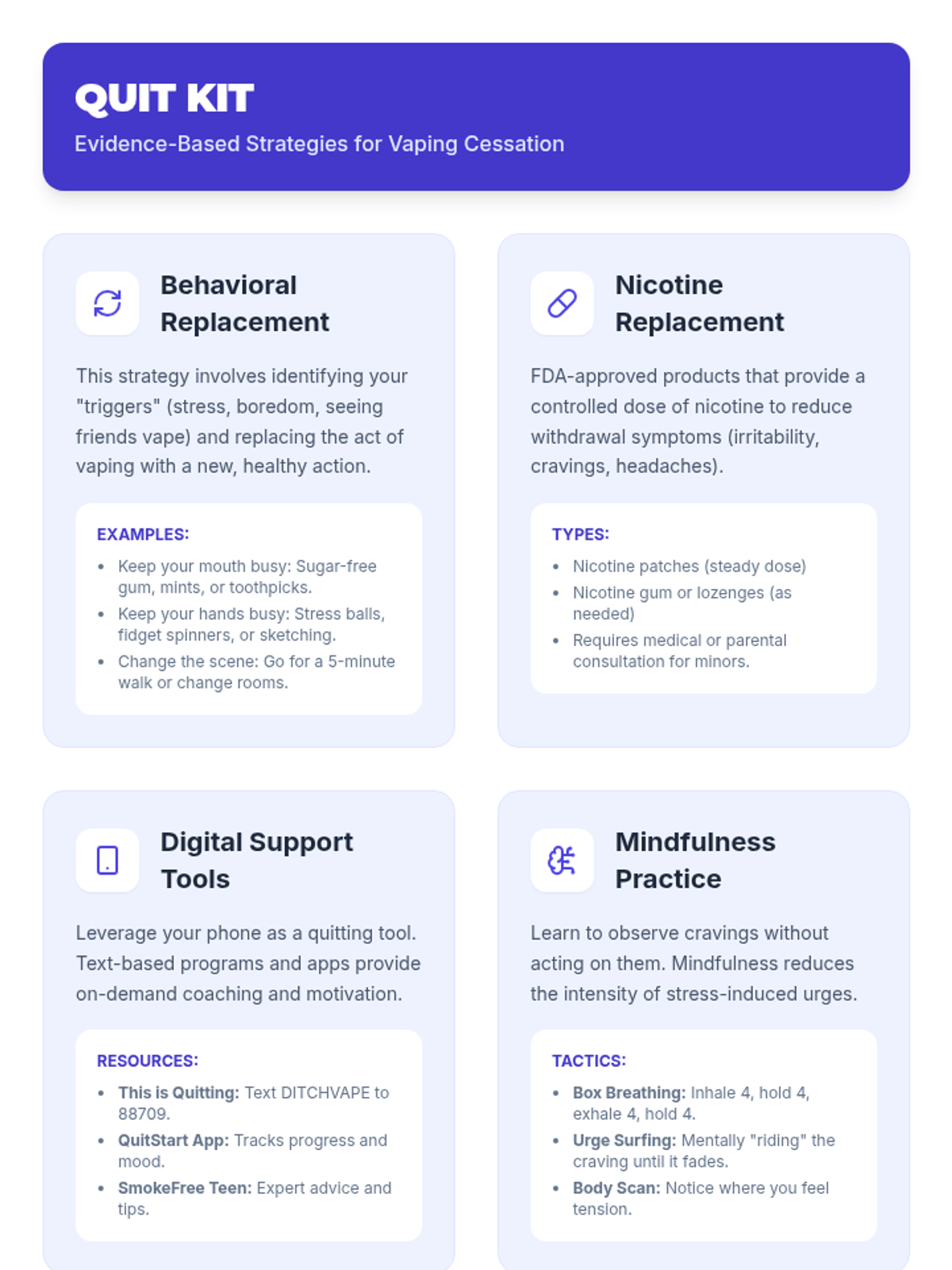 A 4-session Tier 2 intervention for high school students focused on vaping cessation, quitting strategies, and building healthy replacement habits through peer support and interactive activities.