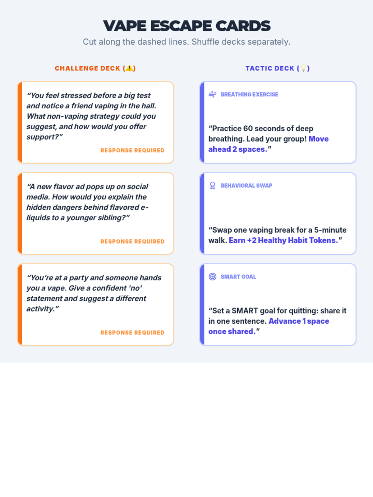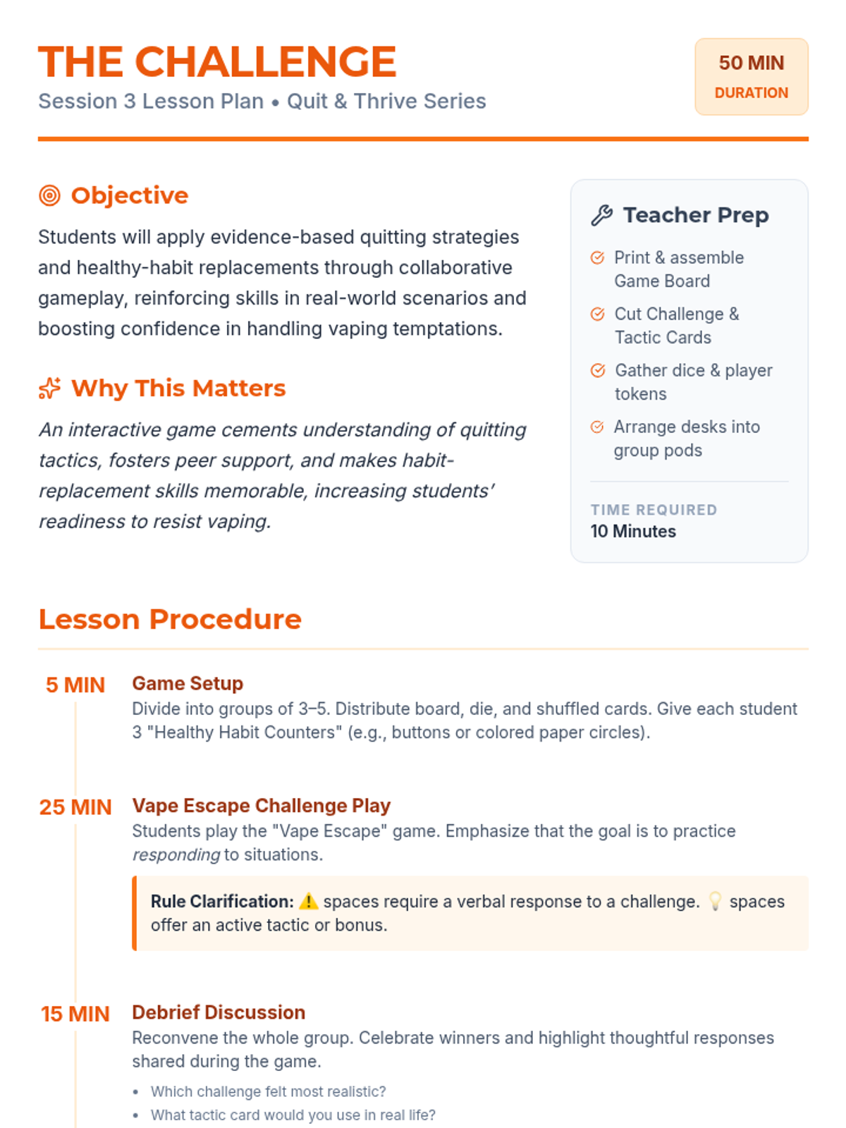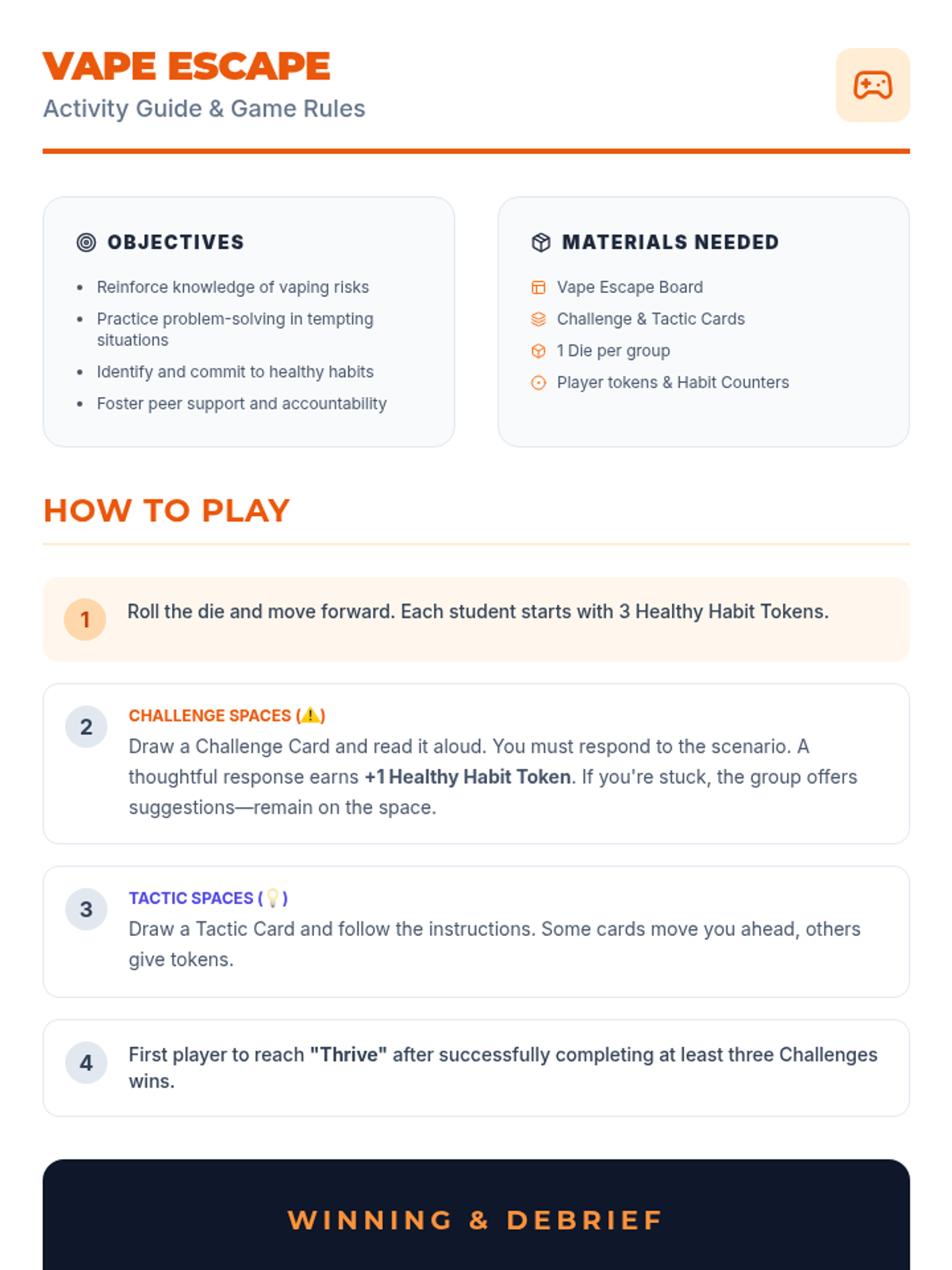 A comprehensive vaping prevention unit that covers health risks, the science of nicotine addiction, and social refusal strategies for middle and high school students.