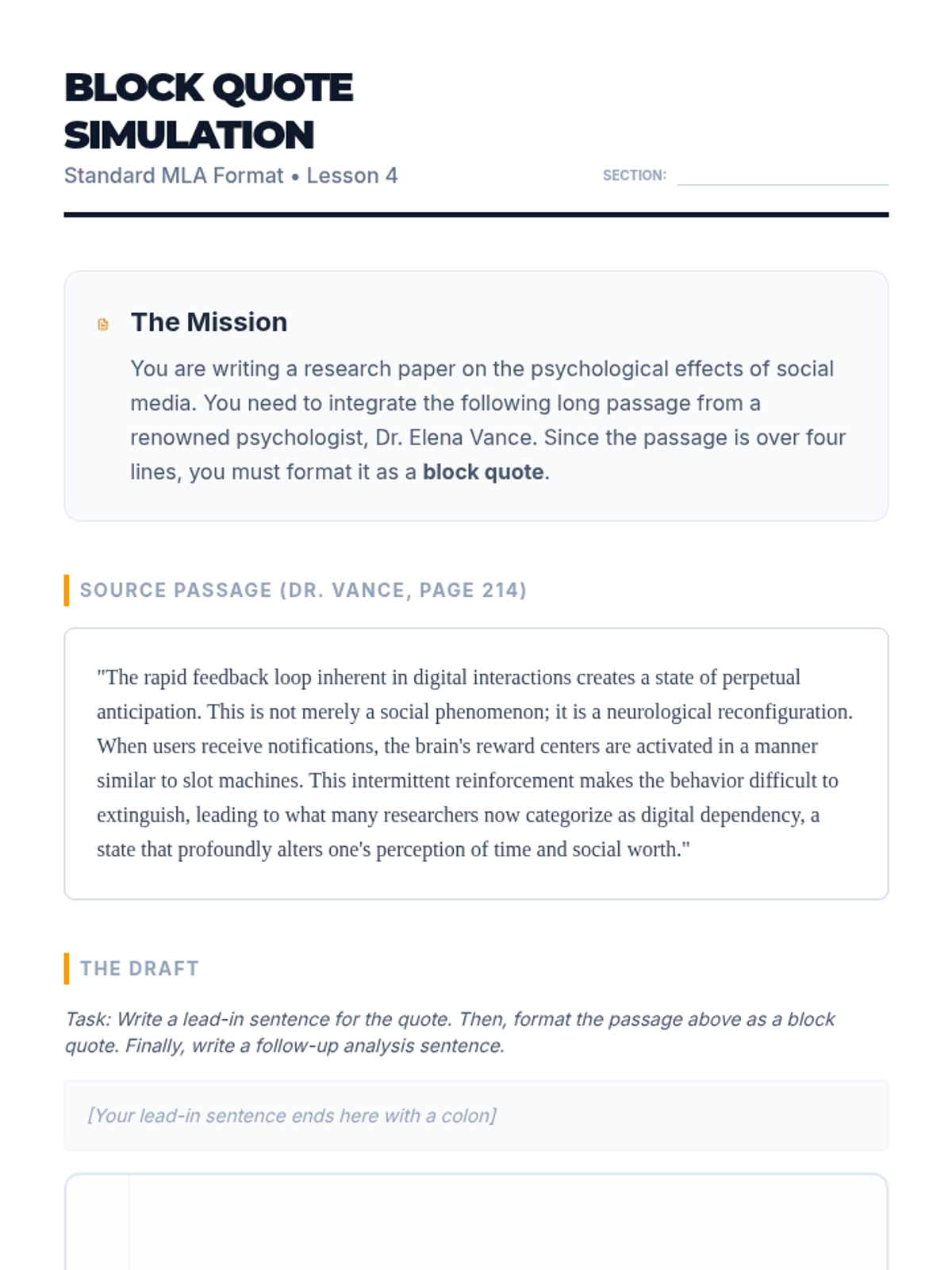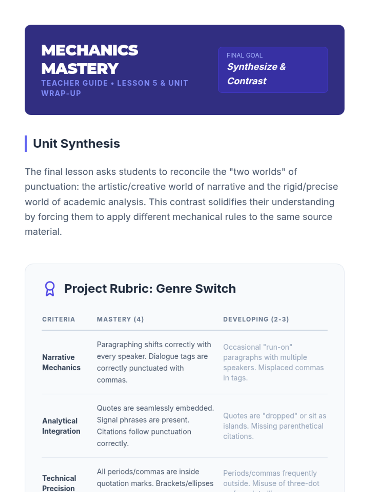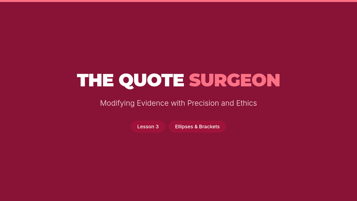 A comprehensive unit for 12th-grade students on the technical and ethical integration of quotations in academic writing, covering embedding, punctuation placement, modifications, block formatting, and genre differences.