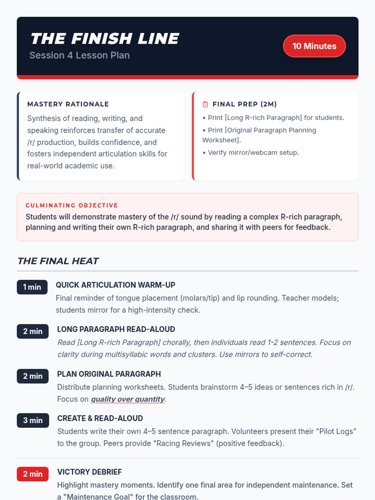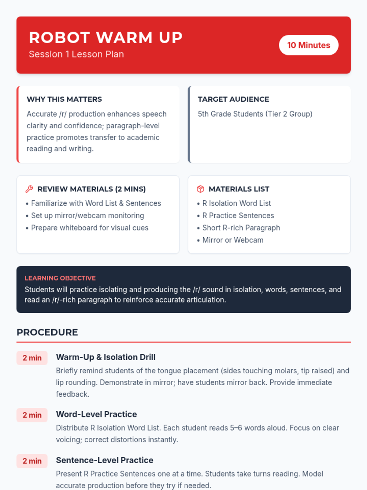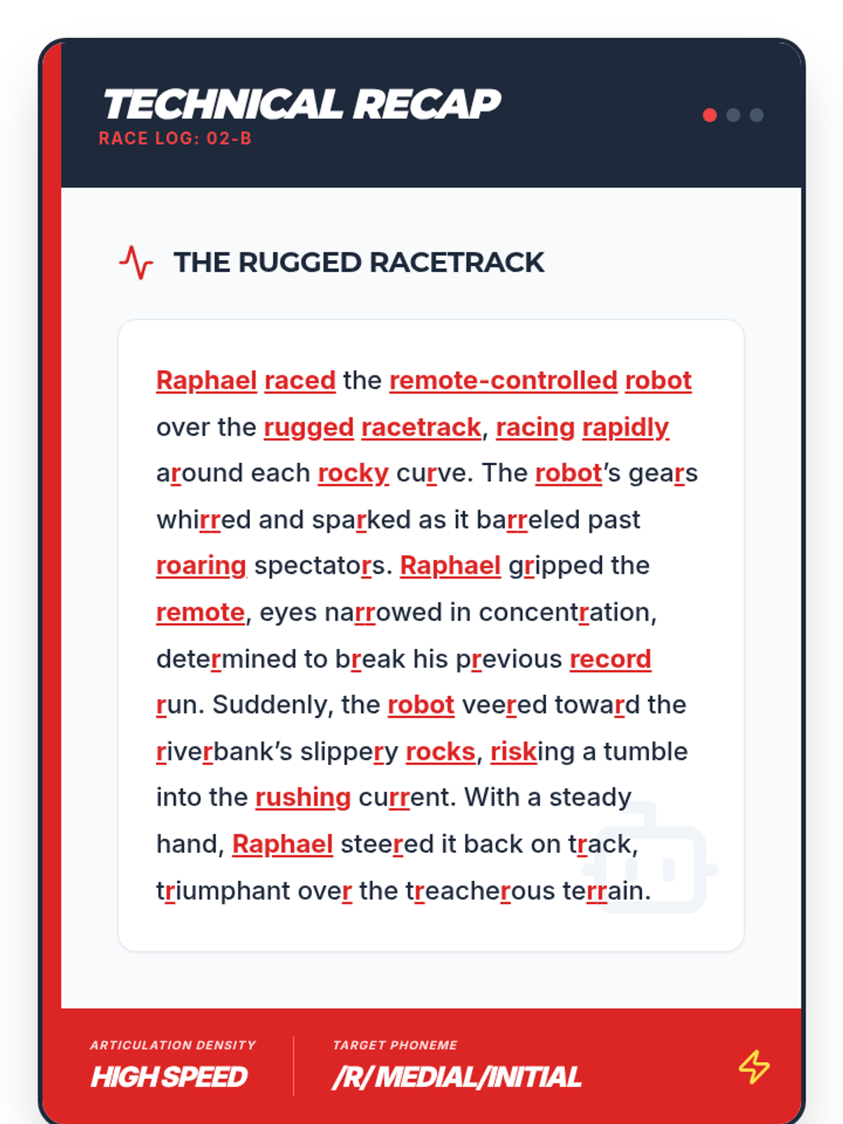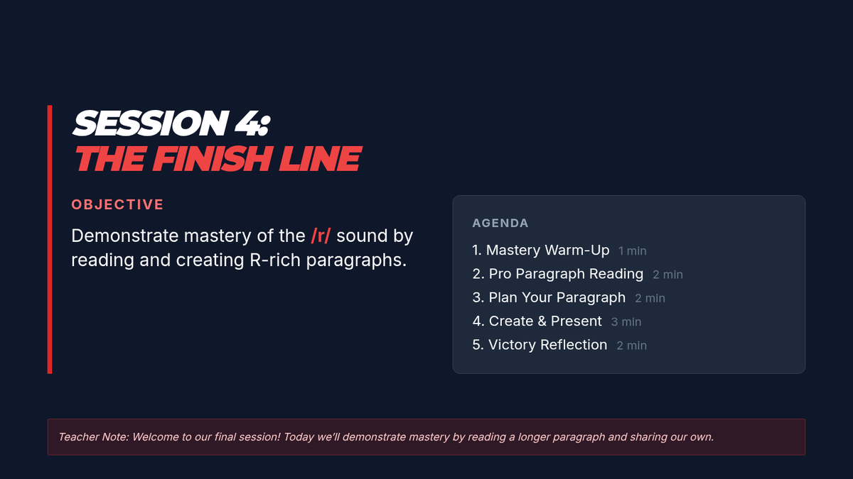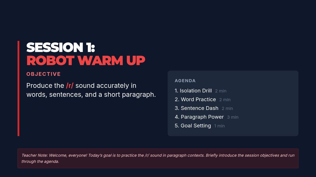 A 4-session, 10-minute small-group speech therapy series for 5th-grade students to master the /r/ sound in paragraph contexts. Using a high-energy robot racing theme, students progress from words and sentences to complex reading and original paragraph creation.