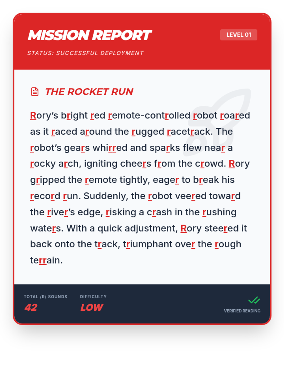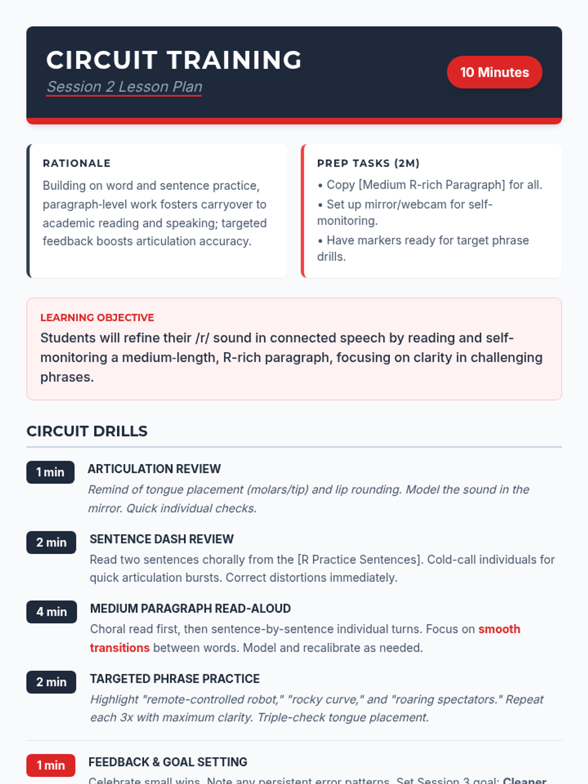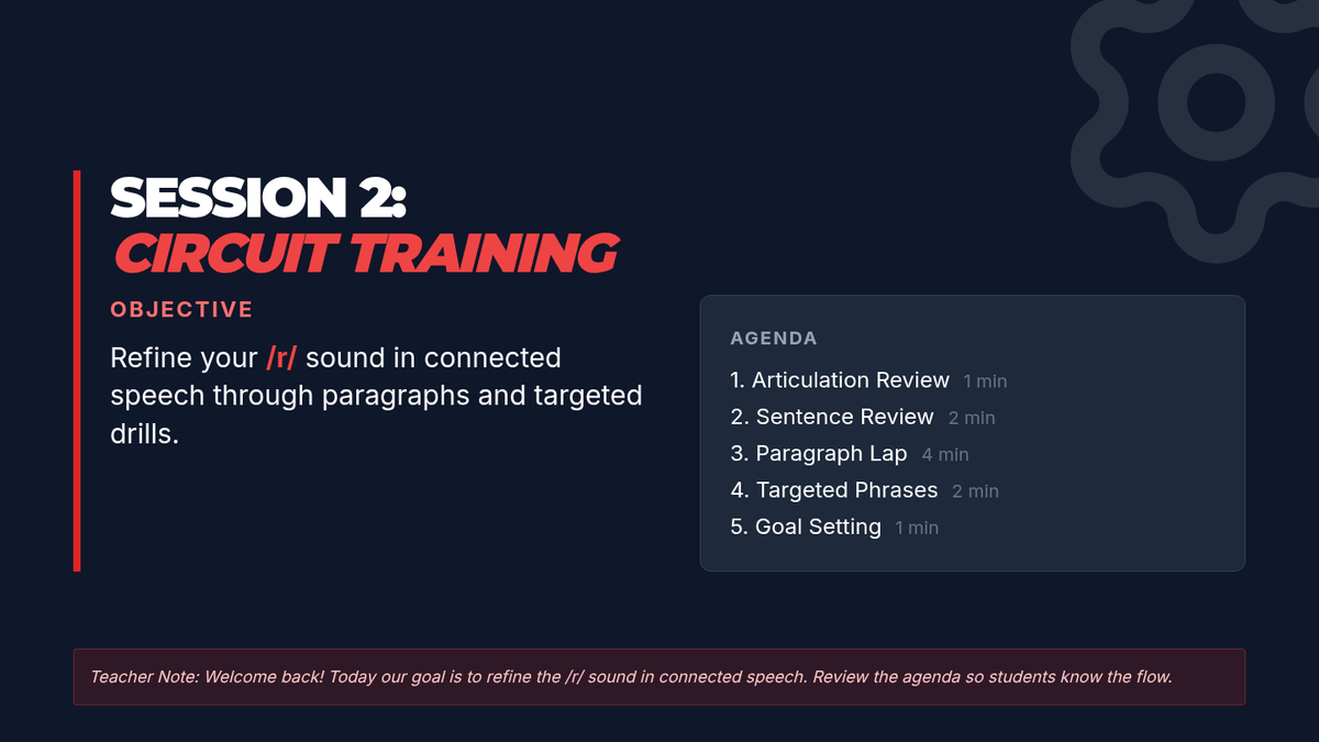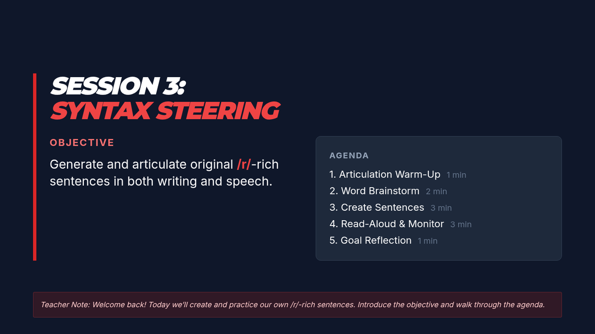 A 4-session, 10-minute small-group speech therapy series for 5th-grade students to master the /r/ sound in paragraph contexts. Using a high-energy robot racing theme, students progress from words and sentences to complex reading and original paragraph creation.