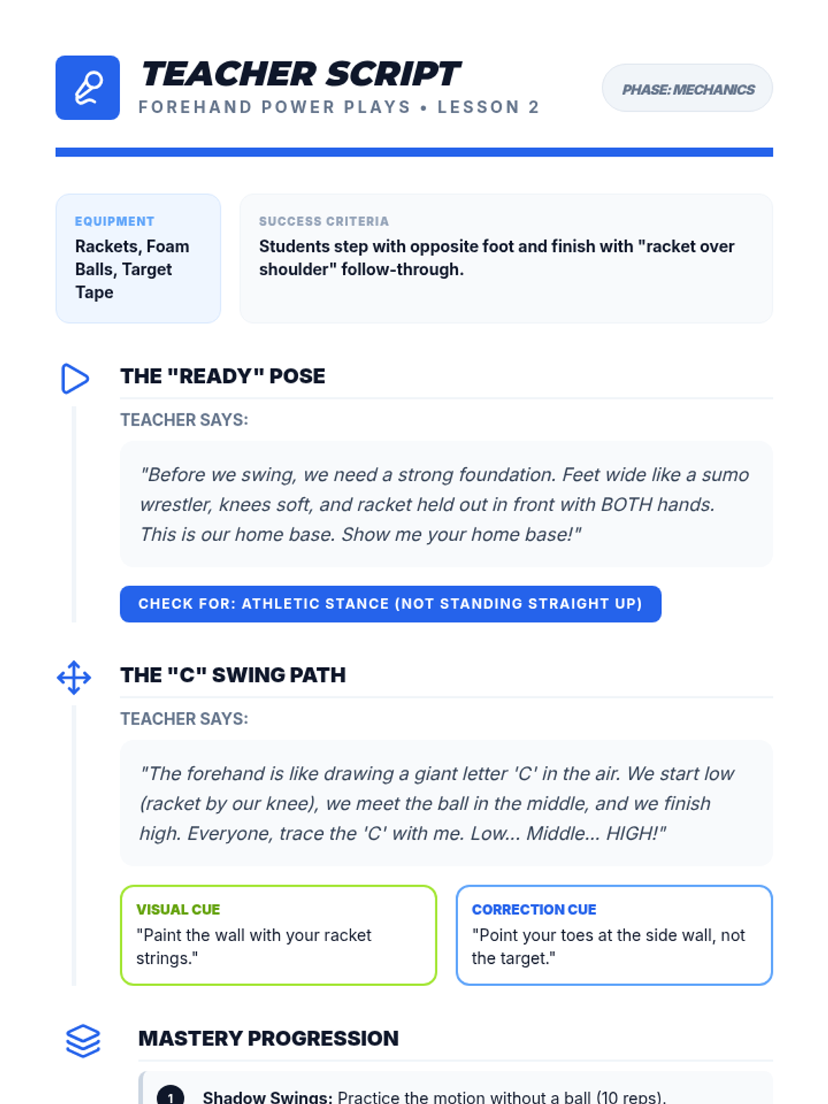This sequence introduces 4th grade students to the essential physical foundations of racket sports, focusing on grip, wrist control, and arm mechanics. It progresses from basic handling with balloons to dynamic forehand and backhand strikes, culminating in serving and rallying.